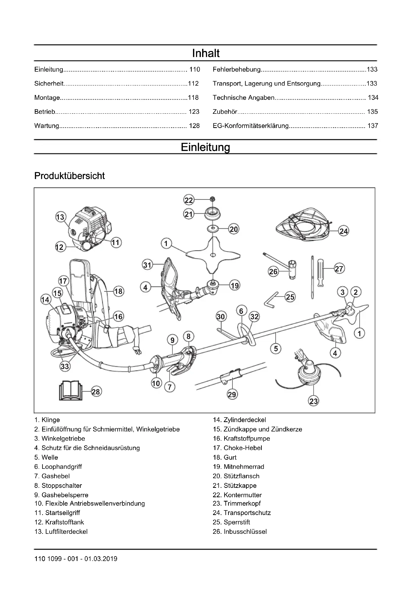 - Bei längerer Aufbewahrung des Produkts müssen Sie den Kraftstofftank entleeren. An der nächsten Tankstelle erfahren Sie, wie Sie überschüssigen Kraftstoff am besten entsorgen. Entleeren Sie den Tank in einen geeigneten Behälter und an einem gut durchlüfteten Ort. 1099 - 001 - 01.03.2019 133• Stellen Sie vor der Langzeitaufbewahrung sicher, dass das Produkt gründlich gesäubert und komplett gewartet wurde.