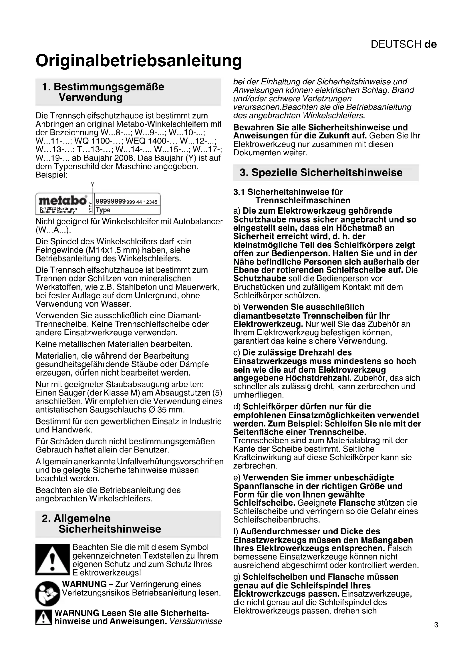 - -; W - ab Baujahr 2008. Das Baujahr (Y) ist auf dem Typenschild der Maschine angegeben. Beispiel: Nicht geeignet für Winkelschleifer mit Autobalancer (W A ). Die Spindel des Winkelschleifers darf kein Feingewinde (M14x1,5 mm) haben, siehe Betriebsanleitung des Winkelschleifers. Die Trennschleifschutzhaube ist bestimmt zum Trennen oder Schlitzen von mineralischen Werkstoffen, wie z.B. Stahlbeton und Mauerwerk, bei fester Auflage auf dem Untergrund, ohne Verwendung von Wasser. Verwenden Sie ausschließlich eine Diamant- Trennscheibe. Keine Trennschleifscheibe oder andere Einsatzwerkzeuge verwenden. Keine metallischen Materialien bearbeiten. Materialien, die während der Bearbeitung gesundheitsgefährdende Stäube oder Dämpfe erzeugen, dürfen nicht bearbeitet werden. Nur mit geeigneter Staubabsaugung arbeiten: Einen Sauger (der Klasse M) am Absaugstutzen (5) anschließen. Wir empfehlen die Verwendung eines antistatischen Saugschlauchs Ø 35 mm. Bestimmt für den gewerblichen Einsatz in Industrie und Handwerk. Für Schäden durch nicht bestimmungsgemäßen Gebrauch haftet allein der Benutzer. Allgemein anerkannte Unfallverhütungsvorschriften und beigelegte Sicherheitshinweise müssen beachtet werden. Beachten sie die Betriebsanleitung des angebrachten Winkelschleifers. Beachten Sie die mit diesem Symbol gekennzeichneten Textstellen zu Ihrem eigenen Schutz und zum Schutz Ihres Elektrowerkzeugs! WARNUNG – Zur Verringerung eines Verletzungsrisikos Betriebsanleitung lesen. WARNUNG Lesen Sie alle Sicherheits- hinweise und Anweisungen. Versäumnisse bei der Einhaltung der Sicherheitshinweise und Anweisungen können elektrischen Schlag, Brand und/oder schwere Verletzungen verursachen.Beachten sie die Betriebsanleitung des angebrachten Winkelschleifers. Bewahren Sie alle Sicherheitshinweise und Anweisungen für die Zukunft auf. Geben Sie Ihr Elektrowerkzeug nur zusammen mit diesen Dokumenten weiter. p. 19