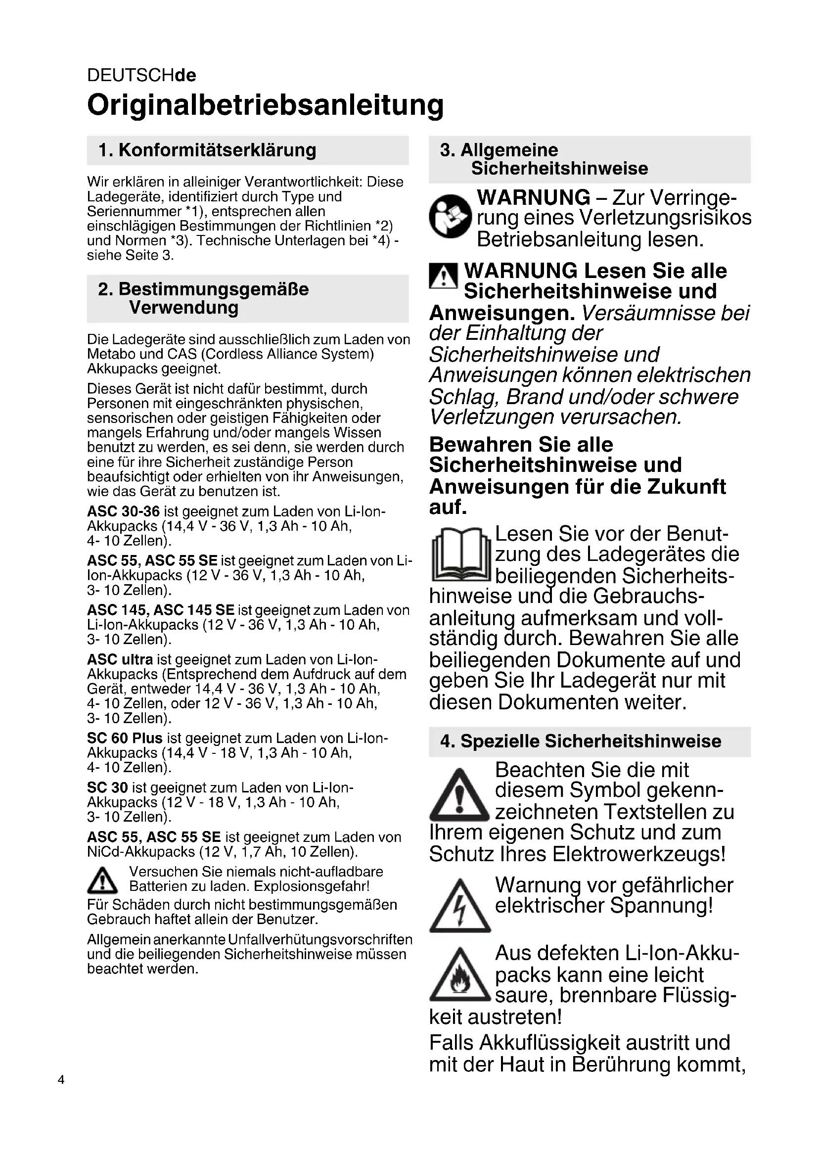 Originalbetriebsanleitung Wir erklären in alleiniger Verantwortlichkeit: Diese Ladegeräte, identifiziert durch Type und Seriennummer *1), entsprechen allen einschlägigen Bestimmungen der Richtlinien *2) und Normen *3). Technische Unterlagen bei *4) - siehe Seite 3. Die Ladegeräte sind ausschließlich zum Laden von Metabo und CAS (Cordless Alliance System) Akkupacks geeignet. Dieses Gerät ist nicht dafür bestimmt, durch Personen mit eingeschränkten physischen, sensorischen oder geistigen Fähigkeiten oder mangels Erfahrung und/oder mangels Wissen benutzt zu werden, es sei denn, sie werden durch eine für ihre Sicherheit zuständige Person beaufsichtigt oder erhielten von ihr Anweisungen, wie das Gerät zu benutzen ist. ASC 30-36 ist geeignet zum Laden von Li-Ion- Akkupacks (14,4 V - 36 V, 1,3 Ah - 10 Ah,