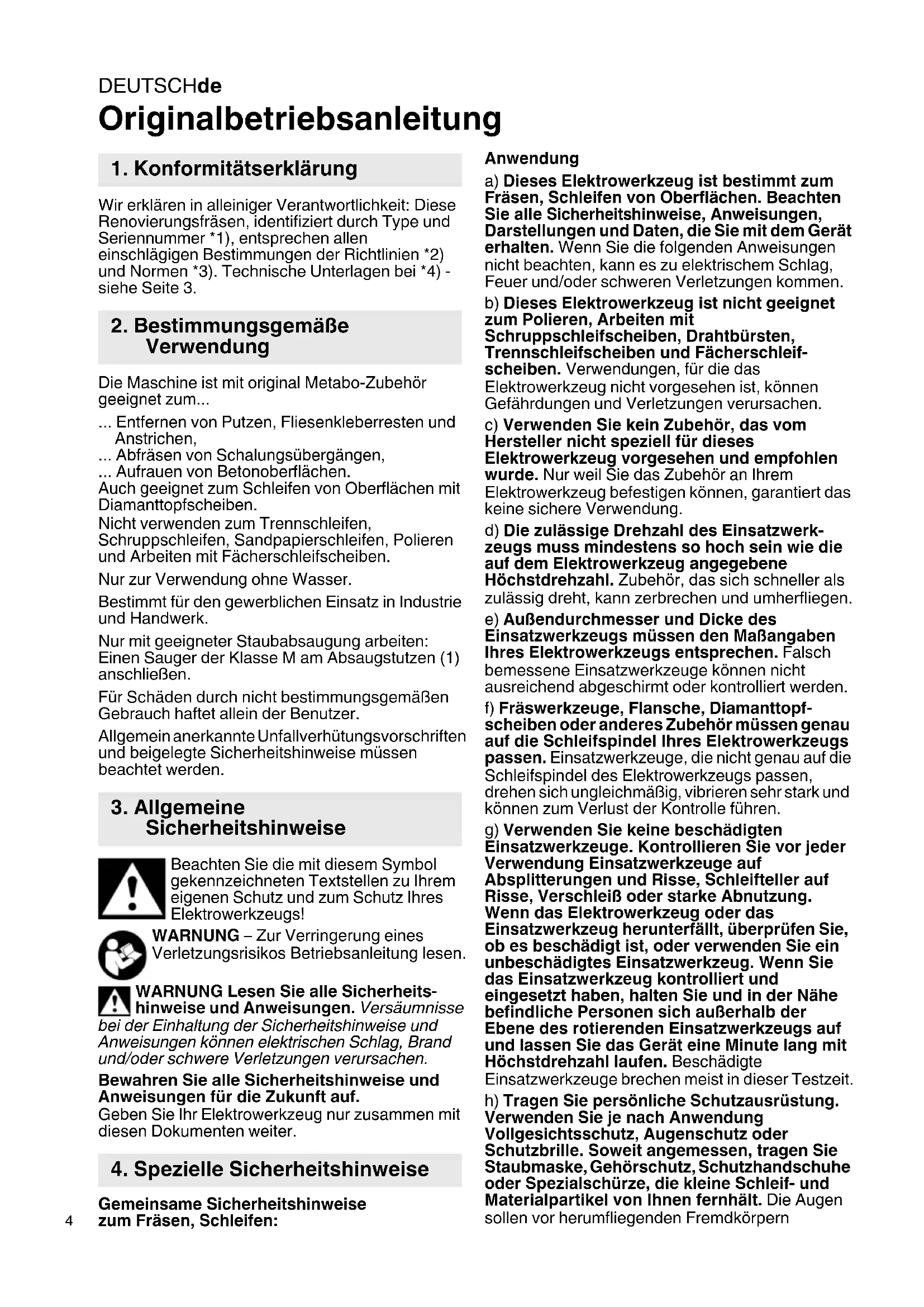 Originalbetriebsanleitung Wir erklären in alleiniger Verantwortlichkeit: Diese Renovierungsfräsen, identifiziert durch Type und Seriennummer *1), entsprechen allen einschlägigen Bestimmungen der Richtlinien *2) und Normen *3). Technische Unterlagen bei *4) - siehe Seite 3. Die Maschine ist mit original Metabo-Zubehör geeignet zum... ... Entfernen von Putzen, Fliesenkleberresten und Anstrichen, ... Abfräsen von Schalungsübergängen, ... Aufrauen von Betonoberflächen. Auch geeignet zum Schleifen von Oberflächen mit Diamanttopfscheiben. Nicht verwenden zum Trennschleifen, Schruppschleifen, Sandpapierschleifen, Polieren und Arbeiten mit Fächerschleifscheiben. Nur zur Verwendung ohne Wasser. Bestimmt für den gewerblichen Einsatz in Industrie und Handwerk. Nur mit geeigneter Staubabsaugung arbeiten: Einen Sauger der Klasse M am Absaugstutzen (1) anschließen. Für Schäden durch nicht bestimmungsgemäßen Gebrauch haftet allein der Benutzer. Allgemein anerkannte Unfallverhütungsvorschriften und beigelegte Sicherheitshinweise müssen beachtet werden. Beachten Sie die mit diesem Symbol gekennzeichneten Textstellen zu Ihrem eigenen Schutz und zum Schutz Ihres Elektrowerkzeugs! WARNUNG – Zur Verringerung eines Verletzungsrisikos Betriebsanleitung lesen. WARNUNG Lesen Sie alle Sicherheits- hinweise und Anweisungen. Versäumnisse bei der Einhaltung der Sicherheitshinweise und Anweisungen können elektrischen Schlag, Brand und/oder schwere Verletzungen verursachen. Bewahren Sie alle Sicherheitshinweise und Anweisungen für die Zukunft auf. Geben Sie Ihr Elektrowerkzeug nur zusammen mit diesen Dokumenten weiter. Gemeinsame Sicherheitshinweise zum Fräsen, Schleifen: Anwendung a) Dieses Elektrowerkzeug ist bestimmt zum Fräsen, Schleifen von Oberflächen. Beachten Sie alle Sicherheits hinweise, Anweisungen, Darstellungen und Daten, die Sie mit dem Gerät erhalten. Wenn Sie die folgenden Anweisungen nicht beachten, kann es zu elektrischem Schlag, Feuer und/oder schweren Verletzungen kommen. b) Dieses Elektrowerkzeug ist nicht geeignet zum Polieren, Arbeiten mit Schruppschleifscheiben, Drahtbürsten, Trennschleifscheiben und Fächerschleif- scheiben. Verwendungen, für die das Elektrowerkzeug nicht vorgesehen ist, können Gefährdungen und Verletzungen verursachen. c) Verwenden Sie kein Zubehör, das vom Hersteller nicht speziell für dieses Elektrowerkzeug vorgesehen und empfohlen wurde. Nur weil Sie das Zubehör an Ihrem Elektrowerkzeug befestigen können, garantiert das keine sichere Verwendung. d) Die zulässige Drehzahl des Einsatzwerk- zeugs muss mindestens so hoch sein wie die auf dem Elektrowerkzeug angegebene Höchstdrehzahl. Zubehör, das sich schneller als zulässig dreht, kann zerbrechen und umherfliegen. e) Außendurchmesser und Dicke des Einsatzwerkzeugs müssen den Maßangaben lhres Elektrowerkzeugs entsprechen. Falsch bemessene Einsatzwerkzeuge können nicht ausreichend abgeschirmt oder kontrolliert werden. f) Fräswerkzeuge, Flansche, Diamanttopf- scheiben oder anderes Zubehör müssen genau auf die Schleifspindel Ihres Elektrowerkzeugs passen. Einsatzwerkzeuge, die nicht genau auf die Schleifspindel des Elektrowerkzeugs passen, drehen sich ungleichmäßig, vibrieren sehr stark und können zum Verlust der Kontrolle führen. g) Verwenden Sie keine beschädigten Einsatzwerkzeuge. Kontrollieren Sie vor jeder Verwendung Einsatzwerkzeuge auf Absplitterungen und Risse, Schleifteller auf Risse, Verschleiß oder starke Abnutzung. Wenn das Elektrowerkzeug oder das Einsatzwerkzeug herunterfällt, überprüfen Sie, ob es beschädigt ist, oder verwenden Sie ein unbeschädigtes Einsatzwerkzeug. Wenn Sie das Einsatzwerkzeug kontrolliert und eingesetzt haben, halten Sie und in der Nähe befindliche Personen sich außerhalb der Ebene des rotierenden Einsatzwerkzeugs auf und lassen Sie das Gerät eine Minute lang mit Höchstdrehzahl laufen. Beschädigte Einsatzwerkzeuge brechen meist in dieser Testzeit. h) Tragen Sie persönliche Schutzausrüstung. Verwenden Sie je nach Anwendung Vollgesichtsschutz, Augenschutz oder Schutzbrille. Soweit angemessen, tragen Sie Staubmaske, Gehörschutz, Schutzhandschuhe oder Spezialschürze, die kleine Schleif- und Materialpartikel von Ihnen fernhält. Die Augen sollen vor herumfliegenden Fremdkörpern