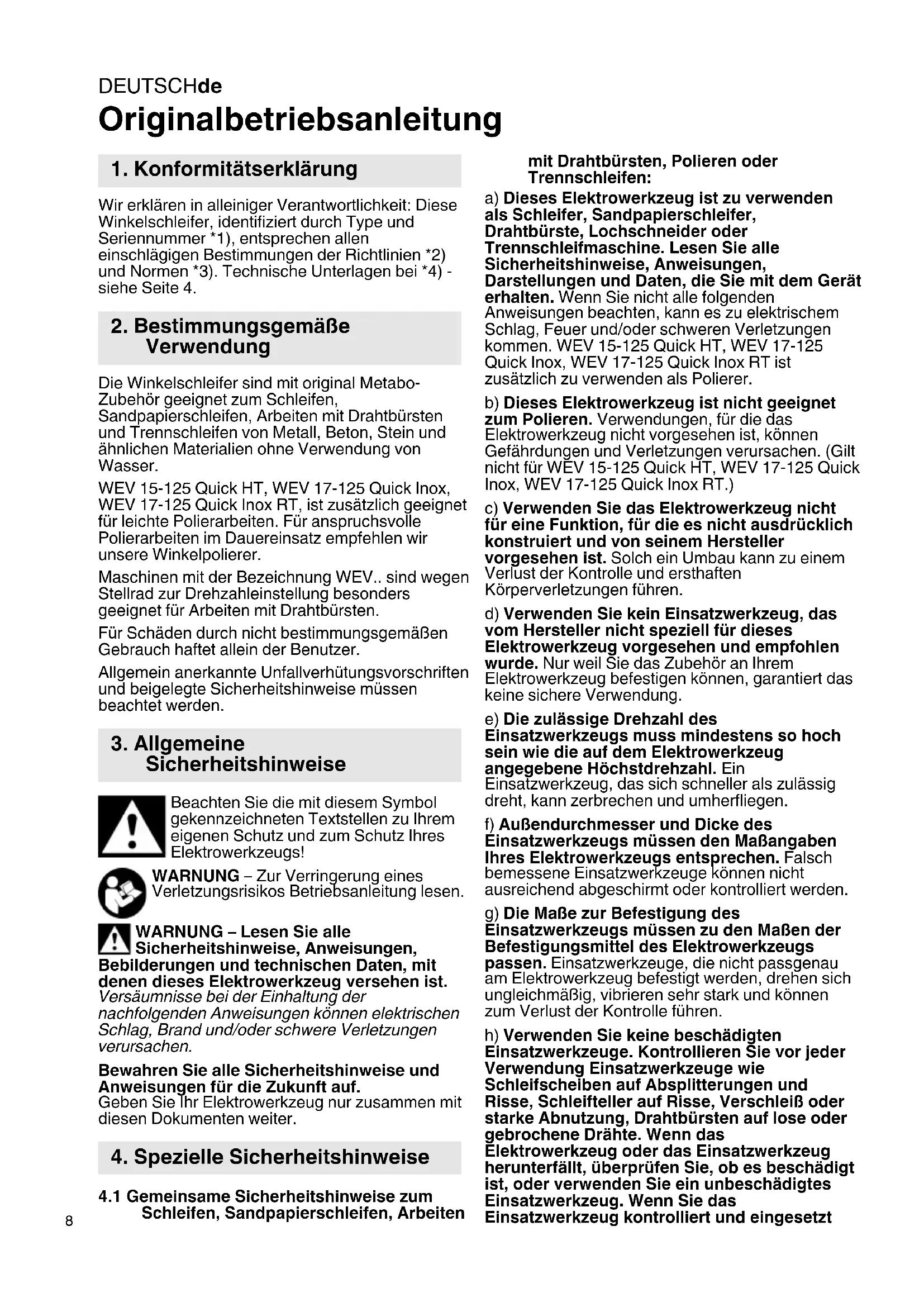 Originalbetriebsanleitung Wir erklären in alleiniger Verantwortlichkeit: Diese Winkelschleifer, identifiziert durch Type und Seriennummer *1), entsprechen allen einschlägigen Bestimmungen der Richtlinien *2) und Normen *3). Technische Unterlagen bei *4) - siehe Seite 4. Die Winkelschleifer sind mit original Metabo- Zubehör geeignet zum Schleifen, Sandpapierschleifen, Arbeiten mit Drahtbürsten und Trennschleifen von Metall, Beton, Stein und ähnlichen Materialien ohne Verwendung von Wasser. WEV 15-125 Quick HT, WEV 17-125 Quick Inox, WEV 17-125 Quick Inox RT, ist zusätzlich geeignet für leichte Polierarbeiten. Für anspruchsvolle Polierarbeiten im Dauereinsatz empfehlen wir unsere Winkelpolierer. Maschinen mit der Bezeichnung WEV.. sind wegen Stellrad zur Drehzahleinstellung besonders geeignet für Arbeiten mit Drahtbürsten. Für Schäden durch nicht bestimmungsgemäßen Gebrauch haftet allein der Benutzer. Allgemein anerkannte Unfallverhütungsvorschriften und beigelegte Sicherheitshinweise müssen beachtet werden. Beachten Sie die mit diesem Symbol gekennzeichneten Textstellen zu Ihrem eigenen Schutz und zum Schutz Ihres Elektrowerkzeugs! WARNUNG – Zur Verringerung eines Verletzungsrisikos Betriebsanleitung lesen. WARNUNG – Lesen Sie alle Sicherheitshinweise, Anweisungen, Bebilderungen und technischen Daten, mit denen dieses Elektrowerkzeug versehen ist. Versäumnisse bei der Einhaltung der nachfolgenden Anweisungen können elektrischen Schlag, Brand und/oder schwere Verletzungen verursachen. Bewahren Sie alle Sicherheitshinweise und Anweisungen für die Zukunft auf. Geben Sie Ihr Elektrowerkzeug nur zusammen mit diesen Dokumenten weiter.