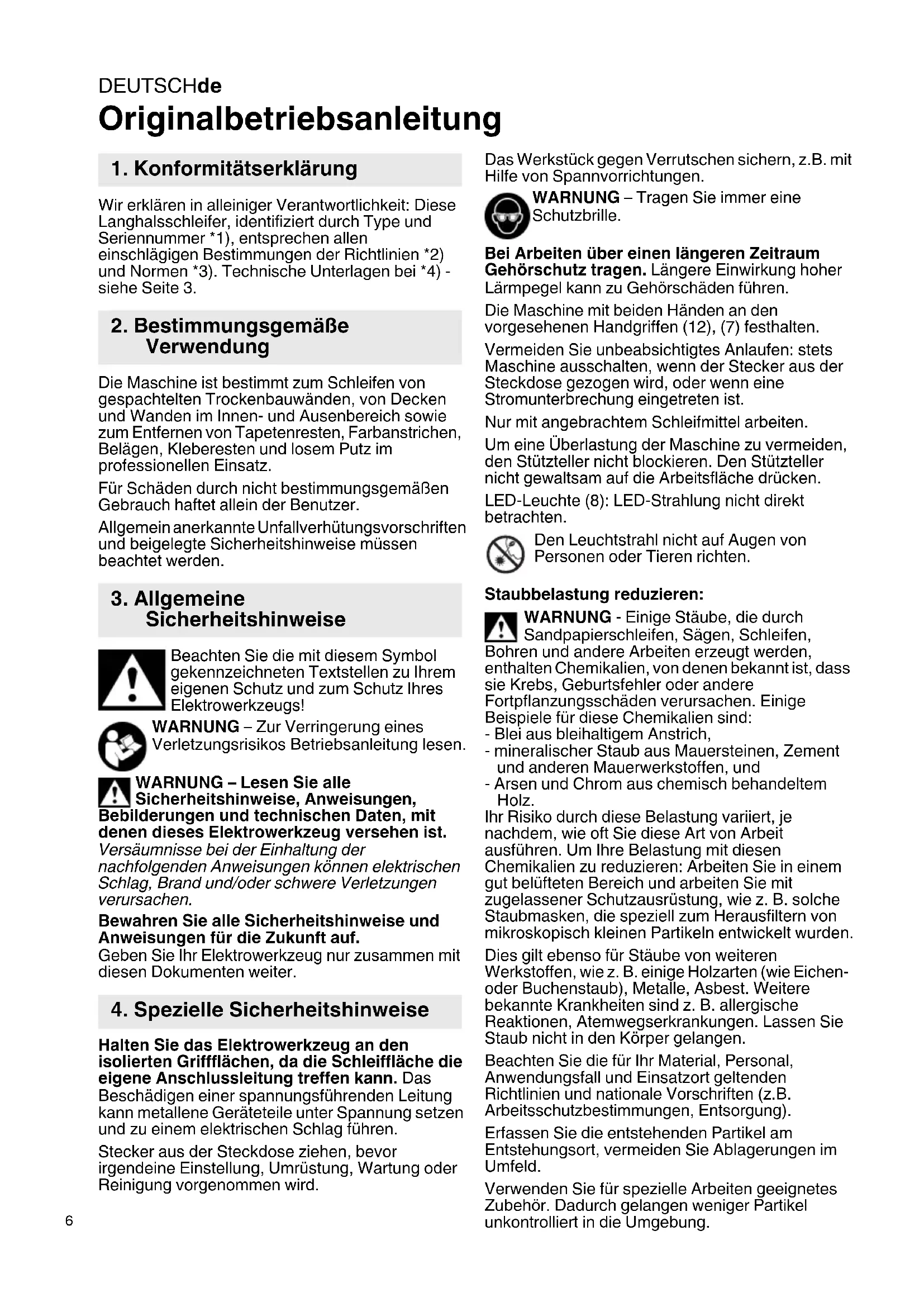 Originalbetriebsanleitung Wir erklären in alleiniger Verantwortlichkeit: Diese Langhalsschleifer, identifiziert durch Type und Seriennummer *1), entsprechen allen einschlägigen Bestimmungen der Richtlinien *2) und Normen *3). Technische Unterlagen bei *4) - siehe Seite 3. Die Maschine ist bestimmt zum Schleifen von gespachtelten Trockenbauwänden, von Decken und Wanden im Innen- und Ausenbereich sowie zum Entfernen von Tapetenresten, Farbanstrichen, Belägen, Kleberesten und losem Putz im professionellen Einsatz. Für Schäden durch nicht bestimmungsgemäßen Gebrauch haftet allein der Benutzer. Allgemein anerkannte Unfallverhütungsvorschriften und beigelegte Sicherheitshinweise müssen beachtet werden. Beachten Sie die mit diesem Symbol gekennzeichneten Textstellen zu Ihrem eigenen Schutz und zum Schutz Ihres Elektrowerkzeugs! WARNUNG – Zur Verringerung eines Verletzungsrisikos Betriebsanleitung lesen. WARNUNG – Lesen Sie alle Sicherheitshinweise, Anweisungen, Bebilderungen und technischen Daten, mit denen dieses Elektrowerkzeug versehen ist. Versäumnisse bei der Einhaltung der nachfolgenden Anweisungen können elektrischen Schlag, Brand und/oder schwere Verletzungen verursachen. Bewahren Sie alle Sicherheitshinweise und Anweisungen für die Zukunft auf. Geben Sie Ihr Elektrowerkzeug nur zusammen mit diesen Dokumenten weiter. Halten Sie das Elektrowerkzeug an den isolierten Griffflächen, da die Schleiffläche die eigene Anschlussleitung treffen kann. Das Beschädigen einer spannungsführenden Leitung kann metallene Geräteteile unter Spannung setzen und zu einem elektrischen Schlag führen. Stecker aus der Steckdose ziehen, bevor irgendeine Einstellung, Umrüstung, Wartung oder Reinigung vorgenommen wird. Das Werkstück gegen Verrutschen sichern, z.B. mit Hilfe von Spannvorrichtungen. WARNUNG – Tragen Sie immer eine Schutzbrille. Bei Arbeiten über einen längeren Zeitraum Gehörschutz tragen. Längere Einwirkung hoher Lärmpegel kann zu Gehörschäden führen. Die Maschine mit beiden Händen an den vorgesehenen Handgriffen (12), (7) festhalten. Vermeiden Sie unbeabsichtigtes Anlaufen: stets Maschine ausschalten, wenn der Stecker aus der Steckdose gezogen wird, oder wenn eine Stromunterbrechung eingetreten ist. Nur mit angebrachtem Schleifmittel arbeiten. Um eine Überlastung der Maschine zu vermeiden, den Stützteller nicht blockieren. Den Stützteller nicht gewaltsam auf die Arbeitsfläche drücken. LED-Leuchte (8): LED-Strahlung nicht direkt betrachten. Den Leuchtstrahl nicht auf Augen von Personen oder Tieren richten. Staubbelastung reduzieren: WARNUNG - Einige Stäube, die durch Sandpapierschleifen, Sägen, Schleifen, Bohren und andere Arbeiten erzeugt werden, enthalten Chemikalien, von denen bekannt ist, dass sie Krebs, Geburtsfehler oder andere Fortpflanzungsschäden verursachen. Einige Beispiele für diese Chemikalien sind: - Blei aus bleihaltigem Anstrich, - mineralischer Staub aus Mauersteinen, Zement und anderen Mauerwerkstoffen, und - Arsen und Chrom aus chemisch behandeltem Holz. Ihr Risiko durch diese Belastung variiert, je nachdem, wie oft Sie diese Art von Arbeit ausführen. Um Ihre Belastung mit diesen Chemikalien zu reduzieren: Arbeiten Sie in einem gut belüfteten Bereich und arbeiten Sie mit zugelassener Schutzausrüstung, wie z. B. solche Staubmasken, die speziell zum Herausfiltern von mikroskopisch kleinen Partikeln entwickelt wurden. Dies gilt ebenso für Stäube von weiteren Werkstoffen, wie z. B. einige Holzarten (wie Eichen- oder Buchenstaub), Metalle, Asbest. Weitere bekannte Krankheiten sind z. B. allergische Reaktionen, Atemwegserkrankungen. Lassen Sie Staub nicht in den Körper gelangen. Beachten Sie die für Ihr Material, Personal, Anwendungsfall und Einsatzort geltenden Richtlinien und nationale Vorschriften (z.B. Arbeitsschutzbestimmungen, Entsorgung). Erfassen Sie die entstehenden Partikel am Entstehungsort, vermeiden Sie Ablagerungen im Umfeld. Verwenden Sie für spezielle Arbeiten geeignetes Zubehör. Dadurch gelangen weniger Partikel unkontrolliert in die Umgebung.
