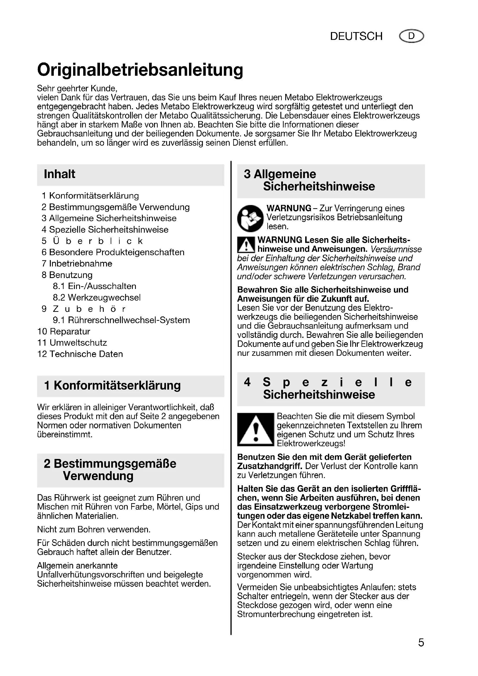10 Reparatur 11 Umweltschutz 12 Technische Daten Wir erklären in alleiniger Verantwortlichkeit, daß dieses Produkt mit den auf Seite 2 angegebenen Normen oder normativen Dokumenten übereinstimmt. Das Rührwerk ist geeignet zum Rühren und Mischen mit Rühren von Farbe, Mörtel, Gips und ähnlichen Materialien. Nicht zum Bohren verwenden. Für Schäden durch nicht bestimmungsgemäßen Gebrauch haftet allein der Benutzer. Allgemein anerkannte Unfallverhütungsvorschriften und beigelegte Sicherheitshinweise müssen beachtet werden. WARNUNG – Zur Verringerung eines Verletzungsrisikos Betriebsanleitung lesen. WARNUNG Lesen Sie alle Sicherheits- hinweise und Anweisungen. Versäumnisse bei der Einhaltung der Sicherheitshinweise und Anweisungen können elektrischen Schlag, Brand und/oder schwere Verletzungen verursachen. Bewahren Sie alle Sicherheitshinweise und Anweisungen für die Zukunft auf. Lesen Sie vor der Benutzung des Elektro- werkzeugs die beiliegenden Sicherheitshinweise und die Gebrauchsanleitung aufmerksam und vollständig durch. Bewahren Sie alle beiliegenden Dokumente auf und geben Sie Ihr Elektrowerkzeug nur zusammen mit diesen Dokumenten weiter. Beachten Sie die mit diesem Symbol gekennzeichneten Textstellen zu Ihrem eigenen Schutz und um Schutz Ihres Elektrowerkzeugs! Benutzen Sie den mit dem Gerät gelieferten Zusatzhandgriff. Der Verlust der Kontrolle kann zu Verletzungen führen. Halten Sie das Gerät an den isolierten Griffflä- chen, wenn Sie Arbeiten ausführen, bei denen das Einsatzwerkzeug verborgene Stromlei- tungen oder das eigene Netzkabel treffen kann. Der Kontakt mit einer spannungsführenden Leitung kann auch metallene Geräteteile unter Spannung setzen und zu einem elektrischen Schlag führen. Stecker aus der Steckdose ziehen, bevor irgendeine Einstellung oder Wartung vorgenommen wird. Vermeiden Sie unbeabsichtigtes Anlaufen: stets Schalter entriegeln, wenn der Stecker aus der Steckdose gezogen wird, oder wenn eine Stromunterbrechung eingetreten ist. Originalbetriebsanleitung Sehr geehrter Kunde, vielen Dank für das Vertrauen, das Sie uns beim Kauf Ihres neuen Metabo Elektrowerkzeugs entgegengebracht haben. Jedes Metabo Elektrowerkzeug wird sorgfältig getestet und unterliegt den strengen Qualitätskontrollen der Metabo Qualitätssicherung. Die Lebensdauer eines Elektrowerkzeugs hängt aber in starkem Maße von Ihnen ab. Beachten Sie bitte die Informationen dieser Gebrauchsanleitung und der beiliegenden Dokumente. Je sorgsamer Sie Ihr Metabo Elektrowerkzeug behandeln, um so länger wird es zuverlässig seinen Dienst erfüllen. Inhalt 1 Konformitätserklärung 2 Bestimmungsgemäße Verwendung 3 Allgemeine Sicherheitshinweise 4Spezielle Sicherheitshinweise 17026753_0513 RWE 1100.book Seite 5 Dienstag, 7. Mai 2013 10:49 106 DEUTSCH
