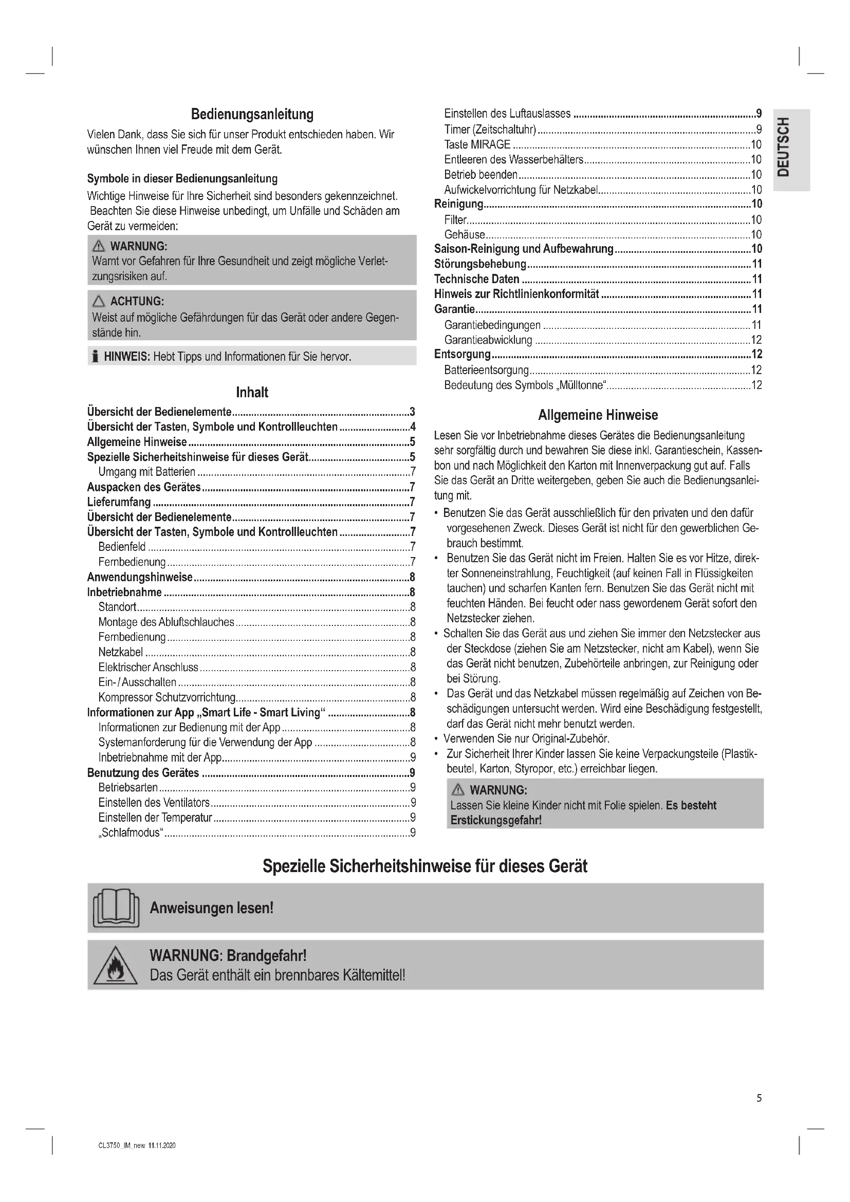 - Zur Sicherheit Ihrer Kinder lassen Sie keine Verpackungsteile (Plastik- beutel, Karton, Styropor, etc.) erreichbar liegen. WARNUNG: Lassen Sie kleine Kinder nicht mit Folie spielen. Es besteht Erstickungsgefahr! Spezielle Sicherheitshinweise für dieses Gerät Anweisungen lesen! WARNUNG: Brandgefahr! Das Gerät enthält ein brennbares Kältemittel!6 CL3750_IM_new 11.11.2020 Die Service-Anleitung ist unter der folgenden Internetadresse verfügbar: www.sli24.de Im Bereich „Downloads“ geben Sie bitte die Modell-Bezeichnung CL 3750 ein.