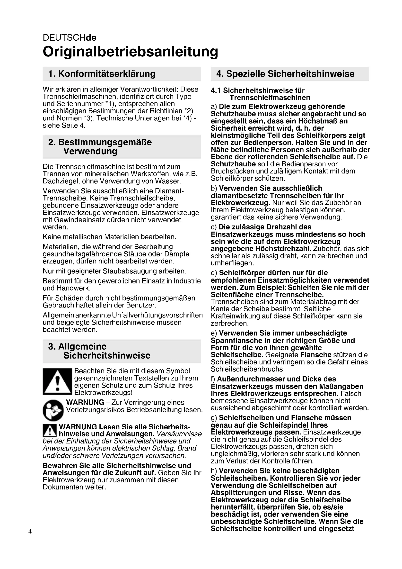 Originalbetriebsanleitung Wir erklären in alleiniger Verantwortlichkeit: Diese Trennschleifmaschinen, identifiziert durch Type und Seriennummer *1), entsprechen allen einschlägigen Bestimmungen der Richtlinien *2) und Normen *3). Technische Unterlagen bei *4) - siehe Seite 4. Die Trennschleifmaschine ist bestimmt zum Trennen von mineralischen Werkstoffen, wie z.B. Dachziegel, ohne Verwendung von Wasser. Verwenden Sie ausschließlich eine Diamant- Trennscheibe. Keine Trennschleifscheibe, gebundene Einsatzwerkzeuge oder andere Einsatzwerkzeuge verwenden. Einsatzwerkzeuge mit Gewindeeinsatz dürden nicht verwendet werden. Keine metallischen Materialien bearbeiten. Materialien, die während der Bearbeitung gesundheitsgefährdende Stäube oder Dämpfe erzeugen, dürfen nicht bearbeitet werden. Nur mit geeigneter Staubabsaugung arbeiten. Bestimmt für den gewerblichen Einsatz in Industrie und Handwerk. Für Schäden durch nicht bestimmungsgemäßen Gebrauch haftet allein der Benutzer. Allgemein anerkannte Unfallverhütungsvorschriften und beigelegte Sicherheitshinweise müssen beachtet werden. Beachten Sie die mit diesem Symbol gekennzeichneten Textstellen zu Ihrem eigenen Schutz und zum Schutz Ihres Elektrowerkzeugs! WARNUNG – Zur Verringerung eines Verletzungsrisikos Betriebsanleitung lesen. WARNUNG Lesen Sie alle Sicherheits- hinweise und Anweisungen. Versäumnisse bei der Einhaltung der Sicherheitshinweise und Anweisungen können elektrischen Schlag, Brand und/oder schwere Verletzungen verursachen. Bewahren Sie alle Sicherheitshinweise und Anweisungen für die Zukunft auf. Geben Sie Ihr Elektrowerkzeug nur zusammen mit diesen Dokumenten weiter.