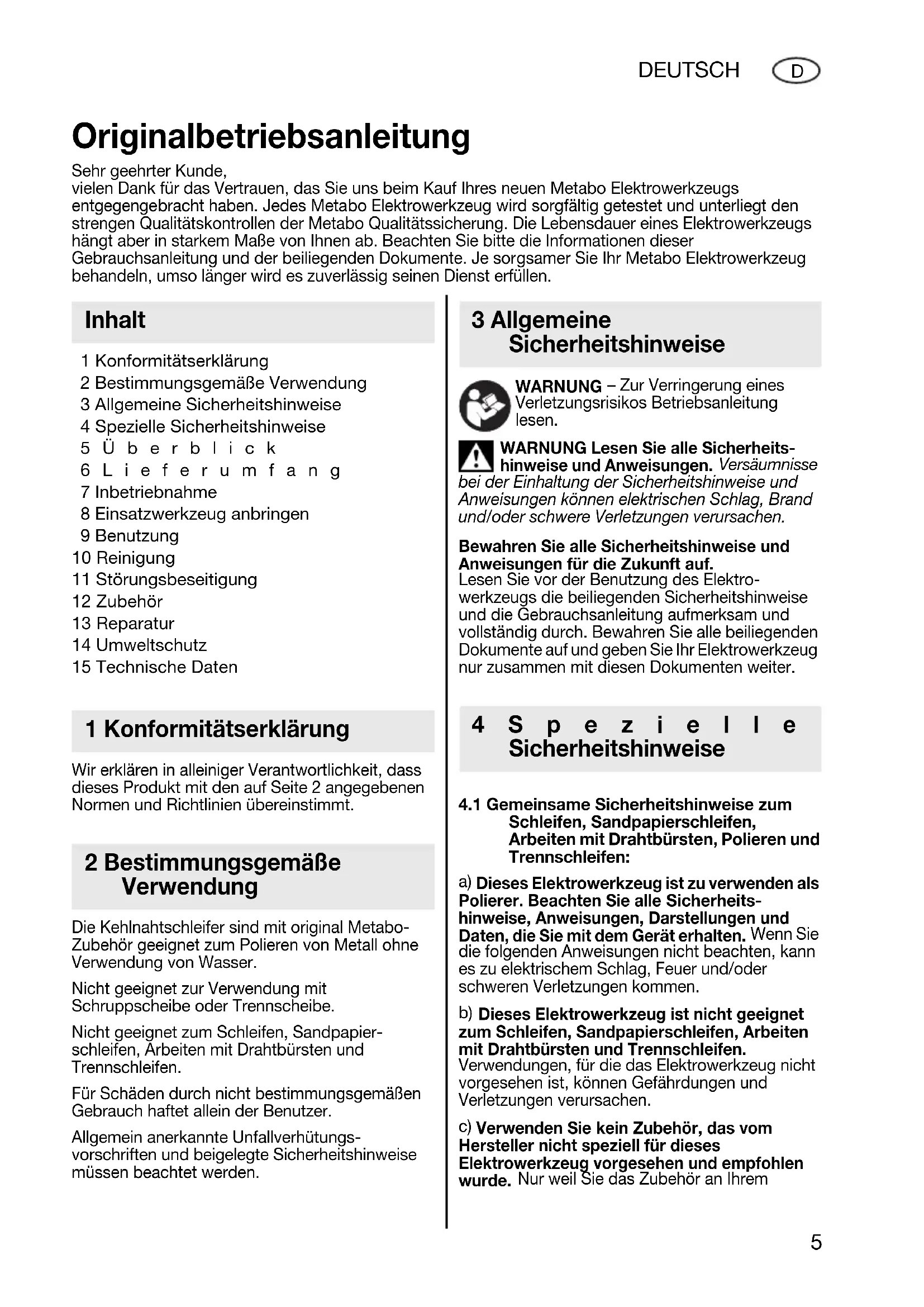 1 Konformitätserklärung 2 Bestimmungsgemäße Verwendung 3 Allgemeine Sicherheitshinweise 4 Spezielle Sicherheitshinweise 5Überblick 6Lieferumfang 7 Inbetriebnahme 8 Einsatzwerkzeug anbringen 9 Benutzung 10 Reinigung 11 Störungsbeseitigung 12 Zubehör 13 Reparatur 14 Umweltschutz 15 Technische Daten Wir erklären in alleiniger Verantwortlichkeit, dass dieses Produkt mit den auf Seite 2 angegebenen Normen und Richtlinien übereinstimmt. Die Kehlnahtschleifer sind mit original Metabo- Zubehör geeignet zum Polieren von Metall ohne Verwendung von Wasser. Nicht geeignet zur Verwendung mit Schruppscheibe oder Trennscheibe. Nicht geeignet zum Schleifen, Sandpapier- schleifen, Arbeiten mit Drahtbürsten und Trennschleifen. Für Schäden durch nicht bestimmungsgemäßen Gebrauch haftet allein der Benutzer. Allgemein anerkannte Unfallverhütungs- vorschriften und beigelegte Sicherheitshinweise müssen beachtet werden. WARNUNG – Zur Verringerung eines Verletzungsrisikos Betriebsanleitung lesen. WARNUNG Lesen Sie alle Sicherheits- hinweise und Anweisungen. Versäumnisse bei der Einhaltung der Sicherheitshinweise und Anweisungen können elektrischen Schlag, Brand und/oder schwere Verletzungen verursachen. Bewahren Sie alle Sicherheitshinweise und Anweisungen für die Zukunft auf. Lesen Sie vor der Benutzung des Elektro- werkzeugs die beiliegenden Sicherheitshinweise und die Gebrauchsanleitung aufmerksam und vollständig durch. Bewahren Sie alle beiliegenden Dokumente auf und geben Sie Ihr Elektrowerkzeug nur zusammen mit diesen Dokumenten weiter.
