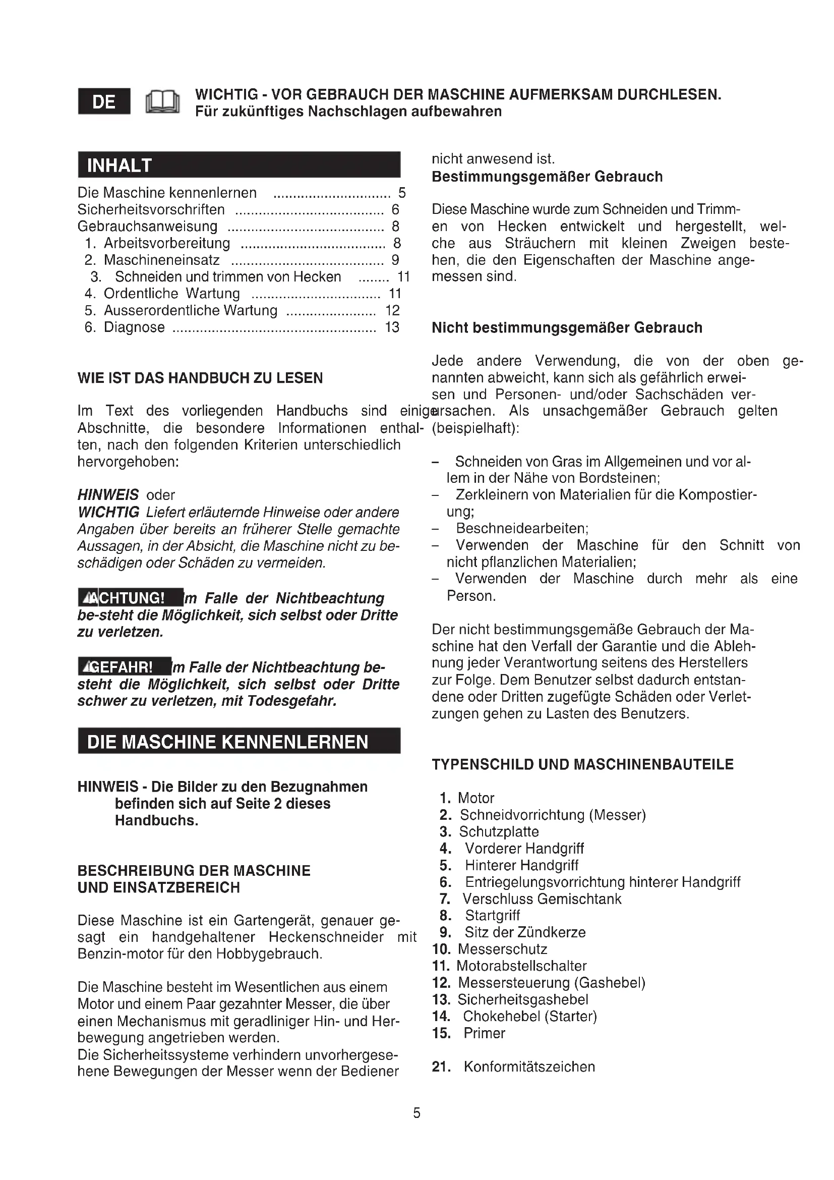 UND EINSATZBEREICH Diese Maschine ist ein Gartengerät, genauer ge- sagt ein handgehaltener Heckenschneider mit Benzin-motor für den Hobbygebrauch. Die Maschine besteht im Wesentlichen aus einem Motor und einem Paar gezahnter Messer, die über einen Mechanismus mit geradliniger Hin- und Her- bewegung angetrieben werden. Die Sicherheitssysteme verhindern unvorhergese- hene Bewegungen der Messer wenn der Bediener