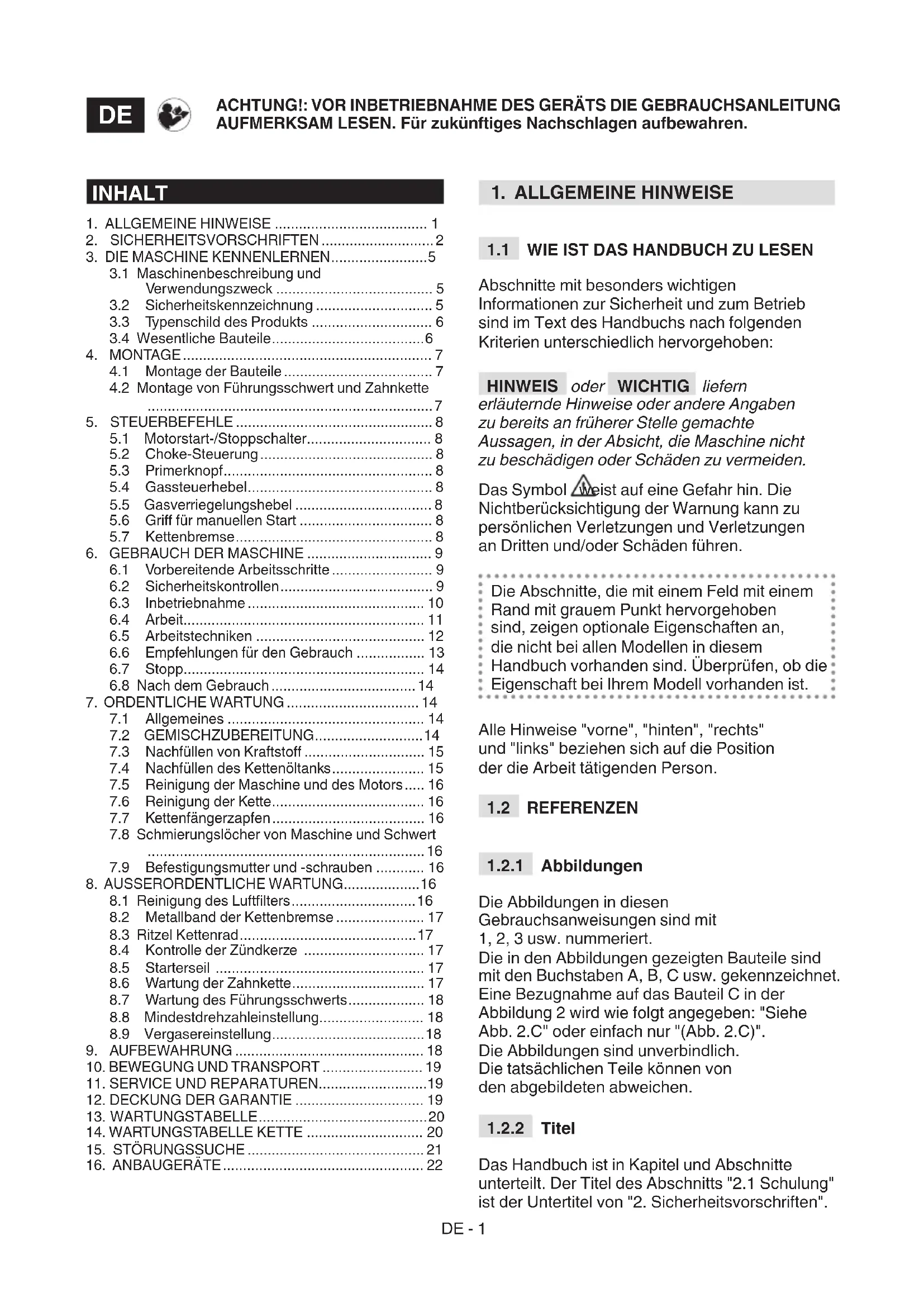 In der "Tabelle für die korrekte Kombination von Schwert und Kette" sind alle möglichen Kombinationen aus Schwert und Kette aufgelistet. Dabei werden die angegeben, die auf jeder Maschine verwendbar sind. Sie sind mit dem Symbol "" versehen. Die gleiche Tabelle liefert außerdem die typischen Daten der für jede Maschine zugelassenen Ketten und Schwerter. Beim Austausch nur Schwerter und Ketten verwenden, die in der Tabelle angegeben sind. Die Verwendung von nicht zulässigen Kombinationen kann schwere persönliche Schäden verursachen und die Maschine beschädigen. Da der Benutzer die Auswahl, Anbringung und Verwendung von Schwert und Kette vollkommen frei entscheidet, haftet er auch für daraus entstehende Schäden jeglicher Art, die aus diesen Entscheidungen entstehen. Im Falle von Zweifeln oder geringer Kenntnis der Besonderheit jedes Schwerts oder jeder Kette, muss der eigene Händler oder ein Fachgartenzentrum kontaktiert werden.EL - 1