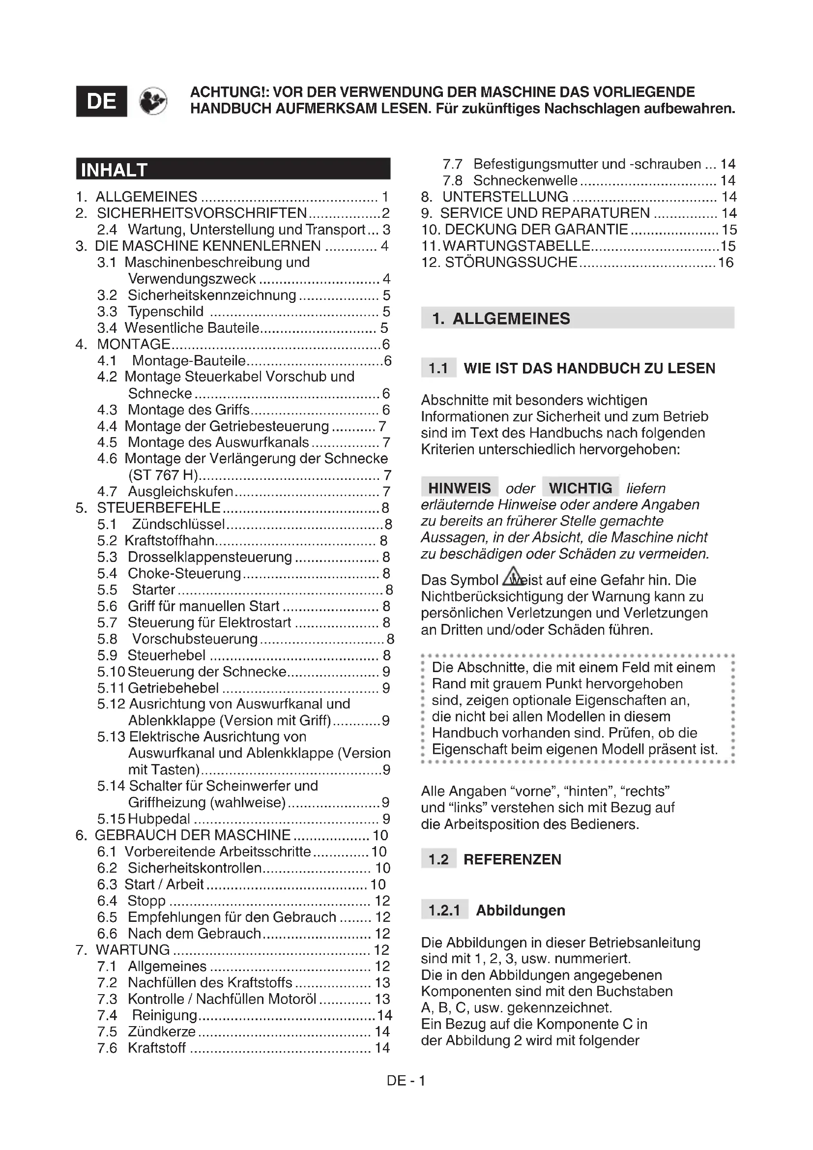 UND VERWENDUNGSZWECK Diese Maschine ist ein Schneeräumer. Die Maschine ist mit einer Schneeschnecke ausgestattet, die durch ein Gehäuse geschützt wird, das den Schnee in einen Auswurfkanal leitet. Die Schnecke wird vom Motor bewegt, der auch die Maschine antreibt. Die Maschine wird durch Befehle gesteuert, die sich auf dem Armaturenbrett benden. Der Maschinenbediener ist dazu in der Lage, die Maschine am Steuerplatz stehend von hinter der Maschine zu lenken und die Hauptbefehle auszulösen.