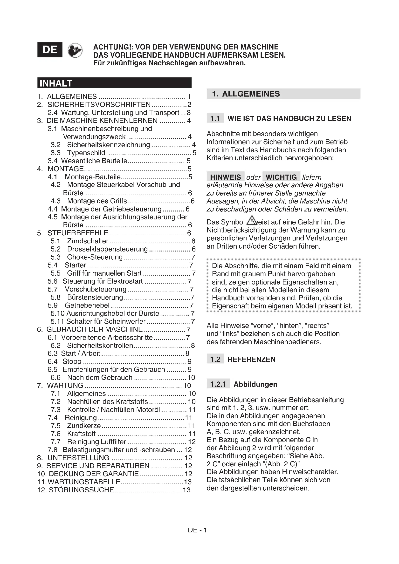 Diese Maschine wurde zum Kehren, zur Entfernung und Ausstoßung von Geröll auf Gehsteigen, Gärten, Zufahrten und anderen Flächen auf Bodenhöhe geplant und gebaut. Die Kehrmaschine muss ausschließlich für die Entfernung von Material wie Blättern, Schnee, Staub, Kies und kleinem Geröll verwendet werden.