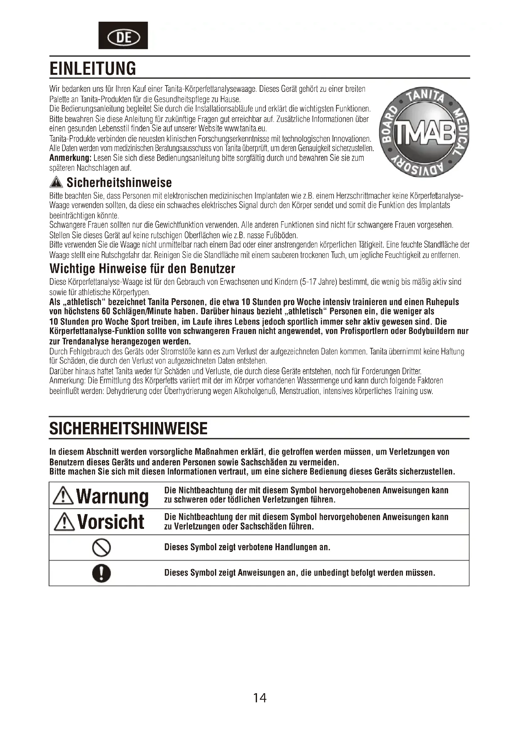 appears while measuring. Reading cannot be obtained if the weight capacity is exceeded. Specifications BC-601 / 602 / 613 Weight Capacity 150kg (330lb) (23st 8lb) Weight Increments 0.1kg (0.2lb) (0.2lb) Body Fat Increments 0.1% Personal Data 4 memories Power Supply 4 AA batteries (included) Power Consumption 150 mA maximum Measuring Current 50 kHz, 100 µA TROUBLESHOOTING Federal Communications Commission and Canadian ICES Notice This equipment has been tested and found to comply with the limits for a Class B digital device, pursuant to Part 15 of the FCC Rules and Canadian ICES-003. These limits are designed to provide reasonable protection against harmful interference in a residential installation. This equipment generates, uses and can radiate radio frequency energy and, if not installed and used in accordance with the instructions, may cause harmful interference to radio communications. However, there is no guarantee that interference will not occur in a particular installation. If this equipment does cause harmful interference to radio or television reception, which can be determined by turning the equipment off and on, the user is encouraged to try to correct the interference by one or more of the following measures: • Reorient or relocate the receiving antenna.• Increase the separation between the equipment and receiver.• Connect the equipment into an outlet on a circuit different from that to which the receiver is connected.• Consult the dealer or an experienced radio or television technician for help.Modifications The FCC requires the user to be notified that any changes or modifications made to this device that are not expressly approved by Tanita Corporation may void the user’s authority to operate the equipment.14 Wir bedanken uns für Ihren Kauf einer Tanita-Körperfettanalysewaage. Dieses Gerät gehört zu einer breiten Palette an Tanita-Produkten für die Gesundheitspflege zu Hause. Die Bedienungsanleitung begleitet Sie durch die Installationsabläufe und erklärt die wichtigsten Funktionen. Bitte bewahren Sie diese Anleitung für zukünftige Fragen gut erreichbar auf. Zusätzliche Informationen über einen gesunden Lebensstil finden Sie auf unserer Website www.tanita.eu. Tanita-Produkte verbinden die neuesten klinischen Forschungserkenntnisse mit technologischen Innovationen. Alle Daten werden vom medizinischen Beratungsausschuss von Tanita überprüft, um deren Genauigkeit sicherzustellen. Anmerkung: Lesen Sie sich diese Bedienungsanleitung bitte sorgfältig durch und bewahren Sie sie zum späteren Nachschlagen auf. Sicherheitshinweise Bitte beachten Sie, dass Personen mit elektronischen medizinischen Implantaten wie z.B. einem Herzschrittmacher keine Körperfettanalyse- Waage verwenden sollten, da diese ein schwaches elektrisches Signal durch den Körper sendet und somit die Funktion des Implantats beeinträchtigen könnte. Schwangere Frauen sollten nur die Gewichtfunktion verwenden. Alle anderen Funktionen sind nicht für schwangere Frauen vorgesehen. Stellen Sie dieses Gerät auf keine rutschigen Oberflächen wie z.B. nasse Fußböden. Bitte verwenden Sie die Waage nicht unmittelbar nach einem Bad oder einer anstrengenden körperlichen Tätigkeit. Eine feuchte Standfläche der Waage stellt eine Rutschgefahr dar. Reinigen Sie die Standfläche mit einem sauberen trockenen Tuch, um jegliche Feuchtigkeit zu entfernen. Wichtige Hinweise für den Benutzer Diese Körperfettanalyse-Waage ist für den Gebrauch von Erwachsenen und Kindern (5-17 Jahre) bestimmt, die wenig bis mäßig aktiv sind sowie für athletische Körpertypen. Als „athletisch“ bezeichnet Tanita Personen, die etwa 10 Stunden pro Woche intensiv trainieren und einen Ruhepuls von höchstens 60 Schlägen/Minute haben. Darüber hinaus bezieht „athletisch“ Personen ein, die weniger als 10 Stunden pro Woche Sport treiben, im Laufe ihres Lebens jedoch sportlich immer sehr aktiv gewesen sind. Die Körperfettanalyse-Funktion sollte von schwangeren Frauen nicht angewendet, von Profisportlern oder Bodybuildern nur zur Trendanalyse herangezogen werden. Durch Fehlgebrauch des Geräts oder Stromstöße kann es zum Verlust der aufge zeichneten Daten kommen. Tanita übernimmt keine Haftung für Schäden, die durch den Verlust von aufgezeichneten Daten entstehen. Darüber hinaus haftet Tanita weder für Schäden und Verluste, die durch diese Geräte entstehen, noch für Forderungen Dritter. Anmerkung: Die Ermittlung des Körperfetts variiert mit der im Körper vorhandenen Wassermenge und kann durch folgende Faktoren beeinflußt werden: Dehydrierung oder Überhydrierung wegen Alkoholgenuß, Menstruation, intensives körperliches Training usw. EINLEITUNG SICHERHEITSHINWEISE In diesem Abschnitt werden vorsorgliche Maßnahmen erklärt, die getroffen werden müssen, um Verletzungen von Benutzern dieses Geräts und anderen Personen sowie Sachschäden zu vermeiden. Bitte machen Sie sich mit diesen Informationen vertraut, um eine sichere Bedienung dieses Geräts sicherzustellen. Warnung Die Nichtbeachtung der mit diesem Symbol hervorgehobenen Anweisungen kann zu schweren oder tödlichen Verletzungen führen. Vorsicht Die Nichtbeachtung der mit diesem Symbol hervorgehobenen Anweisungen kann zu Verletzungen oder Sachschäden führen. Dieses Symbol zeigt verbotene Handlungen an. Dieses Symbol zeigt Anweisungen an, die unbedingt befolgt werden müssen.15 Warnung Verboten Diese Waage darf nicht bei Personen mit Schrittmachern oder anderen medizinischen Implantaten verwendet werden. Diese Waage sendet einen schwachen elektrischen Impuls durch den Körper, wodurch Störungen und Fehlfunktionen von elektrischen medizinischen Implantaten verursacht werden können, was zu Verletzungen des Anwenders führen kann. Die Auswertung von Messergebnissen (z.B. Bewertung von Messungen und Ausarbeitung von auf den Ergebnissen basierenden Trainingsprogrammen) muss von einer Fachkraft durchgeführt werden. Gewichtsreduzierende Maßnahmen 