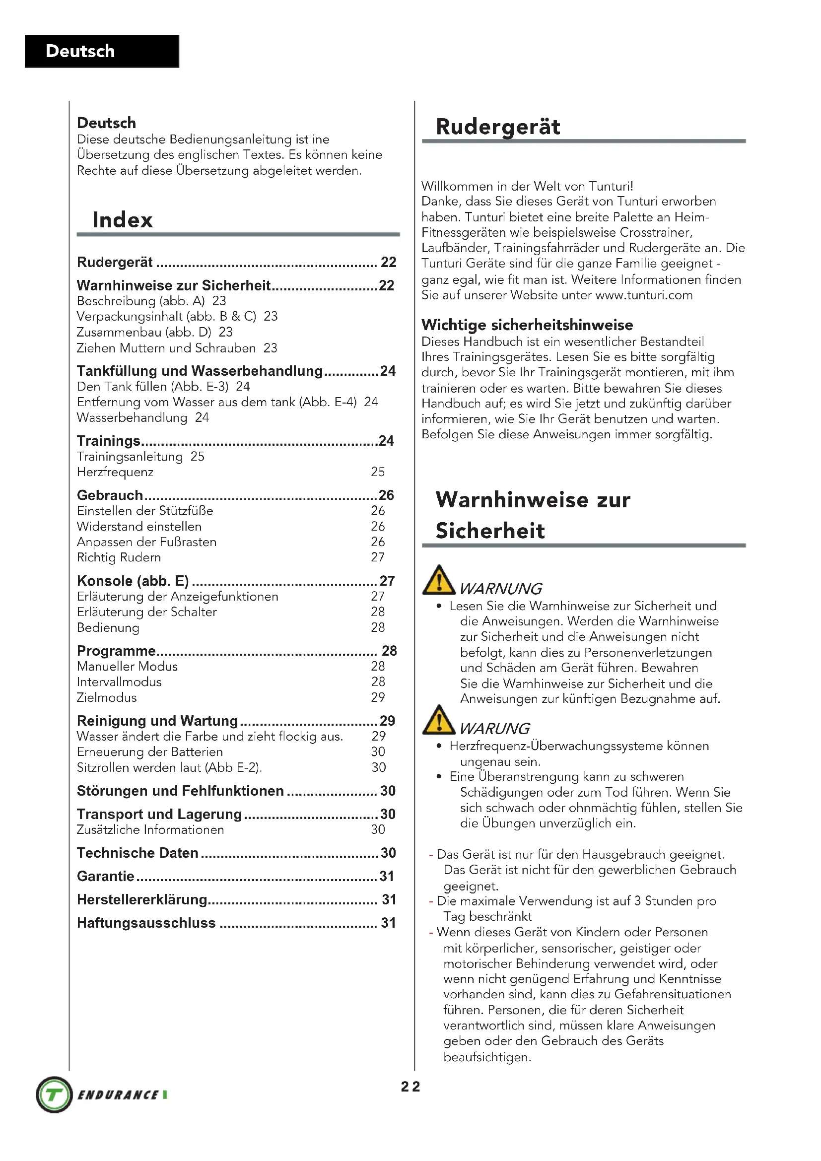 Battery size 2pcs AA Warranty Warranty terms The consumer is entitled to the applicable legal rights stated in the national legislation concerning the commerce of consumer goods. This warranty does not restrict these rights. The Purchaser’s Warranty is only valid if the item is used in an environment approved by Tunturi New Fitness BV for that particular equipment. The product-specific approved environment is stated in the Owner’s Manual provided with your equipment. Warranty conditions The warranty conditions commence from the date of purchase. Warranty conditions may vary per country, so please consult your local dealer for the warranty conditions. Warranty coverage Under no circumstances shall Tunturi New Fitness BV or the Tunturi Distributor be liable by virtue of this warranty or otherwise for any special, indirect, secondary or consequential damages of any nature arising out of any use or inability to use this equipment. Warranty limitations This warranty covers manufacturing defects in the fitness equipment as originally packed by Tunturi New Fitness BV. The warranty shall apply only under conditions of normal, recommended use of the product as described in the Owner’s Manual and providing that Tunturi New Fitness BV’s instructions for installation, maintenance and use have been complied with. Neither Tunturi New Fitness BV’s nor the Tunturi Distributors’ obligations apply to defects due to reasons beyond their control. The warranty applies only to the original purchaser and is valid only in countries where Tunturi New Fitness BV has an authorised importer. The warranty does not extend to fitness equipment or components that have been modified without the consent of Tunturi New Fitness BV. Defects resulting from normal wear, misuse, abuse, corrosion, or damage incurred during loading or transportation are not covered. The warranty does not cover sounds or noises emitted during use where these do not substantially impede the use of the equipment and where they are not caused by a fault in the equipment. The warranty does not cover defects arising from the failure to carry periodic maintenance as outlined within the Owner’s Manual for the product. Furthermore, the warranty does not cover defects arising from usage and storage within an unsuitable environment as described within the Owner’s Manual which should be indoors, dry, dust and grit free and within a temperature range of +15°C to +35°C. The warranty does not cover maintenance activities, such as cleaning, lubricating, and normal part adjustments, nor installation procedures that customers can accomplish themselves, such as changing uncomplicated meters, pedals and other similar parts not requiring any dismantling/ reassembling of the fitness equipment. Warranty repairs carried out by other than authorised Tunturi representatives are not covered. Failure to follow the instructions given in the Owner’s Manual will invalidate the product’s warranty. Declaration of the manufacturer Tunturi New Fitness BV declares that the product is in conformity with the following standards and directives: EN 957 (HB), 89/336/EEC. The product therefore carries the CE label. 05-2018 Tunturi New Fitness BV Purmerweg 1 1311 XE Almere The Netherlands Disclaimer © 2018 Tunturi New Fitness BV All rights reserved. The product and the manual are subject to change. Specifications can be changed without further notice.22 Deutsch Rudergerät Willkommen in der Welt von Tunturi!Danke, dass Sie dieses Gerät von Tunturi erworben haben. Tunturi bietet eine breite Palette an Heim-Fitnessgeräten wie beispielsweise Crosstrainer, Laufbänder, Trainingsfahrräder und Rudergeräte an. Die Tunturi Geräte sind für die ganze Familie geeignet - ganz egal, wie fit man ist. Weitere Informationen finden Sie auf unserer Website unter www.tunturi.com Wichtige sicherheitshinweise Dieses Handbuch ist ein wesentlicher Bestandteil Ihres Trainingsgerätes. Lesen Sie es bitte sorgfältig durch, bevor Sie Ihr Trainingsgerät montieren, mit ihm trainieren oder es warten. Bitte bewahren Sie dieses Handbuch auf; es wird Sie jetzt und zukünftig darüber informieren, wie Sie Ihr Gerät benutzen und warten. Befolgen Sie diese Anweisungen immer sorgfältig. Warnhinweise zur Sicherheit WARNUNG