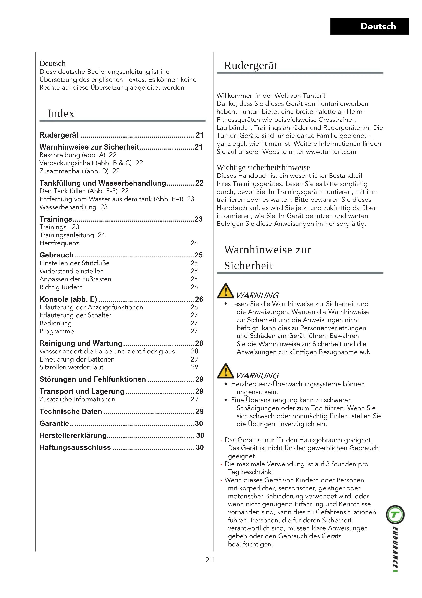 Battery size 2pcs AA Warranty Warranty terms The consumer is entitled to the applicable legal rights stated in the national legislation concerning the commerce of consumer goods. This warranty does not restrict these rights. The Purchaser’s Warranty is only valid if the item is used in an environment approved by Tunturi New Fitness BV for that particular equipment. The product-specific approved environment is stated in the Owner’s Manual provided with your equipment.20 English Warranty conditions The warranty conditions commence from the date of purchase. Warranty conditions may vary per country, so please consult your local dealer for the warranty conditions. Warranty coverage Under no circumstances shall Tunturi New Fitness BV or the Tunturi Distributor be liable by virtue of this warranty or otherwise for any special, indirect, secondary or consequential damages of any nature arising out of any use or inability to use this equipment. Warranty limitations This warranty covers manufacturing defects in the fitness equipment as originally packed by Tunturi New Fitness BV. The warranty shall apply only under conditions of normal, recommended use of the product as described in the Owner’s Manual and providing that Tunturi New Fitness BV’s instructions for installation, maintenance and use have been complied with. Neither Tunturi New Fitness BV’s nor the Tunturi Distributors’ obligations apply to defects due to reasons beyond their control. The warranty applies only to the original purchaser and is valid only in countries where Tunturi New Fitness BV has an authorised importer. The warranty does not extend to fitness equipment or components that have been modified without the consent of Tunturi New Fitness BV. Defects resulting from normal wear, misuse, abuse, corrosion, or damage incurred during loading or transportation are not covered. The warranty does not cover sounds or noises emitted during use where these do not substantially impede the use of the equipment and where they are not caused by a fault in the equipment. The warranty does not cover defects arising from the failure to carry periodic maintenance as outlined within the Owner’s Manual for the product. Furthermore, the warranty does not cover defects arising from usage and storage within an unsuitable environment as described within the Owner’s Manual which should be indoors, dry, dust and grit free and within a temperature range of +15°C to +35°C. The warranty does not cover maintenance activities, such as cleaning, lubricating, and normal part adjustments, nor installation procedures that customers can accomplish themselves, such as changing uncomplicated meters, pedals and other similar parts not requiring any dismantling/ reassembling of the fitness equipment. Warranty repairs carried out by other than authorised Tunturi representatives are not covered. Failure to follow the instructions given in the Owner’s Manual will invalidate the product’s warranty. Declaration of the manufacturer Tunturi New Fitness BV declares that the product is in conformity with the following standards and directives: EN 957 (HB), 89/336/EEC. The product therefore carries the CE label. 05-2018 Tunturi New Fitness BV Purmerweg 1 1311 XE Almere The Netherlands Disclaimer © 2018 Tunturi New Fitness BV All rights reserved. The product and the manual are subject to change. Specifications can be changed without further notice.21 Deutsch Rudergerät Willkommen in der Welt von Tunturi!Danke, dass Sie dieses Gerät von Tunturi erworben haben. Tunturi bietet eine breite Palette an Heim-Fitnessgeräten wie beispielsweise Crosstrainer, Laufbänder, Trainingsfahrräder und Rudergeräte an. Die Tunturi Geräte sind für die ganze Familie geeignet - ganz egal, wie fit man ist. Weitere Informationen finden Sie auf unserer Website unter www.tunturi.com Wichtige sicherheitshinweise Dieses Handbuch ist ein wesentlicher Bestandteil Ihres Trainingsgerätes. Lesen Sie es bitte sorgfältig durch, bevor Sie Ihr Trainingsgerät montieren, mit ihm trainieren oder es warten. Bitte bewahren Sie dieses Handbuch auf; es wird Sie jetzt und zukünftig darüber informieren, wie Sie Ihr Gerät benutzen und warten. Befolgen Sie diese Anweisungen immer sorgfältig. Warnhinweise zur Sicherheit WARNUNG