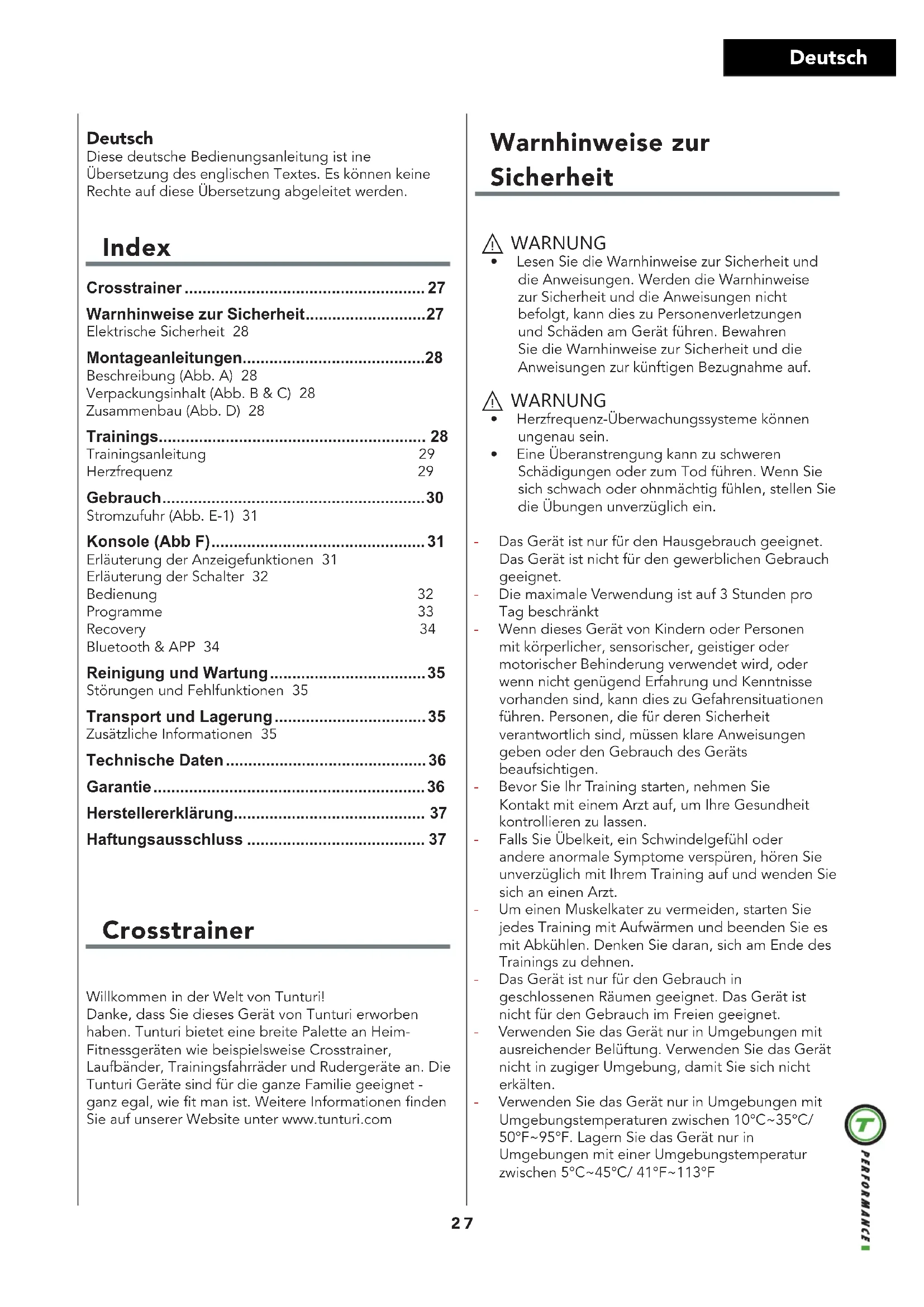 - Warranty Tunturi purchaser‘s warranty Warranty terms The consumer is entitled to the applicable legal rights stated in the national legislation concerning the commerce of consumer goods. This warranty does not restrict these rights. The Purchaser’s Warranty is only valid if the item is used in an environment approved by Tunturi New Fitness BV for that particular equipment. The product-specific approved environment is stated in the Owner’s Manual provided with your equipment. Warranty conditions The warranty conditions commence from the date of purchase. Warranty conditions may vary per country, so please consult your local dealer for the warranty conditions. Warranty coverage Under no circumstances shall Tunturi New Fitness BV or the Tunturi Distributor be liable by virtue of this warranty or otherwise for any special, indirect, secondary or consequential damages of any nature arising out of any use or inability to use this equipment. Warranty limitations This warranty covers manufacturing defects in the fitness equipment as originally packed by Tunturi New Fitness BV. The warranty shall apply only under conditions of normal, recommended use of the product as described in the Owner’s Manual and providing that Tunturi New Fitness BV’s instructions for installation, maintenance and use have been complied with. Neither Tunturi New Fitness BV’s nor the Tunturi Distributors’ obligations apply to defects due to reasons beyond their control. The warranty applies only to the original purchaser and is valid only in countries where Tunturi New Fitness BV has an authorised importer. The warranty does not extend to fitness equipment or components that have been modified without the consent of Tunturi New Fitness BV. Defects resulting from normal wear, misuse, abuse, corrosion, or damage incurred during loading or transportation are not covered. The warranty does not cover sounds or noises emitted during use where these do not substantially impede the use of the equipment and where they are not caused by a fault in the equipment. The warranty does not cover defects arising from the failure to carry periodic maintenance as outlined within the Owner’s Manual for the product. Furthermore, the warranty does not cover defects arising from usage and storage within an unsuitable environment as described within the Owner’s Manual which should be indoors, dry, dust and grit free and within a temperature range of +15°C to +35°C. The warranty does not cover maintenance activities, such as cleaning, lubricating, and normal part adjustments, nor installation procedures that customers can accomplish themselves, such as changing uncomplicated meters, pedals and other similar parts not requiring any dismantling/ reassembling of the fitness equipment. Warranty repairs carried out by other than authorised Tunturi representatives are not covered. Failure to follow the instructions given in the Owner’s Manual will invalidate the product’s warranty. Declaration of the manufacturer Tunturi New Fitness BV declares that the product is in conformity with the following standards and directives: EN 957 (HB), 89/336/EEC. The product therefore carries the CE label. 01-2017 Tunturi New Fitness BV Purmerweg 1 1311 XE Almere The Netherlands Disclaimer © 2017 Tunturi New Fitness BV All rights reserved. The product and the manual are subject to change. Specifications can be changed without further notice.27 Deutsch Crosstrainer Willkommen in der Welt von Tunturi!Danke, dass Sie dieses Gerät von Tunturi erworben haben. Tunturi bietet eine breite Palette an Heim-Fitnessgeräten wie beispielsweise Crosstrainer, Laufbänder, Trainingsfahrräder und Rudergeräte an. Die Tunturi Geräte sind für die ganze Familie geeignet - ganz egal, wie fit man ist. Weitere Informationen finden Sie auf unserer Website unter www.tunturi.com Deutsch Diese deutsche Bedienungsanleitung ist ine Übersetzung des englischen Textes. Es können keine Rechte auf diese Übersetzung abgeleitet werden. Index Crosstrainer p. 27