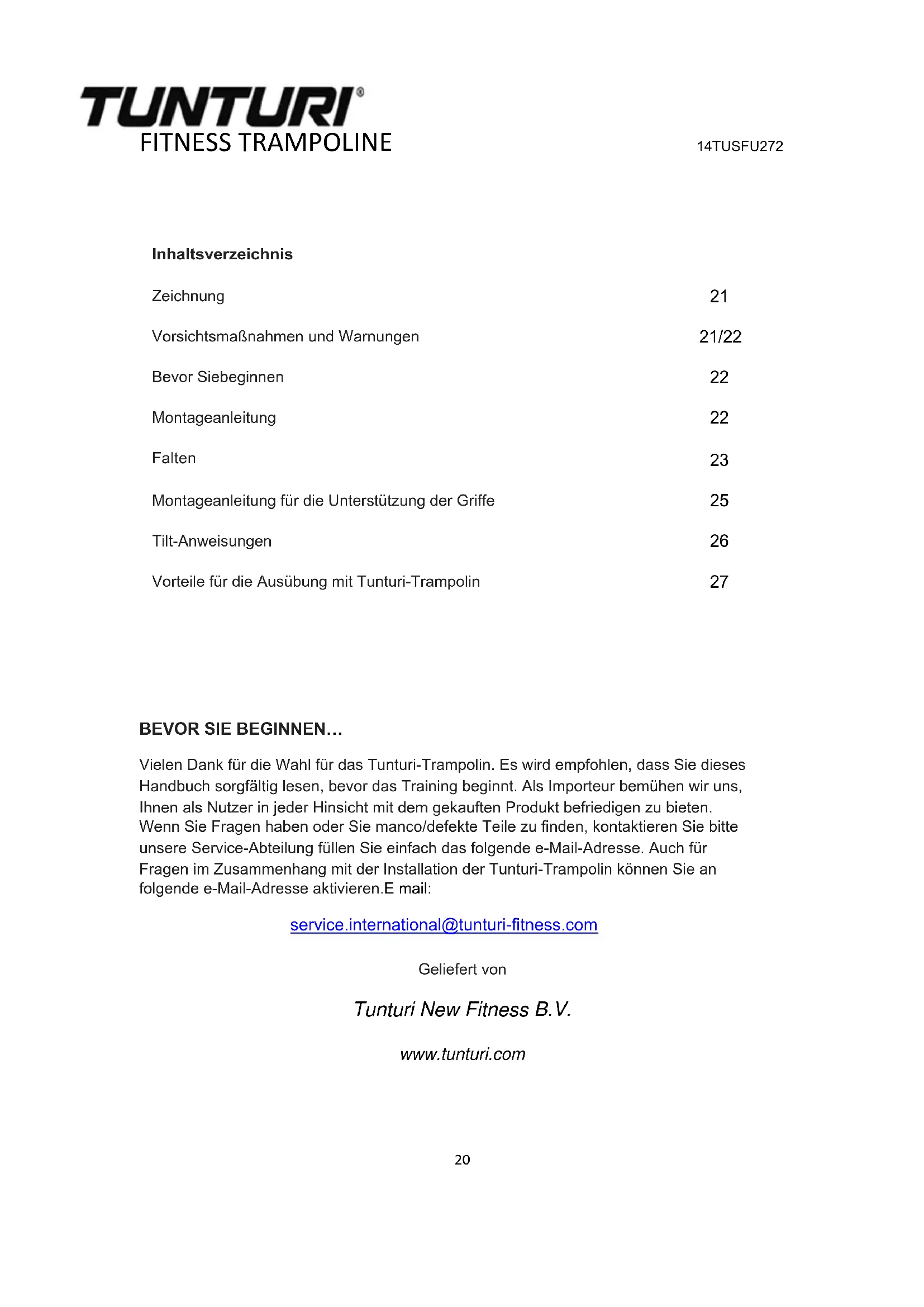 Vielen Dank für die Wahl für das Tunturi-Trampolin. Es wird empfohlen, dass Sie dieses Handbuch sorgfältig lesen, bevor das Training beginnt. Als Importeur bemühen wir uns, Ihnen als Nutzer in jeder Hinsicht mit dem gekauften Produkt befriedigen zu bieten. Wenn Sie Fragen haben oder Sie manco/defekte Teile zu finden, kontaktieren Sie bitte unsere Service-Abteilung füllen Sie einfach das folgende e-Mail-Adresse. Auch für Fragen im Zusammenhang mit der Installation der Tunturi-Trampolin können Sie an folgende e-Mail-Adresse aktivieren.E mail: service.international@tunturi-fitness.com Geliefert von Tunturi New Fitness B.V. www.tunturi.comFITNESSTRAMPOLINE 14TUSFU272