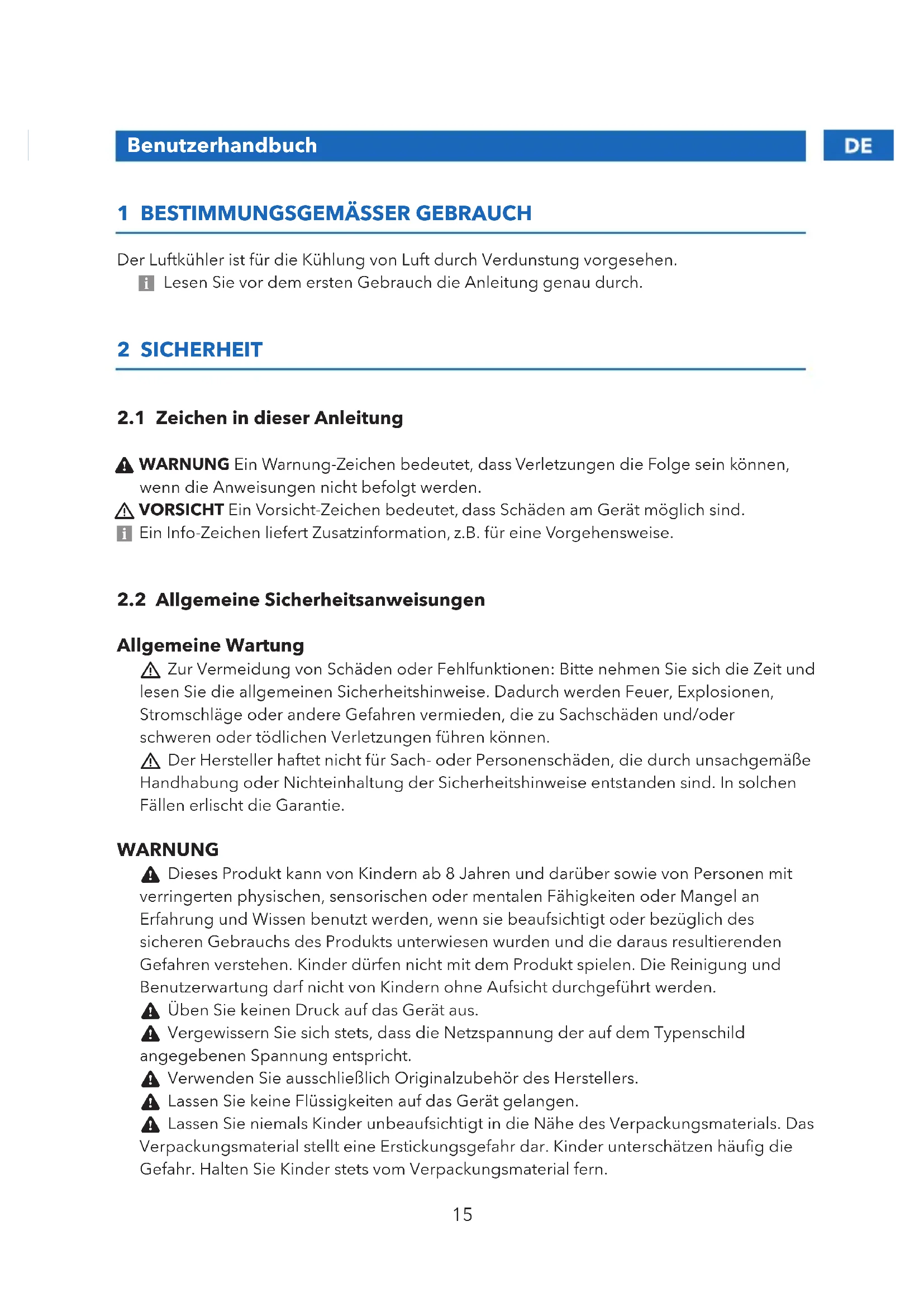 Der Luftkühler ist für die Kühlung von Luft durch Verdunstung vorgesehen. 5 Lesen Sie vor dem ersten Gebrauch die Anleitung genau durch. 2 SICHERHEIT