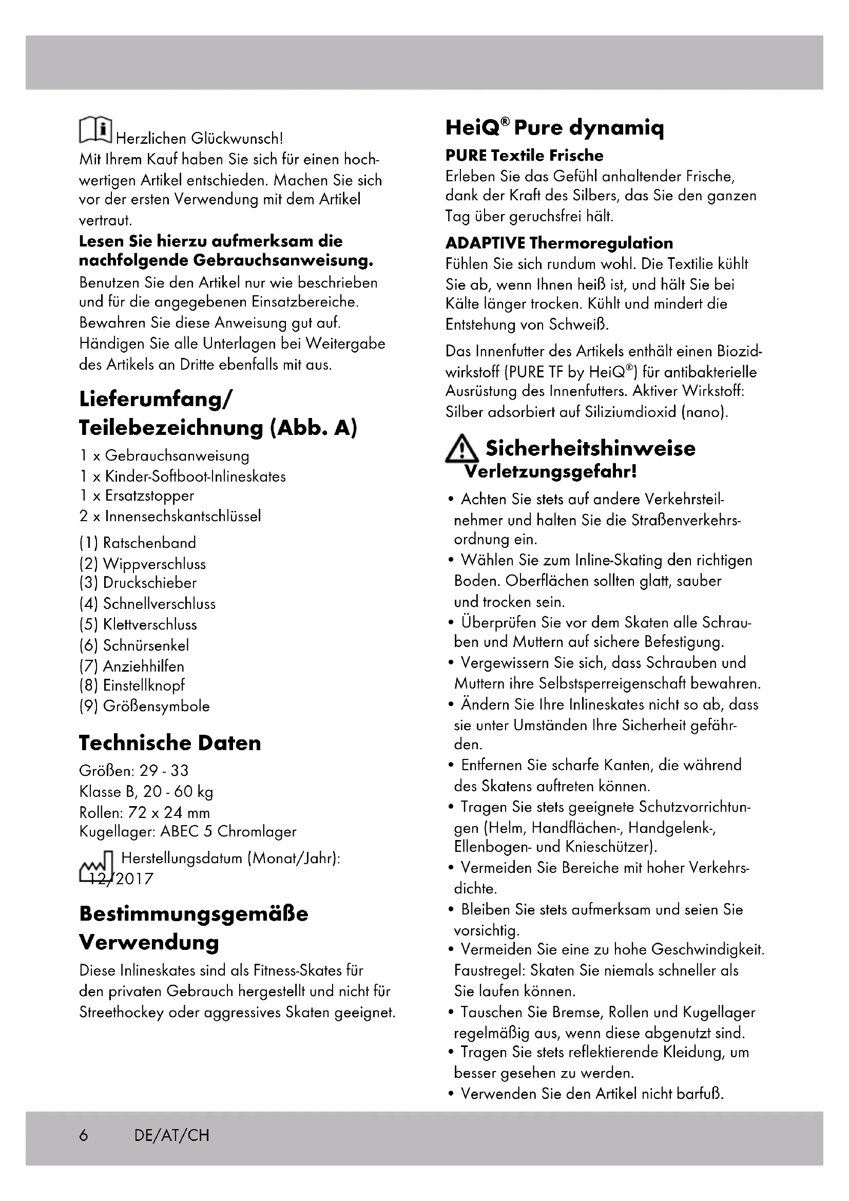 - Verwenden Sie den Artikel nicht barfuß. Herzlichen Glückwunsch! Mit Ihrem Kauf haben Sie sich für einen hoch- wertigen Artikel entschieden. Machen Sie sich vor der ersten Verwendung mit dem Artikel vertraut. Lesen Sie hierzu aufmerksam die nachfolgende Gebrauchsanweisung. Benutzen Sie den Artikel nur wie beschrieben und für die angegebenen Einsatzbereiche. Bewahren Sie diese Anweisung gut auf. Händigen Sie alle Unterlagen bei Weitergabe des Artikels an Dritte ebenfalls mit aus. Lieferumfang/ Teilebezeichnung (Abb. A) 1 x Gebrauchsanweisung 1 x Kinder-Softboot-Inlineskates 1 x Ersatzstopper 2 x Innensechskantschlüssel (1) Ratschenband (2) Wippverschluss (3) Druckschieber (4) Schnellverschluss (5) Klettverschluss (6) Schnürsenkel (7) Anziehhilfen (8) Einstellknopf (9) Größensymbole Technische Daten Größen: 29 - 33 Klasse B, 20 - 60 kg Rollen: 72 x 24 mm Kugellager: ABEC 5 Chromlager Herstellungsdatum (Monat/Jahr): 12/2017 Bestimmungsgemäße Verwendung Diese Inlineskates sind als Fitness-Skates für den privaten Gebrauch hergestellt und nicht für Streethockey oder aggressives Skaten geeignet. DE/AT/CH7 Bremstechniken Hinweis: Üben Sie die unterschiedlichen Brems- techniken auf einer ebenen Oberfläche ohne Verkehr und ohne Fußgänger. Ver- meiden Sie Gefälle, bis Sie die Brems- techniken beherrschen. Fersenbremse (Abb. C): Wenn Ihre Inlineskates mit Bremsen ausgestattet sind, denken Sie daran, diese zu benutzen. Heben Sie die Spitze des Skates, an dem die Bremse montiert ist, leicht an und drücken Sie die Bremse auf den Boden. Verlagern Sie Ihr Gewicht leicht nach vorn und beugen Sie die Knie. Die Bremswirkung kann verstärkt wer- den, wenn Sie die Knie stärker beugen und Ihr Gewicht weiter nach vorn verlegen, während Sie gleichzeitig den Druck auf Ihren bremsenden Skate verstärken. T-Bremse (Abb. D): Falls Ihre Inlineskates nicht mit einer Bremse ausgestattet sind oder Sie die Bremse abmontiert haben, empfehlen wir Ihnen den Einsatz der „T-Stop-Technik“– diese ist jedoch nur für fort- geschrittene Skater geeignet! Beim Einsatz der „T-Stop-Technik“ verlagern Sie Ihr gesamtes Gewicht auf einen Fuß. Bewegen Sie jetzt den anderen Fuß hinter den ersten und setzen Sie ihn im rechten Winkel dahinter. Verlagern Sie anschließend Ihr Gewicht von vorn auf die Innenseite der Rollen Ihres hinteren Skates und bremsen Sie mit zunehmendem Druck. Einstellen der Größe (Abb. E) Drücken Sie den Einstellknopf (8) hinunter und verschieben Sie den Schuh bei gedrücktem Einstellknopf auf die gewünschte Größe. Der Schuh muss durch einen hörbaren „KLICK“ einrasten. Der Pfeil am Schuh zeigt dabei auf die passende Größe (9) auf dem Rahmen. Vermeidung von Sachschäden!