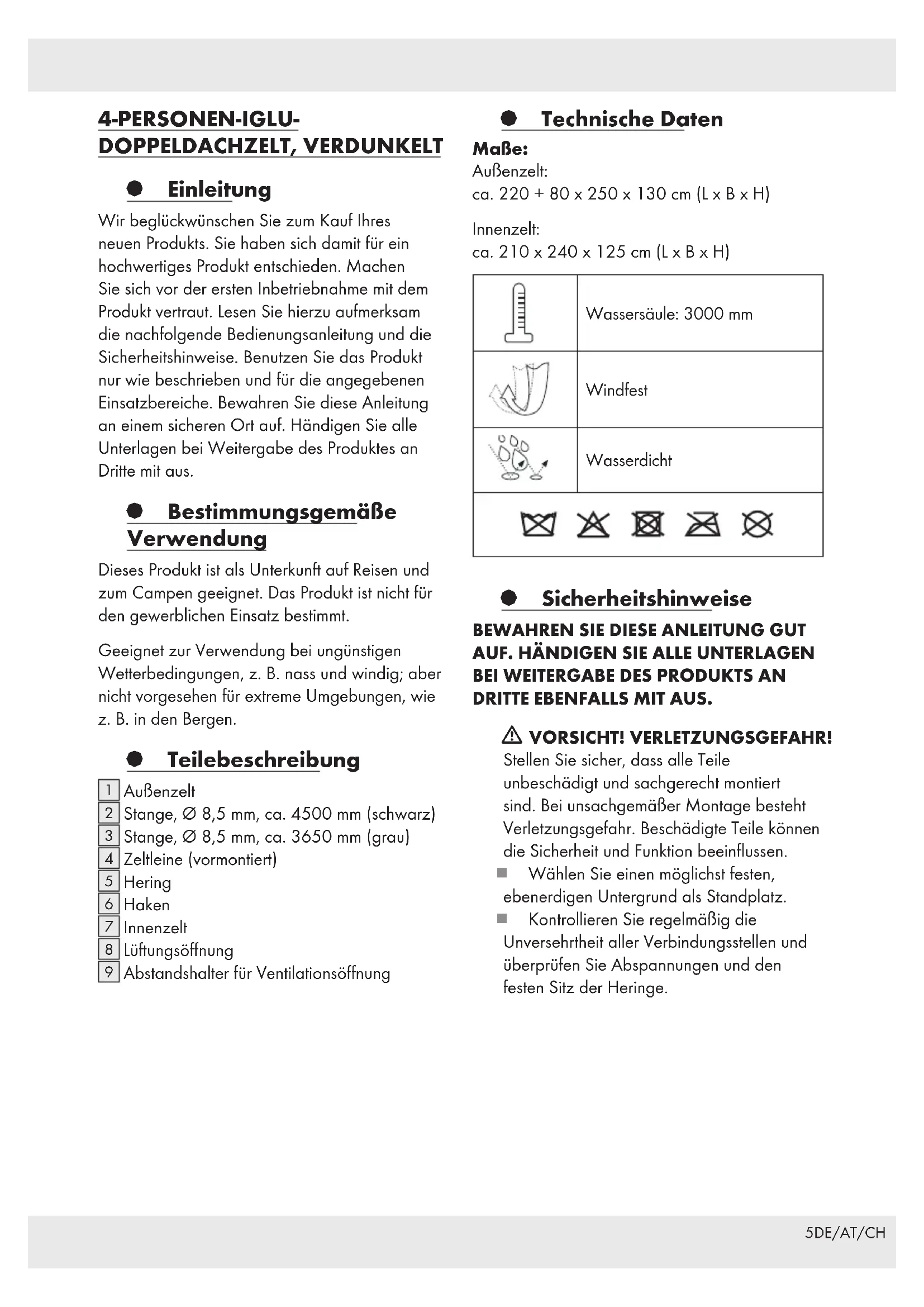 ca. / env. / circa 240 cm ca. / env. / circa 220 cm ca. / env. / circa 80 cm ca. / env. / circa 250 cm ca. / env. / circa 130 cm5DE/AT/CH 4-PERSONEN-IGLU- DOPPELDACHZELT, VERDUNKELT § Einleitung Wir beglückwünschen Sie zum Kauf Ihres neuen Produkts. Sie haben sich damit für ein hochwertiges Produkt entschieden. Machen Sie sich vor der ersten Inbetriebnahme mit dem Produkt vertraut. Lesen Sie hierzu aufmerksam die nachfolgende Bedienungsanleitung und die Sicherheitshinweise. Benutzen Sie das Produkt nur wie beschrieben und für die angegebenen Einsatzbereiche. Bewahren Sie diese Anleitung an einem sicheren Ort auf. Händigen Sie alle Unterlagen bei Weitergabe des Produktes an Dritte mit aus. § Bestimmungsgemäße Verwendung Dieses Produkt ist als Unterkunft auf Reisen und zum Campen geeignet. Das Produkt ist nicht für den gewerblichen Einsatz bestimmt. Geeignet zur Verwendung bei ungünstigen Wetterbedingungen, z. B. nass und windig; aber nicht vorgesehen für extreme Umgebungen, wie z. B. in den Bergen. § Teilebeschreibung