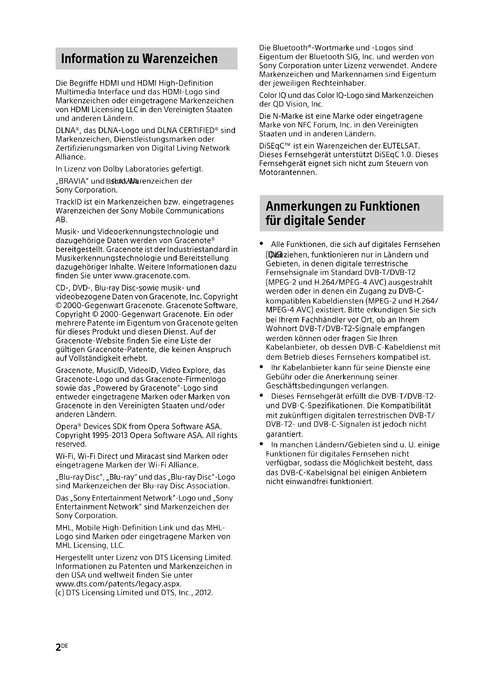 Die Begriffe HDMI und HDMI High-Definition Multimedia Interface und das HDMI-Logo sind Markenzeichen oder eingetragene Markenzeichen von HDMI Licensing LLC in den Vereinigten Staaten und anderen Ländern. DLNA®, das DLNA-Logo und DLNA CERTIFIED® sind Markenzeichen, Dienstleistungsmarken oder Zertifizierungsmarken von Digital Living Network Alliance. In Lizenz von Dolby Laboratories gefertigt. „BRAVIA“ und sind Warenzeichen der Sony Corporation. TrackID ist ein Markenzeichen bzw. eingetragenes Warenzeichen der Sony Mobile Communications AB. Musik- und Videoerkennungstechnologie und dazugehörige Daten werden von Gracenote® bereitgestellt. Gracenote ist der Industriestandard in Musikerkennungstechnologie und Bereitstellung dazugehöriger Inhalte. Weitere Informationen dazu finden Sie unter www.gracenote.com. CD-, DVD-, Blu-ray Disc-sowie musik- und videobezogene Daten von Gracenote, Inc. Copyright © 2000-Gegenwart Gracenote. Gracenote Software, Copyright © 2000-Gegenwart Gracenote. Ein oder mehrere Patente im Eigentum von Gracenote gelten für dieses Produkt und diesen Dienst. Auf der Gracenote-Website finden Sie eine Liste der gültigen Gracenote-Patente, die keinen Anspruch auf Vollständigkeit erhebt. Gracenote, MusicID, VideoID, Video Explore, das Gracenote-Logo und das Gracenote-Firmenlogo sowie das „Powered by Gracenote“-Logo sind entweder eingetragene Marken oder Marken von Gracenote in den Vereinigten Staaten und/oder anderen Ländern. Opera® Devices SDK from Opera Software ASA. Copyright 1995-2013 Opera Software ASA. All rights reserved. Wi-Fi, Wi-Fi Direct und Miracast sind Marken oder eingetragene Marken der Wi-Fi Alliance. „Blu-ray Disc“, „Blu-ray“ und das „Blu-ray Disc“-Logo sind Markenzeichen der Blu-ray Disc Association. Das „Sony Entertainment Network“-Logo und „Sony Entertainment Network“ sind Markenzeichen der Sony Corporation. MHL, Mobile High-Definition Link und das MHL- Logo sind Marken oder eingetragene Marken von MHL Licensing, LLC. Hergestellt unter Lizenz von DTS Licensing Limited. Informationen zu Patenten und Markenzeichen in den USA und weltweit finden Sie unter www.dts.com/patents/legacy.aspx. (c) DTS Licensing Limited und DTS, Inc., 2012. Die Bluetooth®-Wortmarke und -Logos sind Eigentum der Bluetooth SIG, Inc. und werden von Sony Corporation unter Lizenz verwendet. Andere Markenzeichen und Markennamen sind Eigentum der jeweiligen Rechteinhaber. Color IQ und das Color IQ-Logo sind Markenzeichen der QD Vision, Inc. Die N-Marke ist eine Marke oder eingetragene Marke von NFC Forum, Inc. in den Vereinigten Staaten und in anderen Ländern. DiSEqC™ ist ein Warenzeichen der EUTELSAT. Dieses Fernsehgerät unterstützt DiSEqC 1.0. Dieses Fernsehgerät eignet sich nicht zum Steuern von Motorantennen. Alle Funktionen, die sich auf digitales Fernsehen ( ) beziehen, funktionieren nur in Ländern und Gebieten, in denen digitale terrestrische Fernsehsignale im Standard DVB-T/DVB-T2 (MPEG-2 und H.264/MPEG-4 AVC) ausgestrahlt werden oder in denen ein Zugang zu DVB-C- kompatiblen Kabeldiensten (MPEG-2 und H.264/ MPEG-4 AVC) existiert. Bitte erkundigen Sie sich bei Ihrem Fachhändler vor Ort, ob an Ihrem Wohnort DVB-T/DVB-T2-Signale empfangen werden können oder fragen Sie Ihren Kabelanbieter, ob dessen DVB-C-Kabeldienst mit dem Betrieb dieses Fernsehers kompatibel ist. Ihr Kabelanbieter kann für seine Dienste eine Gebühr oder die Anerkennung seiner Geschäftsbedingungen verlangen. Dieses Fernsehgerät erfüllt die DVB-T/DVB-T2- und DVB-C-Spezifikationen. Die Kompatibilität mit zukünftigen digitalen terrestrischen DVB-T/ DVB-T2- und DVB-C-Signalen ist jedoch nicht garantiert. In manchen Ländern/Gebieten sind u. U. einige Funktionen für digitales Fernsehen nicht verfügbar, sodass die Möglichkeit besteht, dass das DVB-C-Kabelsignal bei einigen Anbietern nicht einwandfrei funktioniert. Information zu Warenzeichen Anmerkungen zu Funktionen für digitale Sender3