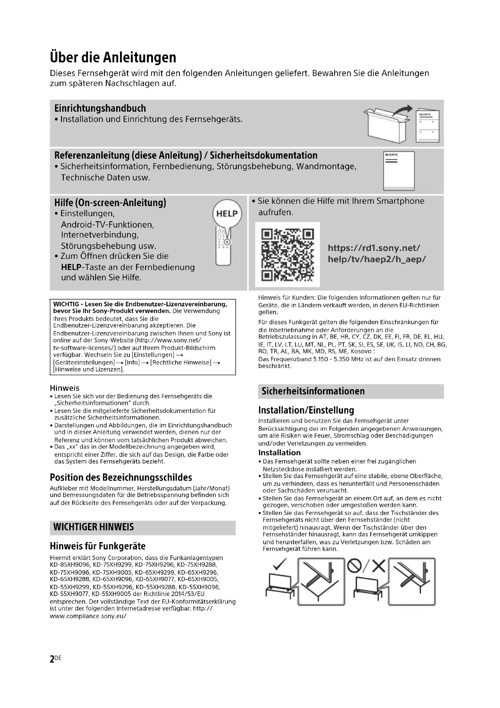 - Lesen Sie sich vor der Bedienung des Fernsehgeräts die „Sicherheitsinformationen“ durch.• Lesen Sie die mitgelieferte Sicherheitsdokumentation für zusätzliche Sicherheitsinformationen.• Darstellungen und Abbildungen, die im Einrichtungshandbuch und in dieser Anleitung verwendet werden, dienen nur der Referenz und können vom tatsächlichen Produkt abweichen.• Das „xx“ das in der Modellbezeichnung angegeben wird, entspricht einer Ziffer, die sich auf das Design, die Farbe oder das System des Fernsehgeräts bezieht. Position des Bezeichnungsschildes Aufkleber mit Modellnummer, Herstellungsdatum (Jahr/Monat) und Bemessungsdaten für die Betriebsspannung befinden sich auf der Rückseite des Fernsehgeräts oder auf der Verpackung. WICHTIGER HINWEIS Hinweis für Funkgeräte Hiermit erklärt Sony Corporation, dass die Funkanlagentypen KD-85XH9096, KD-75XH9299, KD-75XH9296, KD-75XH9288, KD-75XH9096, KD-75XH9005, KD-65XH9299, KD-65XH9296, KD-65XH9288, KD-65XH9096, KD-65XH9077, KD-65XH9005, KD-55XH9299, KD-55XH9296, KD-55XH9288, KD-55XH9096, KD-55XH9077, KD-55XH9005 der Richtlinie 2014/53/EU entsprechen. Der vollständige Text der EU-Konformitätserklärung ist unter der folgenden Internetadresse verfügbar: http://www.compliance.sony.eu/Hinweis für Kunden: Die folgenden Informationen gelten nur für Geräte, die in Ländern verkauft werden, in denen EU-Richtlinien gelten.Für dieses Funkgerät gelten die folgenden Einschränkungen für die Inbetriebnahme oder Anforderungen an die Betriebszulassung in AT, BE, HR, CY, CZ, DK, EE, FI, FR, DE, EL, HU, IE, IT, LV, LT, LU, MT, NL, PL, PT, SK, SI, ES, SE, UK, IS, LI, NO, CH, BG, RO, TR, AL, BA, MK, MD, RS, ME, Kosovo :Das Frequenzband 5.150 - 5.350 MHz ist auf den Einsatz drinnen beschränkt. Sicherheitsinformationen Installation/Einstellung Installieren und benutzen Sie das Fernsehgerät unter Berücksichtigung der im Folgenden angegebenen Anweisungen, um alle Risiken wie Feuer, Stromschlag oder Beschädigungen und/oder Verletzungen zu vermeiden. Installation