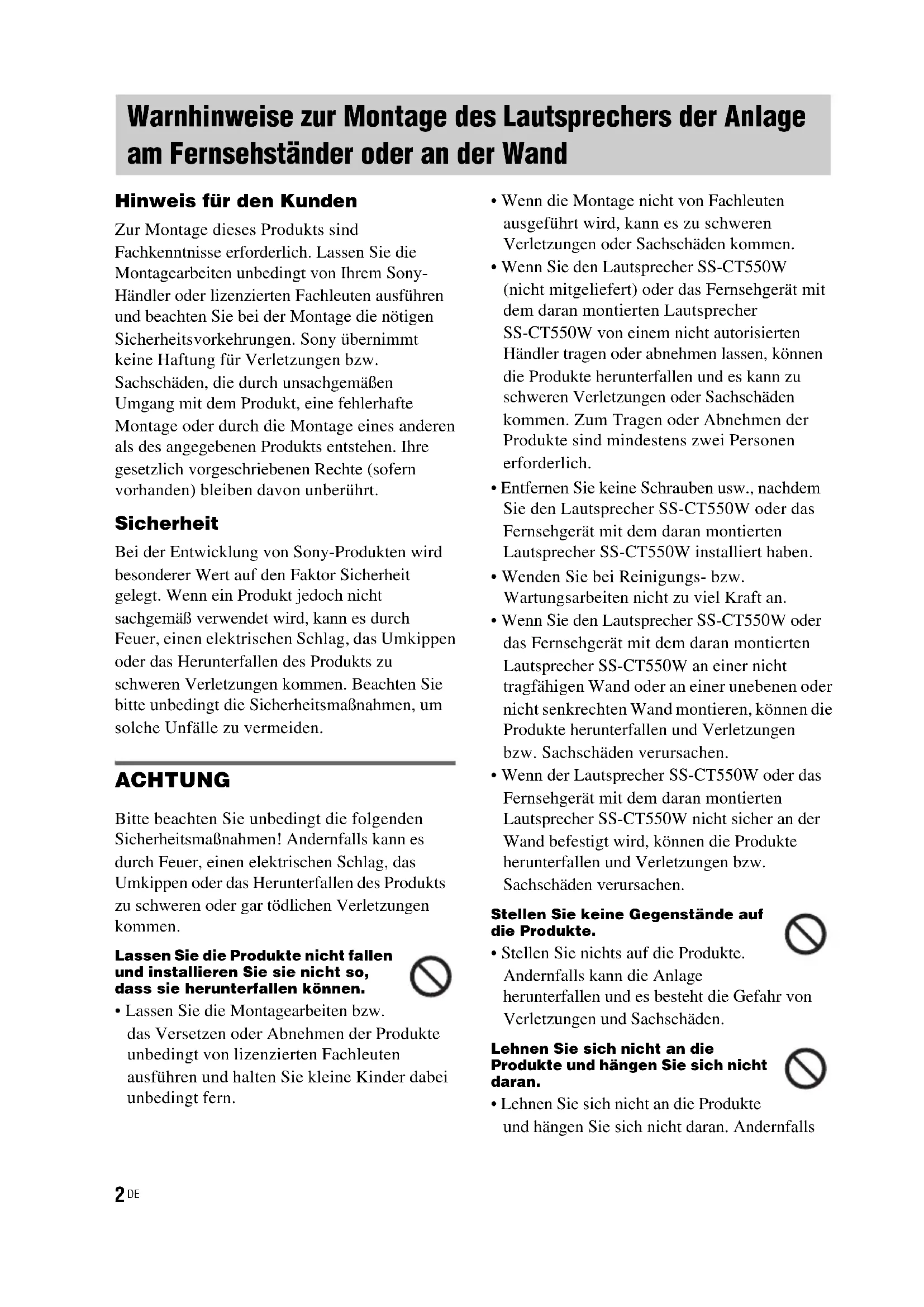 Hinweis für den Kunden Zur Montage dieses Produkts sind Fachkenntnisse erforderlich. Lassen Sie die Montagearbeiten unbedingt von Ihrem Sony- Händler oder lizenzierten Fachleuten ausführen und beachten Sie bei der Montage die nötigen Sicherheitsvorkehrungen. Sony übernimmt keine Haftung für Verletzungen bzw. Sachschäden, die durch unsachgemäßen Umgang mit dem Produkt, eine fehlerhafte Montage oder durch die Montage eines anderen als des angegebenen Produkts entstehen. Ihre gesetzlich vorgeschriebenen Rechte (sofern vorhanden) bleiben davon unberührt. Sicherheit Bei der Entwicklung von Sony-Produkten wird besonderer Wert auf den Faktor Sicherheit gelegt. Wenn ein Produkt jedoch nicht sachgemäß verwendet wird, kann es durch Feuer, einen elektrischen Schlag, das Umkippen oder das Herunterfallen des Produkts zu schweren Verletzungen kommen. Beachten Sie bitte unbedingt die Sicherheitsmaßnahmen, um solche Unfälle zu vermeiden. ACHTUNG Bitte beachten Sie unbedingt die folgenden Sicherheitsmaßnahmen! Andernfalls kann es durch Feuer, einen elektrischen Schlag, das Umkippen oder das Herunterfallen des Produkts zu schweren oder gar tödlichen Verletzungen kommen. Lassen Sie die Produkte nicht fallen und installieren Sie sie nicht so, dass sie herunterfallen können.