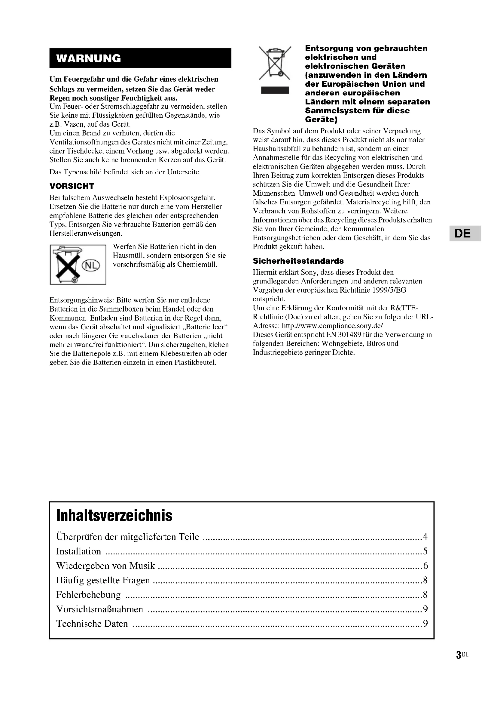 - Um Feuergefahr und die Gefahr eines elektrischen Schlags zu vermeiden, setzen Sie das Gerät weder Regen noch sonstiger Feuchtigkeit aus. Um Feuer- oder Stromschlaggefahr zu vermeiden, stellen Sie keine mit Flüssigkeiten gefüllten Gegenstände, wie z.B. Vasen, auf das Gerät. Um einen Brand zu verhüten, dürfen die Ventilationsöffnungen des Gerätes nicht mit einer Zeitung, einer Tischdecke, einem Vorhang usw. abgedeckt werden. Stellen Sie auch keine brennenden Kerzen auf das Gerät. Das Typenschild befindet sich an der Unterseite. VORSICHT Bei falschem Auswechseln besteht Explosionsgefahr. Ersetzen Sie die Batterie nur durch eine vom Hersteller empfohlene Batterie des gleichen oder entsprechenden Typs. Entsorgen Sie verbrauchte Batterien gemäß den Herstelleranweisungen. Werfen Sie Batterien nicht in den Hausmüll, sondern entsorgen Sie sie vorschriftsmäßig als Chemiemüll. Entsorgungshinweis: Bitte werfen Sie nur entladene Batterien in die Sammelboxen beim Handel oder den Kommunen. Entladen sind Batterien in der Regel dann, wenn das Gerät abschaltet und signalisiert „Batterie leer“ oder nach längerer Gebrauchsdauer der Batterien „nicht mehr einwandfrei funktioniert“. Um sicherzugehen, kleben Sie die Batteriepole z.B. mit einem Klebestreifen ab oder geben Sie die Batterien einzeln in einen Plastikbeutel. Entsorgung von gebrauchten elektrischen und elektronischen Geräten (anzuwenden in den Ländern der Europäischen Union und anderen europäischen Ländern mit einem separaten Sammelsystem für diese Geräte) Das Symbol auf dem Produkt oder seiner Verpackung weist darauf hin, dass dieses Produkt nicht als normaler Haushaltsabfall zu behandeln ist, sondern an einer Annahmestelle für das Recycling von elektrischen und elektronischen Geräten abgegeben werden muss. Durch Ihren Beitrag zum korrekten Entsorgen dieses Produkts schützen Sie die Umwelt und die Gesundheit Ihrer Mitmenschen. Umwelt und Gesundheit werden durch falsches Entsorgen gefährdet. Materialrecycling hilft, den Verbrauch von Rohstoffen zu verringern. Weitere Informationen über das Recycling dieses Produkts erhalten Sie von Ihrer Gemeinde, den kommunalen Entsorgungsbetrieben oder dem Geschäft, in dem Sie das Produkt gekauft haben. Sicherheitsstandards Hiermit erklärt Sony, dass dieses Produkt den grundlegenden Anforderungen und anderen relevanten Vorgaben der europäischen Richtlinie 1999/5/EG entspricht. Um eine Erklärung der Konformität mit der R&TTE- Richtlinie (Doc) zu erhalten, gehen Sie zu folgender URL- Adresse: http://www.compliance.sony.de/ Dieses Gerät entspricht EN 301489 für die Verwendung in folgenden Bereichen: Wohngebiete, Büros und Industriegebiete geringer Dichte. WARNUNG Inhaltsverzeichnis Überprüfen der mitgelieferten Teile p. 4