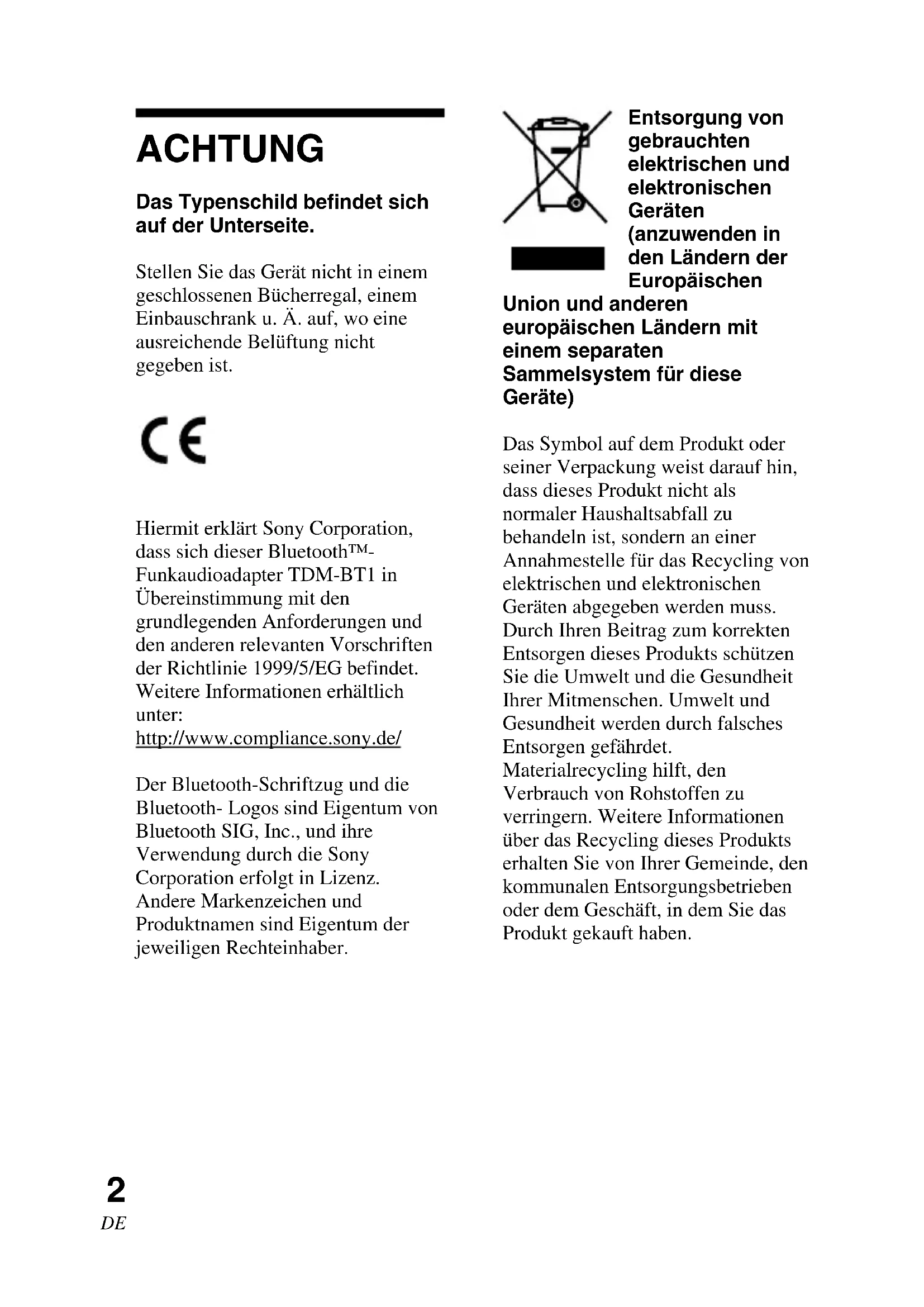 Das Typenschild befindet sich auf der Unterseite. Stellen Sie das Gerät nicht in einem geschlossenen Bücherregal, einem Einbauschrank u. Ä. auf, wo eine ausreichende Belüftung nicht gegeben ist. ACHTUNG Hiermit erklärt Sony Corporation, dass sich dieser Bluetooth™- Funkaudioadapter TDM-BT1 in Übereinstimmung mit den grundlegenden Anforderungen und den anderen relevanten Vorschriften der Richtlinie 1999/5/EG befindet. Weitere Informationen erhältlich unter: http://www.compliance.sony.de/ Der Bluetooth-Schriftzug und die Bluetooth- Logos sind Eigentum von Bluetooth SIG, Inc., und ihre Verwendung durch die Sony Corporation erfolgt in Lizenz. Andere Markenzeichen und Produktnamen sind Eigentum der jeweiligen Rechteinhaber. Entsorgung von gebrauchten elektrischen und elektronischen Geräten (anzuwenden in den Ländern der Europäischen Union und anderen europäischen Ländern mit einem separaten Sammelsystem für diese Geräte) Das Symbol auf dem Produkt oder seiner Verpackung weist darauf hin, dass dieses Produkt nicht als normaler Haushaltsabfall zu behandeln ist, sondern an einer Annahmestelle für das Recycling von elektrischen und elektronischen Geräten abgegeben werden muss. Durch Ihren Beitrag zum korrekten Entsorgen dieses Produkts schützen Sie die Umwelt und die Gesundheit Ihrer Mitmenschen. Umwelt und Gesundheit werden durch falsches Entsorgen gefährdet. Materialrecycling hilft, den Verbrauch von Rohstoffen zu verringern. Weitere Informationen über das Recycling dieses Produkts erhalten Sie von Ihrer Gemeinde, den kommunalen Entsorgungsbetrieben oder dem Geschäft, in dem Sie das Produkt gekauft haben.TDM-BT1 [DE] 3-095-404-11(1)