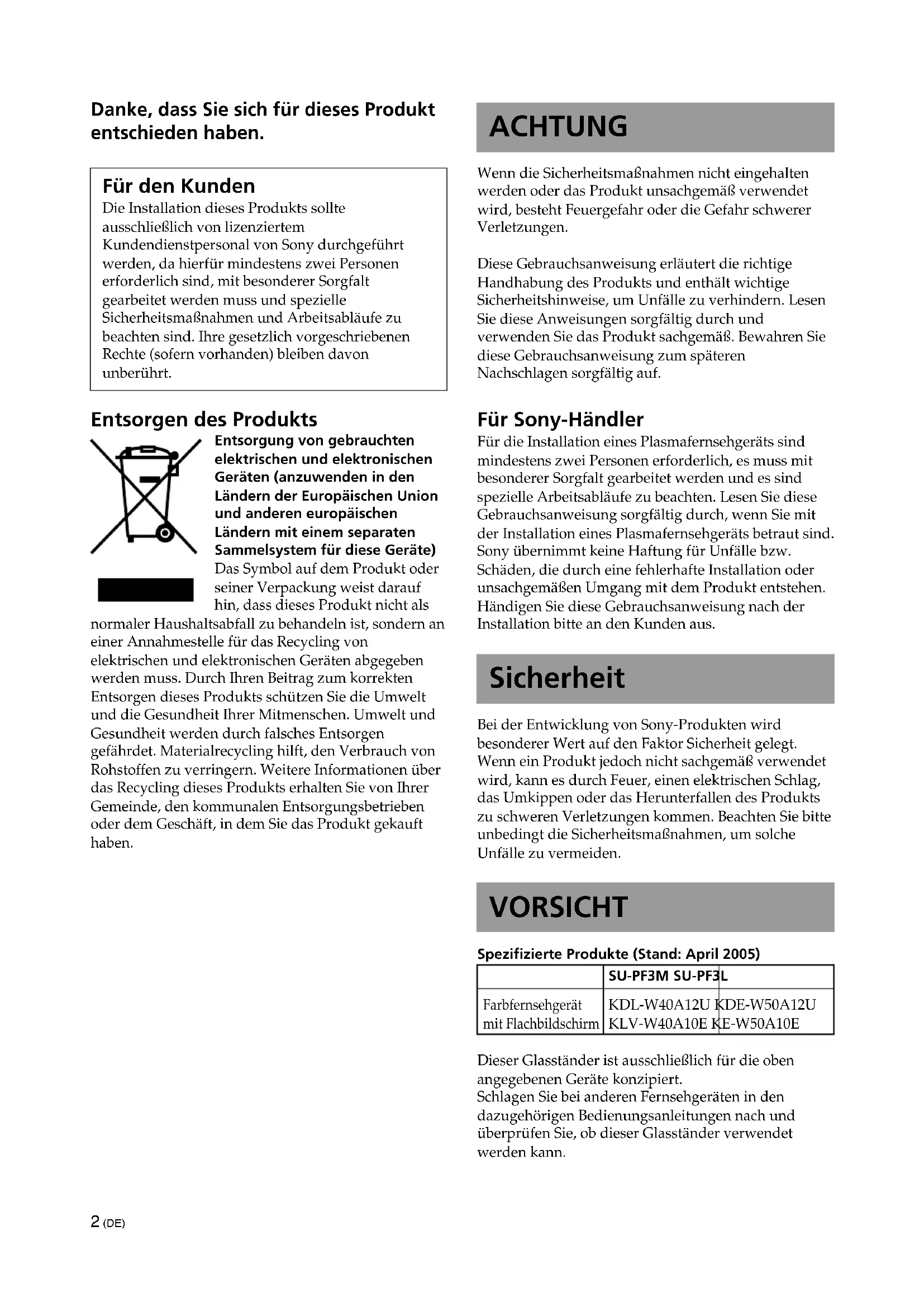 Wall anchor bracket (not supplied) Strong rope or chain (not supplied) Safety measures to prevent toppling over WARNING Be sure to take measures to prevent the stand from toppling over. If you fail to do so, the TV may topple over and cause injury. Anchor the TV to a wall, pillar, etc., to prevent it from toppling over. Prepare a commercially available strong rope or chain and wall anchor bracket beforehand. 1 Secure the wall anchor bracket to a solid wall or pillar. 2 Pass the rope or chain through both holes of the anchor attachments and then tighten the other end of the rope or chain to the wall anchor bracket. SPEAKER Speaker unit 10 cm (2) Impedance 4 Ω Max. power 50 W Design and specifications are subject to change without notice. Load capacity25 kg (55 lb 2 oz)2 (DE) Danke, dass Sie sich für dieses Produkt entschieden haben. Für den Kunden Die Installation dieses Produkts sollte ausschließlich von lizenziertem Kundendienstpersonal von Sony durchgeführt werden, da hierfür mindestens zwei Personen erforderlich sind, mit besonderer Sorgfalt gearbeitet werden muss und spezielle Sicherheitsmaßnahmen und Arbeitsabläufe zu beachten sind. Ihre gesetzlich vorgeschriebenen Rechte (sofern vorhanden) bleiben davon unberührt. Entsorgen des Produkts Entsorgung von gebrauchten elektrischen und elektronischen Geräten (anzuwenden in den Ländern der Europäischen Union und anderen europäischen Ländern mit einem separaten Sammelsystem für diese Geräte) Das Symbol auf dem Produkt oder seiner Verpackung weist darauf hin, dass dieses Produkt nicht als normaler Haushaltsabfall zu behandeln ist, sondern an einer Annahmestelle für das Recycling von elektrischen und elektronischen Geräten abgegeben werden muss. Durch Ihren Beitrag zum korrekten Entsorgen dieses Produkts schützen Sie die Umwelt und die Gesundheit Ihrer Mitmenschen. Umwelt und Gesundheit werden durch falsches Entsorgen gefährdet. Materialrecycling hilft, den Verbrauch von Rohstoffen zu verringern. Weitere Informationen über das Recycling dieses Produkts erhalten Sie von Ihrer Gemeinde, den kommunalen Entsorgungsbetrieben oder dem Geschäft, in dem Sie das Produkt gekauft haben. ACHTUNG Wenn die Sicherheitsmaßnahmen nicht eingehalten werden oder das Produkt unsachgemäß verwendet wird, besteht Feuergefahr oder die Gefahr schwerer Verletzungen. Diese Gebrauchsanweisung erläutert die richtige Handhabung des Produkts und enthält wichtige Sicherheitshinweise, um Unfälle zu verhindern. Lesen Sie diese Anweisungen sorgfältig durch und verwenden Sie das Produkt sachgemäß. Bewahren Sie diese Gebrauchsanweisung zum späteren Nachschlagen sorgfältig auf. Für Sony-Händler Für die Installation eines Plasmafernsehgeräts sind mindestens zwei Personen erforderlich, es muss mit besonderer Sorgfalt gearbeitet werden und es sind spezielle Arbeitsabläufe zu beachten. Lesen Sie diese Gebrauchsanweisung sorgfältig durch, wenn Sie mit der Installation eines Plasmafernsehgeräts betraut sind. Sony übernimmt keine Haftung für Unfälle bzw. Schäden, die durch eine fehlerhafte Installation oder unsachgemäßen Umgang mit dem Produkt entstehen. Händigen Sie diese Gebrauchsanweisung nach der Installation bitte an den Kunden aus. Sicherheit Bei der Entwicklung von Sony-Produkten wird besonderer Wert auf den Faktor Sicherheit gelegt. Wenn ein Produkt jedoch nicht sachgemäß verwendet wird, kann es durch Feuer, einen elektrischen Schlag, das Umkippen oder das Herunterfallen des Produkts zu schweren Verletzungen kommen. Beachten Sie bitte unbedingt die Sicherheitsmaßnahmen, um solche Unfälle zu vermeiden. VORSICHT Spezifizierte Produkte (Stand: April 2005) SU-PF3M SU-PF3L Farbfernsehgerät