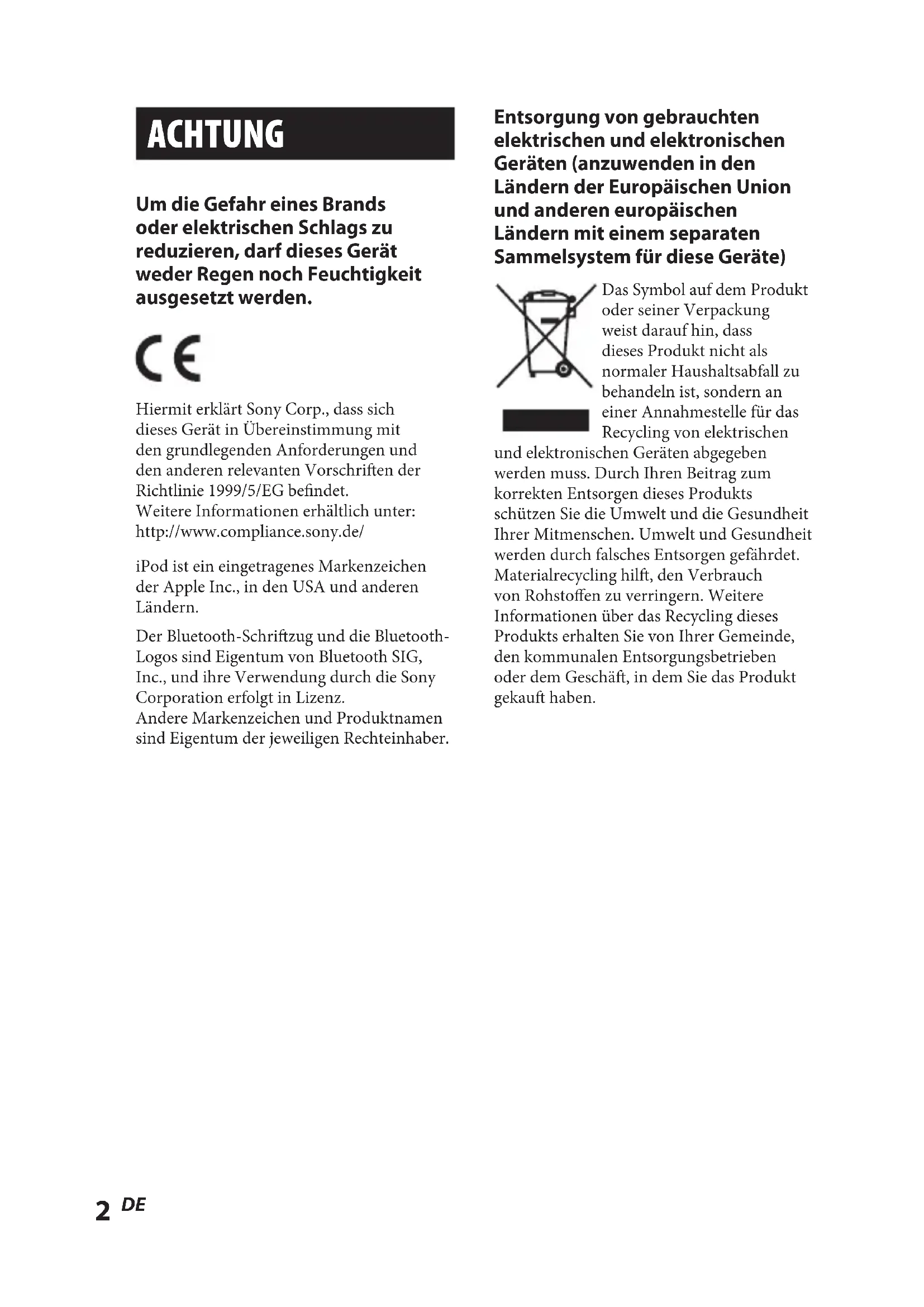 TMR-BT8iP [US,FR,DE,ES] 3-279-360-12(1) TMR-BT8iP [US,FR,DE,ES] 3-279-360-12(1) ACHTUNG Um die Gefahr eines Brands oder elektrischen Schlags zu reduzieren, darf dieses Gerät weder Regen noch Feuchtigkeit ausgesetzt werden. Hiermit erklärt Sony Corp., dass sich dieses Gerät in Übereinstimmung mit den grundlegenden Anforderungen und den anderen relevanten Vorschrien der Richtlinie 1999/5/EG bendet. Weitere Informationen erhältlich unter: http://www.compliance.sony.de/ iPod ist ein eingetragenes Markenzeichen der Apple Inc., in den USA und anderen Ländern. Der Bluetooth-Schrizug und die Bluetooth- Logos sind Eigentum von Bluetooth SIG, Inc., und ihre Verwendung durch die Sony Corporation erfolgt in Lizenz. Andere Markenzeichen und Produktnamen sind Eigentum der jeweiligen Rechteinhaber. Entsorgung von gebrauchten elektrischen und elektronischen Geräten (anzuwenden in den Ländern der Europäischen Union und anderen europäischen Ländern mit einem separaten Sammelsystem für diese Geräte) Das Symbol auf dem Produkt oder seiner Verpackung weist darauf hin, dass dieses Produkt nicht als normaler Haushaltsabfall zu behandeln ist, sondern an einer Annahmestelle für das Recycling von elektrischen und elektronischen Geräten abgegeben werden muss. Durch Ihren Beitrag zum korrekten Entsorgen dieses Produkts schützen Sie die Umwelt und die Gesundheit Ihrer Mitmenschen. Umwelt und Gesundheit werden durch falsches Entsorgen gefährdet. Materialrecycling hil, den Verbrauch von Rohstoen zu verringern. Weitere Informationen über das Recycling dieses Produkts erhalten Sie von Ihrer Gemeinde, den kommunalen Entsorgungsbetrieben oder dem Geschä, in dem Sie das Produkt gekau haben.TMR-BT8iP [US,FR,DE,ES] 3-279-360-12(1)