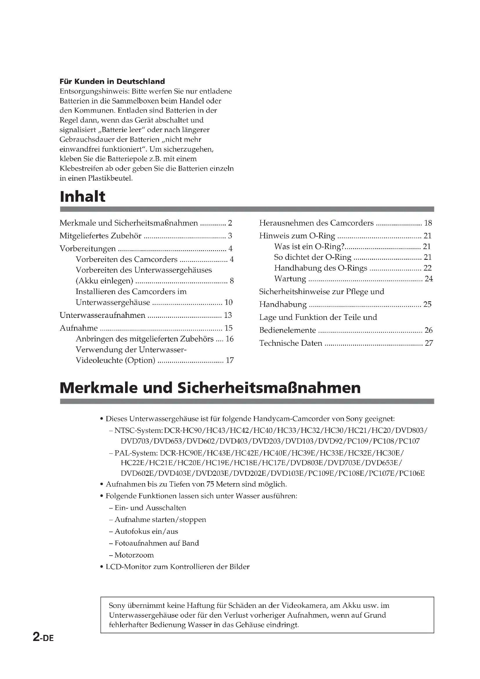 - LCD-Monitor zum Kontrollieren der Bilder Sony übernimmt keine Haftung für Schäden an der Videokamera, am Akku usw. im Unterwassergehäuse oder für den Verlust vorheriger Aufnahmen, wenn auf Grund fehlerhafter Bedienung Wasser in das Gehäuse eindringt. Inhalt Merkmale und Sicherheitsmaßnahmen ............. 2 Mitgeliefertes Zubehör ......................................... 3 Vorbereitungen ...................................................... 4 Vorbereiten des Camcorders ........................ 4 Vorbereiten des Unterwassergehäuses (Akku einlegen) .............................................. 8 Installieren des Camcorders im Unterwassergehäuse ................................... 10 Unterwasseraufnahmen ..................................... 13 Aufnahme ............................................................. 15 Anbringen des mitgelieferten Zubehörs .... 16 Verwendung der Unterwasser- Videoleuchte (Option) ................................. 17 Herausnehmen des Camcorders ....................... 18 Hinweis zum O-Ring .......................................... 21 Was ist ein O-Ring?...................................... 21 So dichtet der O-Ring .................................. 21 Handhabung des O-Rings .......................... 22 Wartung ......................................................... 24 Sicherheitshinweise zur Pflege und Handhabung ........................................................ 25 Lage und Funktion der Teile und Bedienelemente .................................................... 26 Technische Daten ................................................. 27 Für Kunden in Deutschland Entsorgungshinweis: Bitte werfen Sie nur entladene Batterien in die Sammelboxen beim Handel oder den Kommunen. Entladen sind Batterien in der Regel dann, wenn das Gerät abschaltet und signalisiert „Batterie leer“ oder nach längerer Gebrauchsdauer der Batterien „nicht mehr einwandfrei funktioniert“. Um sicherzugehen, kleben Sie die Batteriepole z.B. mit einem Klebestreifen ab oder geben Sie die Batterien einzeln in einen Plastikbeutel.3-DE