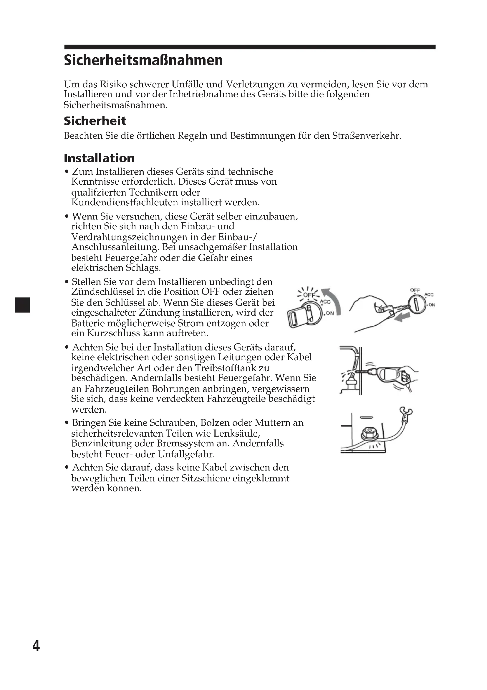 - Achten Sie bei der Installation dieses Geräts darauf, keine elektrischen oder sonstigen Leitungen oder Kabel irgendwelcher Art oder den Treibstofftank zu beschädigen. Andernfalls besteht Feuergefahr. Wenn Sie an Fahrzeugteilen Bohrungen anbringen, vergewissern Sie sich, dass keine verdeckten Fahrzeugteile beschädigt werden.