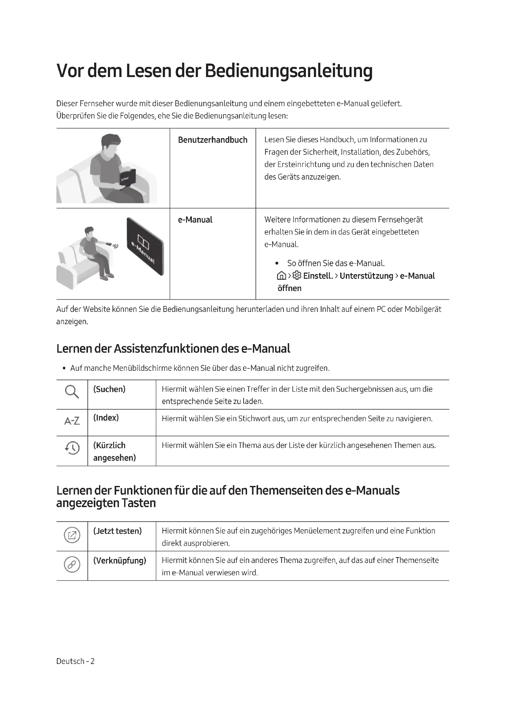 - So öffnen Sie das e-Manual. > Einstell. > Unterstützung > e-Manual öffnen Auf der Website können Sie die Bedienungsanleitung herunterladen und ihren Inhalt auf einem PC oder Mobilgerät anzeigen. Lernen der Assistenzfunktionen des e-Manual