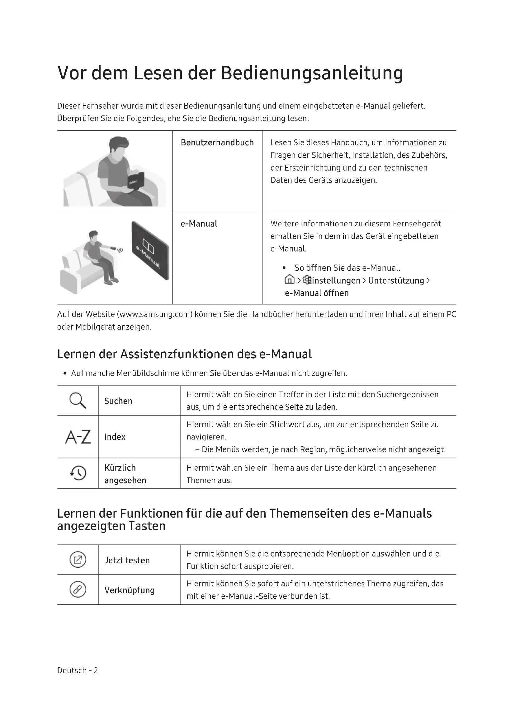 - So öffnen Sie das e-Manual. > Einstellungen > Unterstützung > e-Manual öffnen Auf der Website (www.samsung.com) können Sie die Handbücher herunterladen und ihren Inhalt auf einem PC oder Mobilgerät anzeigen. Lernen der Assistenzfunktionen des e-Manual