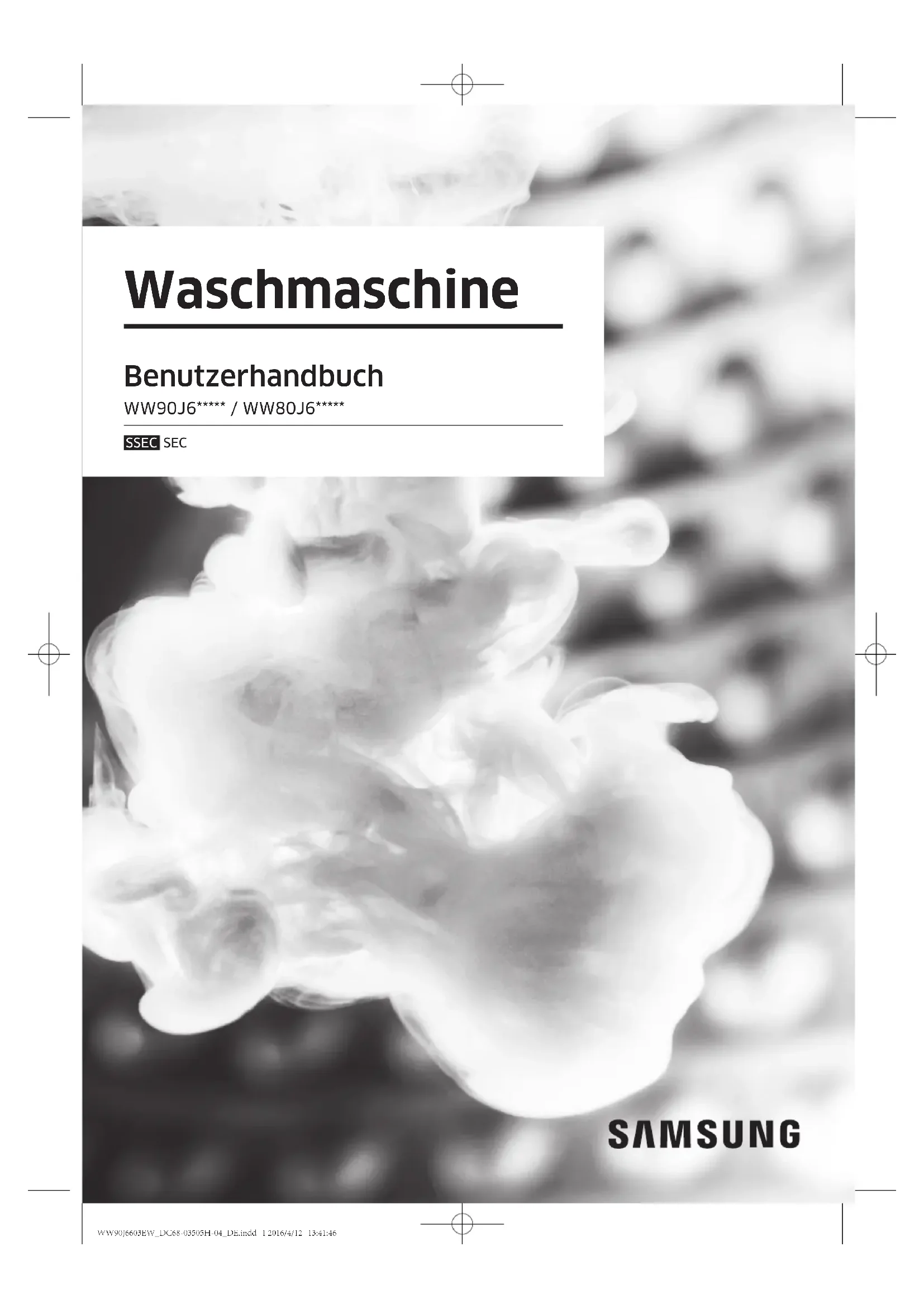 Waschmaschine Benutzerhandbuch WW90J6***** / WW80J6***** SSEC SEC WW90J6603EW_DC68-03505H-04_DE.indd 1 2016/4/12 13:41:462 Deutsch Inhalt Inhalt Sicherheitsinformationen 3 Wichtige Informationen zu den Sicherheitshinweisen 3 Wichtige Sicherheitssymbole 3 Wichtige Sicherheitsvorkehrungen 4 Hinweise zum WEEE-Zeichen 12 Installation 13 Das ist inbegriffen 13 Installationsanforderungen 15 Schrittweise Installation 17 Vor dem Start 23 Grundeinstellungen 23 Waschhinweise 24 Richtlinien Waschmittelbehälter 26 Betrieb 29 Bedienfeld 29 Einfache Schritte für den Start 31 Programmübersicht 32 Wartung 35 Einstellungen 35 TROMMELREINIGUNG 36 Smart check 37 Notablauf 38 Reinigung 39 Wiederherstellung nach Einfrieren 42 Sorgen Sie dafür, dass sie nicht über längere Zeit nicht genutzt wird 42 Fehlersuche 43 Prüfpunkte 43 Fehlercodes 48 Technische Daten 51 Erklärung der Pegesymbole 51 Entsorgung von Altgeräten 52 Lastenheft 53 Informationen zu den Hauptwaschprogrammen 57 WW90J6603EW_DC68-03505H-04_DE.indd 2 2016/4/12 13:41:46Deutsch 3 Sicherheitsinformationen Sicherheitsinformationen Wir beglückwünschen Sie zum Kauf Ihrer neuen Samsung Waschmaschine. Diese Anleitung enthält wichtige Informationen über die Installation, den Gebrauch und die Pege Ihrer Waschmaschine. Bitte lesen Sie diese Bedienungsanleitung in Ruhe durch – nur so können Sie von den vielfältigen Funktionen und Vorteilen Ihrer Waschmaschine protieren. Wichtige Informationen zu den Sicherheitshinweisen Lesen Sie bitte diese Bedienungsanleitung sorgfältig durch, damit Sie verstehen, wie die umfangreichen Features und Funktionen Ihres neuen Gerätes sicher und efzient genutzt werden. Bitte bewahren Sie das Handbuch als künftige Referenz an einem sicheren Ort in der Nähe des Geräts auf. Verwenden Sie die Waschmaschine nur für den in der vorliegenden Bedienungsanleitung angegebenen Zweck. Die in dieser Bedienungsanleitung enthaltenen Warnhinweise und die wichtigen Sicherheitshinweise decken nicht alle Bedingungen und Situationen, die auftreten können, ab. Es liegt in Ihrer Verantwortung, bei Installation, Pege und Gebrauch Ihrer Waschmaschine Ihren gesunden Menschenverstand sowie Vorsicht und Sorgfalt walten zu lassen. Die vorliegende Bedienungsanleitung gilt für mehrere Modelle; Ihre Waschmaschine kann deshalb leicht von der in dieser Bedienungsanleitung beschriebenen Maschine abweichen und manche Warnzeichen gelten unter Umständen für Sie nicht. Bei Fragen oder Unklarheiten wenden Sie sich bitte an Ihr nächstes Servicezentrum oder informieren Sie sich unter www.samsung.com. Wichtige Sicherheitssymbole Bedeutung der Symbole und Zeichen in diesem Benutzerhandbuch: WARNUNG Gefahren oder unsichere Handlungsweisen, die zu schweren oder tödlichen Verletzungen und/ oder Sachbeschädigung führen können. VORSICHT Gefahren oder unsichere Handlungsweisen, die zu Verletzungen und/oder Sachbeschädigung führen können. HINWEIS Zeigt an, dass ein Personen- oder Sachschadenrisiko besteht. WW90J6603EW_DC68-03505H-04_DE.indd 3 2016/4/12 13:41:474 Deutsch Sicherheitsinformationen Sicherheitsinformationen Diese Warnzeichen sollen Sie und andere vor Verletzungen schützen. Bitte halten Sie sie genau ein. Bewahren Sie dieses Handbuch als künftige Referenz an einem sicheren Ort auf, nachdem Sie es gelesen haben. Lesen Sie alle Anweisungen aufmerksam durch, ehe Sie Ihre Waschmaschine benutzen. Wie bei jedem Gerät, das mit elektrischem Strom betrieben wird, gibt es gewisse Gefahren. Für den sicheren Betrieb dieses Geräts machen Sie sich mit der Bedienung vertraut und benutzen es mit entsprechender Vorsicht. Wichtige Sicherheitsvorkehrungen WARNUNG Um das Risiko von Feuer, Stromschlag oder Personenschäden bei Verwendung Ihres Geräts zu reduzieren, befolgen Sie grundlegende Vorsichtsmaßnahmen, einschließlich der folgenden: