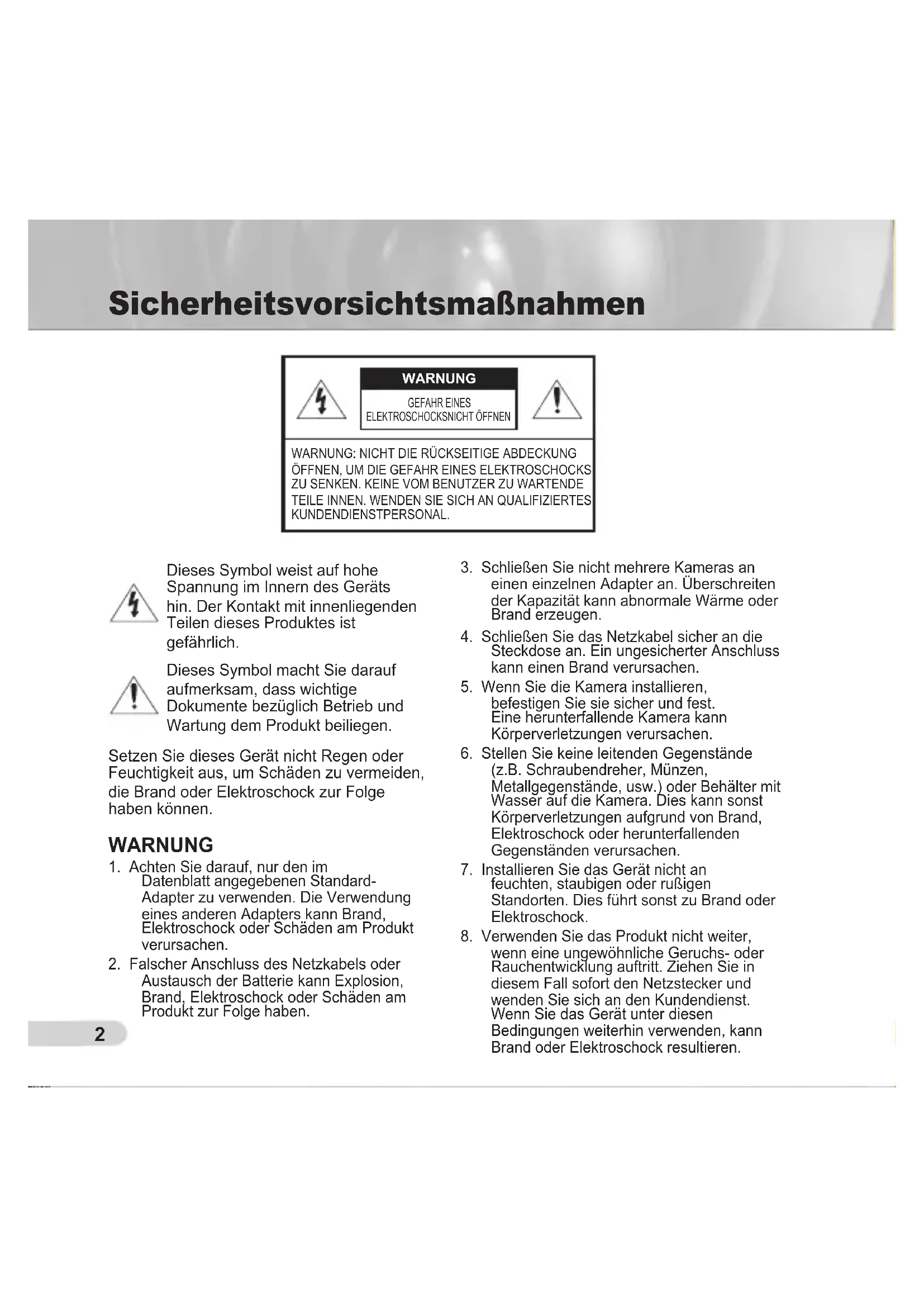 (z.B. Schraubendreher, Münzen, Metallgegenstände, usw.) oder Behälter mit Wasser auf die Kamera. Dies kann sonst Körperverletzungen aufgrund von Brand, Elektroschock oder herunterfallenden Gegenständen verursachen.