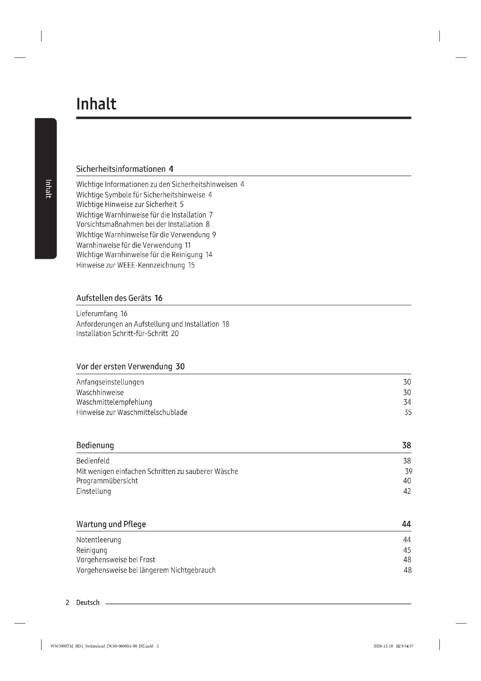 - Andernfalls besteht die Gefahr eines Stromschlags oder Brands aufgrund von Fehlströmen. WW3000TM_8KG_Switzerland_DC68-00000A-00_DE.indd 8WW3000TM_8KG_Switzerland_DC68-00000A-00_DE.indd 8 2020-12-18 9:34:392020-12-18 9:34:39Deutsch 9 Sicherheitsinformationen Stellen Sie Ihr Gerät auf einem festen und ebenen Untergrund auf, der das Gewicht tragen kann.