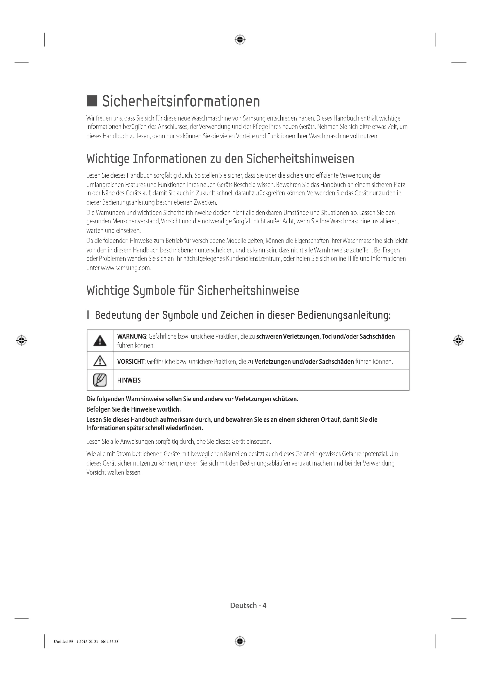 - Ihre Waschmaschine auf einen Blick Untitled-99 3 2015-01-21 4:53:28Deutsch - 4 Sicherheitsinformationen Wir freuen uns, dass Sie sich für diese neue Waschmaschine von Samsung entschieden haben. Dieses Handbuch enthält wichtige Informationen bezüglich des Anschlusses, der Verwendung und der Pflege Ihres neuen Geräts. Nehmen Sie sich bitte etwas Zeit, um dieses Handbuch zu lesen, denn nur so können Sie die vielen Vorteile und Funktionen Ihrer Waschmaschine voll nutzen. Wichtige Informationen zu den Sicherheitshinweisen Lesen Sie dieses Handbuch sorgfältig durch. So stellen Sie sicher, dass Sie über die sichere und effiziente Verwendung der umfangreichen Features und Funktionen Ihres neuen Geräts Bescheid wissen. Bewahren Sie das Handbuch an einem sicheren Platz in der Nähe des Geräts auf, damit Sie auch in Zukunft schnell darauf zurückgreifen können. Verwenden Sie das Gerät nur zu den in dieser Bedienungsanleitung beschriebenen Zwecken. Die Warnungen und wichtigen Sicherheitshinweise decken nicht alle denkbaren Umstände und Situationen ab. Lassen Sie den gesunden Menschenverstand, Vorsicht und die notwendige Sorgfalt nicht außer Acht, wenn Sie Ihre Waschmaschine installieren, warten und einsetzen. Da die folgenden Hinweise zum Betrieb für verschiedene Modelle gelten, können die Eigenschaften Ihrer Waschmaschine sich leicht von den in diesem Handbuch beschriebenen unterscheiden, und es kann sein, dass nicht alle Warnhinweise zutreffen. Bei Fragen oder Problemen wenden Sie sich an Ihr nächstgelegenes Kundendienstzentrum, oder holen Sie sich online Hilfe und Informationen unter www.samsung.com. Wichtige Symbole für Sicherheitshinweise Bedeutung der Symbole und Zeichen in dieser Bedienungsanleitung: WARNUNG: Gefährliche bzw. unsichere Praktiken, die zu schweren Verletzungen, Tod und/oder Sachschäden führen können. VORSICHT: Gefährliche bzw. unsichere Praktiken, die zu Verletzungen und/oder Sachschäden führen können. HINWEIS Die folgenden Warnhinweise sollen Sie und andere vor Verletzungen schützen. Befolgen Sie die Hinweise wörtlich. Lesen Sie dieses Handbuch aufmerksam durch, und bewahren Sie es an einem sicheren Ort auf, damit Sie die Informationen später schnell wiederfinden. Lesen Sie alle Anweisungen sorgfältig durch, ehe Sie dieses Gerät einsetzen. Wie alle mit Strom betriebenen Geräte mit beweglichen Bauteilen besitzt auch dieses Gerät ein gewisses Gefahrenpotenzial. Um dieses Gerät sicher nutzen zu können, müssen Sie sich mit den Bedienungsabläufen vertraut machen und bei der Verwendung Vorsicht walten lassen. Untitled-99 4 2015-01-21 4:53:28Deutsch - 5 01 SICHERHEITSINFORMATIONEN Wichtige Hinweise zur Sicherheit WARNUNG: Um die Gefahr von Bränden, Stromschlägen und anderen Verletzungen beim Einsatz Ihrer Waschmaschine zu vermindern, beachten Sie die folgenden Sicherheitsregeln: Erlauben Sie nicht, dass Kinder (oder Haustiere) in oder auf der Waschmaschine spielen. Die Tür der Waschmaschine lässt sich von innen nicht leicht öffnen, und Kinder können ernsthaft verletzt werden, wenn Sie im Innern eingeschlossen sind. Dieses Gerät darf nicht von Personen (auch Kinder) mit verminderten körperlichen, sensorischen oder geistigen Fähigkeiten oder einem Mangel an Erfahrung und Wissen verwendet werden. Von dieser Regel darf nur abgewichen werden, wenn diese Personen unter Aufsicht stehen oder durch eine für ihre Sicherheit verantwortliche Person eine Unterweisung zur Bedienung des Geräts erhalten haben. Kinder müssen beaufsichtigt werden, damit sie nicht mit dem Gerät spielen können. Zur Verwendung in Europa: Dieses Gerät kann von Kindern ab 8 Jahren und Personen mit verminderten körperlichen, sensorischen oder geistigen Fähigkeiten oder einem Mangel an Erfahrung und Wissen nur bedient werden, wenn sie unter Aufsicht stehen oder eine Unterweisung zum sicheren Umgang mit dem Gerät erhalten haben und die damit verbundenen Gefahren verstehen. Kinder dürfen nicht mit dem Gerät spielen. Kinder dürfen das Gerät nur unter Aufsicht reinigen oder warten. Falls das Netzkabel beschädigt ist, muss es vom Hersteller oder vom Kundendienst bzw. von einer entsprechend qualifizierten Fachkraft ausgetauscht werden, um Gefährdungen auszuschließen. Stellen Sie das Gerät so auf, dass der Netzstecker, der Wasserzulauf und die Abflussrohre zugänglich sind. Wenn das Gerät am Boden Ventilationsöffnungen besitzt, müssen Sie darauf achten, dass diese nicht durch Teppich verdeckt werden. Es sind die neuen mit dem Gerät gelieferten Schlauchsets zu verwenden und die alten dürfen nicht wiederverwendet werden. VORSICHT: Um die Gefahr eines unbeabsichtigten Zurücksetzens der thermischen Abschaltung zu verhindern, darf das Gerät nicht mit einem externen Schalter, wie z. B. einem Timer, ausgestattet oder an einen Schaltkreis angeschlossen werden, der von den Versorgungsunternehmen regelmäßig ein- bzw. ausgeschaltet wird. Untitled-99 5 2015-01-21 4:53:28Deutsch - 6 WARNUNG: Wichtige Warnhinweise für die Installation Die Installation dieses Geräts muss von einem qualifizierten Techniker oder einem dazu befugten Dienstleister durchgeführt werden. p. 41