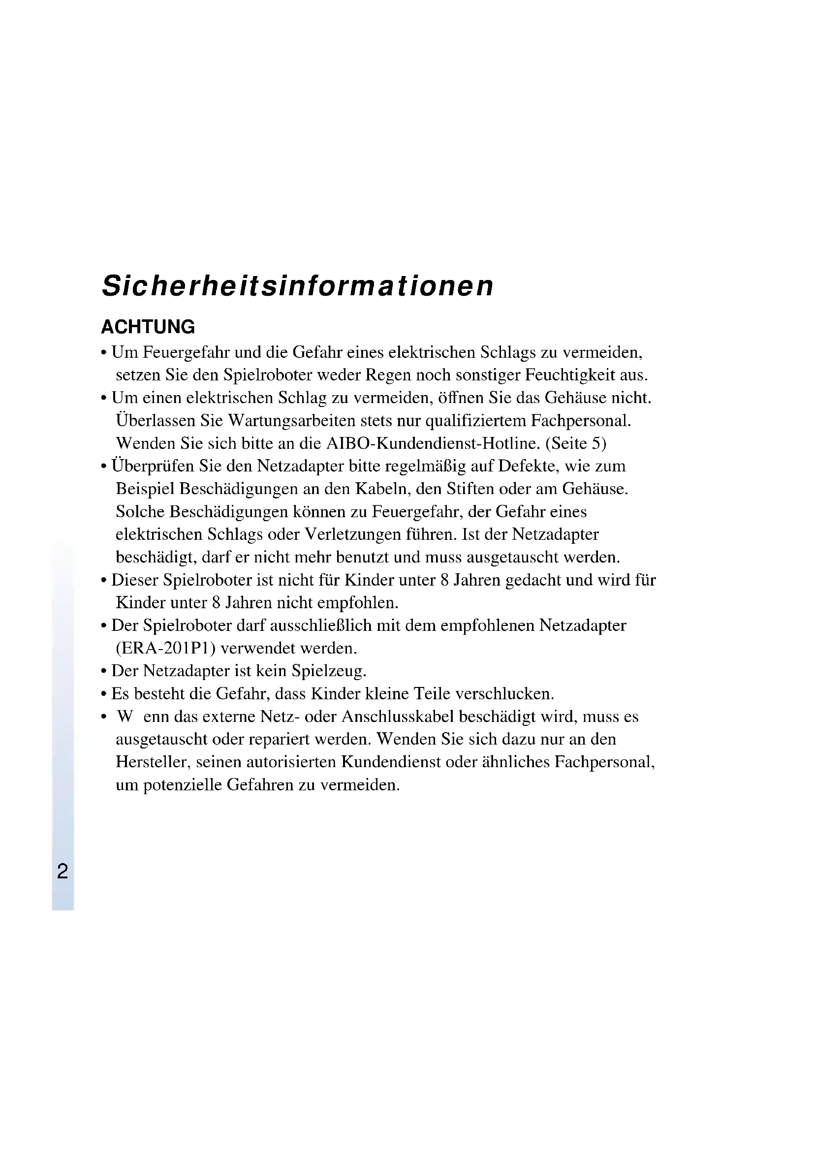- Um einen elektrischen Schlag zu vermeiden, öffnen Sie das Gehäuse nicht. Überlassen Sie Wartungsarbeiten stets nur qualifiziertem Fachpersonal. Wenden Sie sichitte an die AIBO-Kundendienst-Hotline. (Seite 5)
