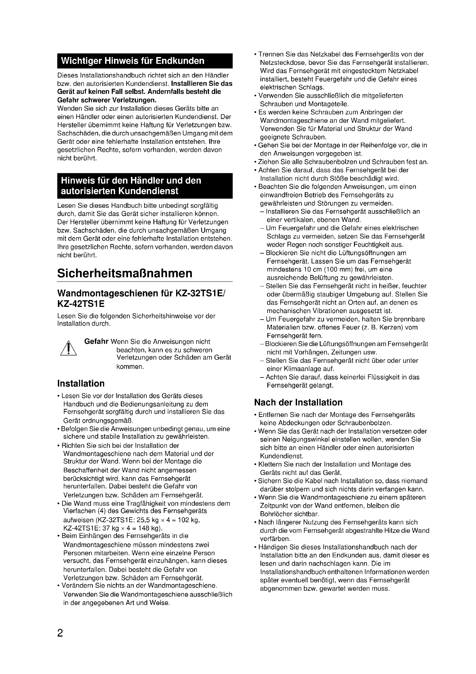 Die Wand muss eine Tragfähigkeit von mindestens dem Vierfachen (4) des Gewichts des Fernsehgerats aufweisen (KZ-32TS1E: 25,5kg× 4 = 102kg, KZ-42TS1E: 37kg× 4 = 148kg) - Beim Einhängen des Fernsehgeräts in die Wandmontageschiene müssen mindestens zwei Personen mitarbeiten. Wenn eine einzeln Person versucht, das Fernsehgeber einzuhängen, kann diese herunterfallen. Dabei besteht die Gefahr von Verletzungen bzw. Schaden am Fernsehgeber.