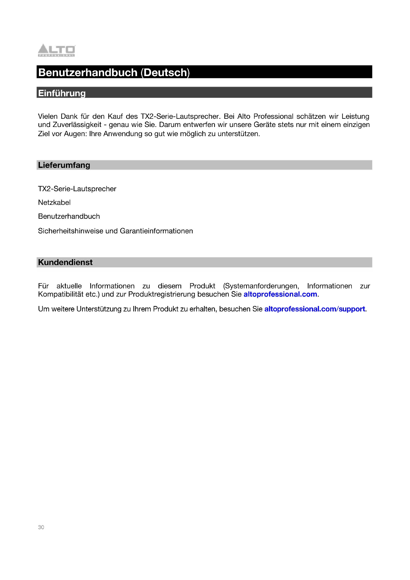 Benutzerhandbuch (Deutsch) Einführung Vielen Dank für den Kauf des TX2-Serie-Lautsprecher. Bei Alto Professional schätzen wir Leistung und Zuverlässigkeit - genau wie Sie. Darum entwerfen wir unsere Geräte stets nur mit einem einzigen Ziel vor Augen: Ihre Anwendung so gut wie möglich zu unterstützen.