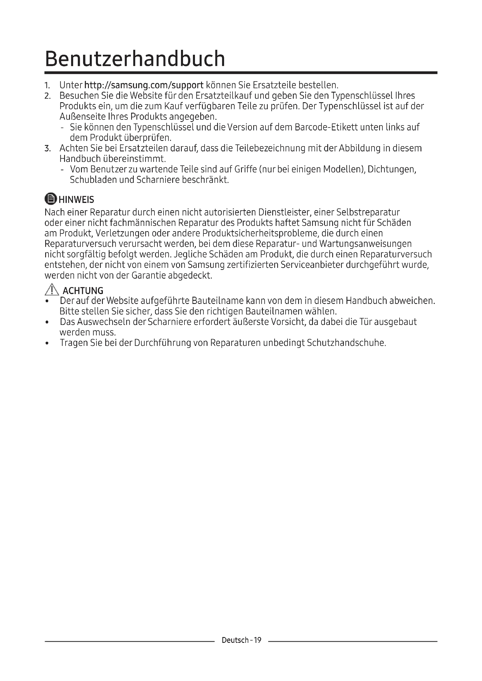 Handbuch übereinstimmt. ‐ Vom Benutzer zu wartende Teile sind auf Griffe (nur bei einigen Modellen), Dichtungen, Schubladen und Scharniere beschränkt. HINWEIS Nach einer Reparatur durch einen nicht autorisierten Dienstleister, einer Selbstreparatur oder einer nicht fachmännischen Reparatur des Produkts haftet Samsung nicht für Schäden am Produkt, Verletzungen oder andere Produktsicherheitsprobleme, die durch einen Reparaturversuch verursacht werden, bei dem diese Reparatur- und Wartungsanweisungen nicht sorgfältig befolgt werden. Jegliche Schäden am Produkt, die durch einen Reparaturversuch entstehen, der nicht von einem von Samsung zertifizierten Serviceanbieter durchgeführt wurde, werden nicht von der Garantie abgedeckt. ACHTUNG