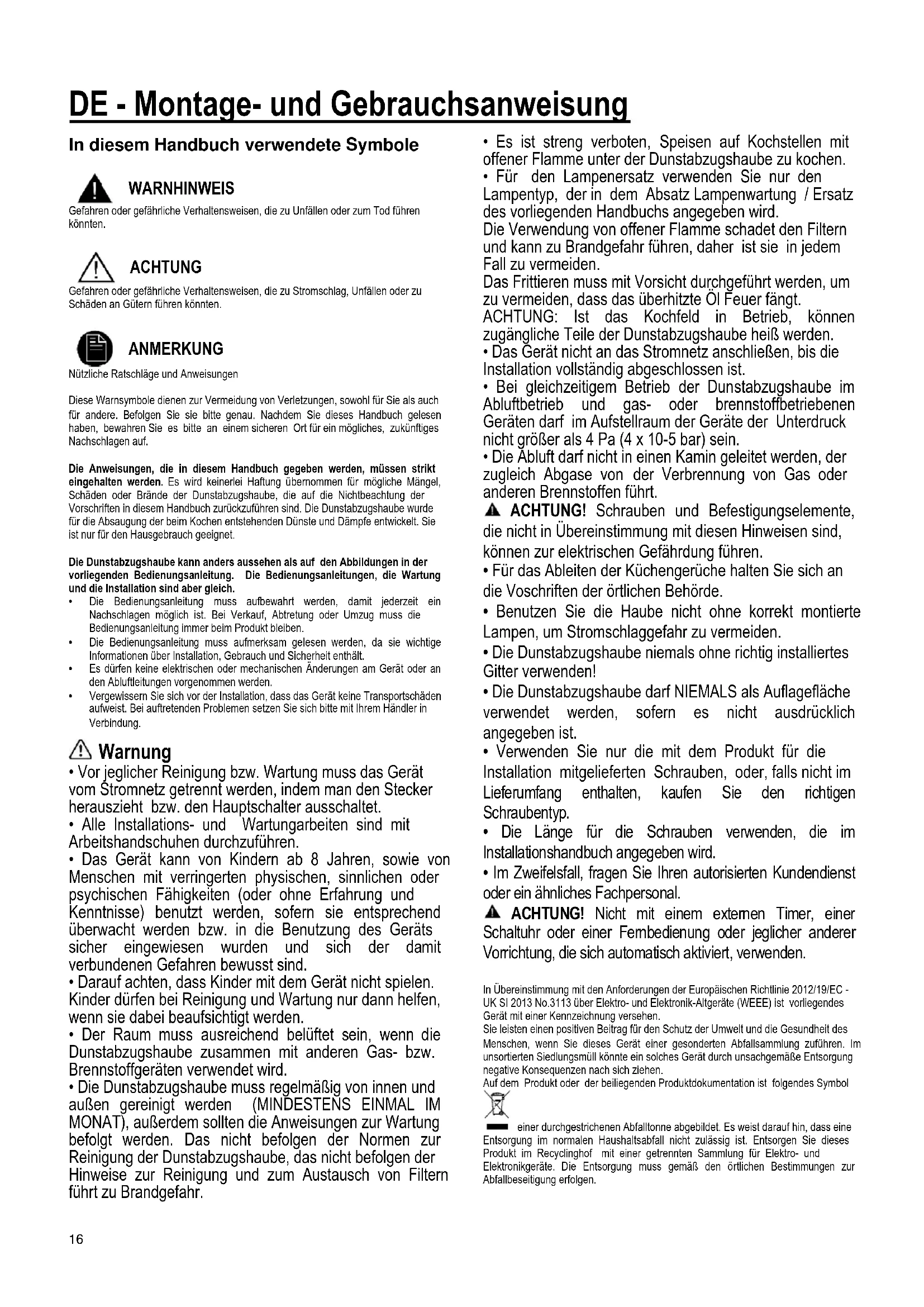 ANMERKUNG Nützliche Ratschläge und Anweisungen Diese Warnsymbole dienen zur Vermeidung von Verletzungen, sowohl für Sie als auch für andere. Befolgen Sie sie bitte genau. Nachdem Sie dieses Handbuch gelesen haben, bewahren Sie es bitte an einem sicheren Ort für ein mögliches, zukünftiges Nachschlagen auf. Die Anweisungen, die in diesem Handbuch gegeben werden, müssen strikt eingehalten werden. Es wird keinerlei Haftung übernommen für mögliche Mängel, Schäden oder Brände der Dunstabzugshaube, die auf die Nichtbeachtung der Vorschriften in diesem Handbuch zurückzuführen sind. Die Dunstabzugshaube wurde für die Absaugung der beim Kochen entstehenden Dünste und Dämpfe entwickelt. Sie ist nur für den Hausgebrauch geeignet. Die Dunstabzugshaube kann anders aussehen als auf den Abbildungen in der vorliegenden Bedienungsanleitung. Die Bedienungsanleitungen, die Wartung und die Installation sind aber gleich.