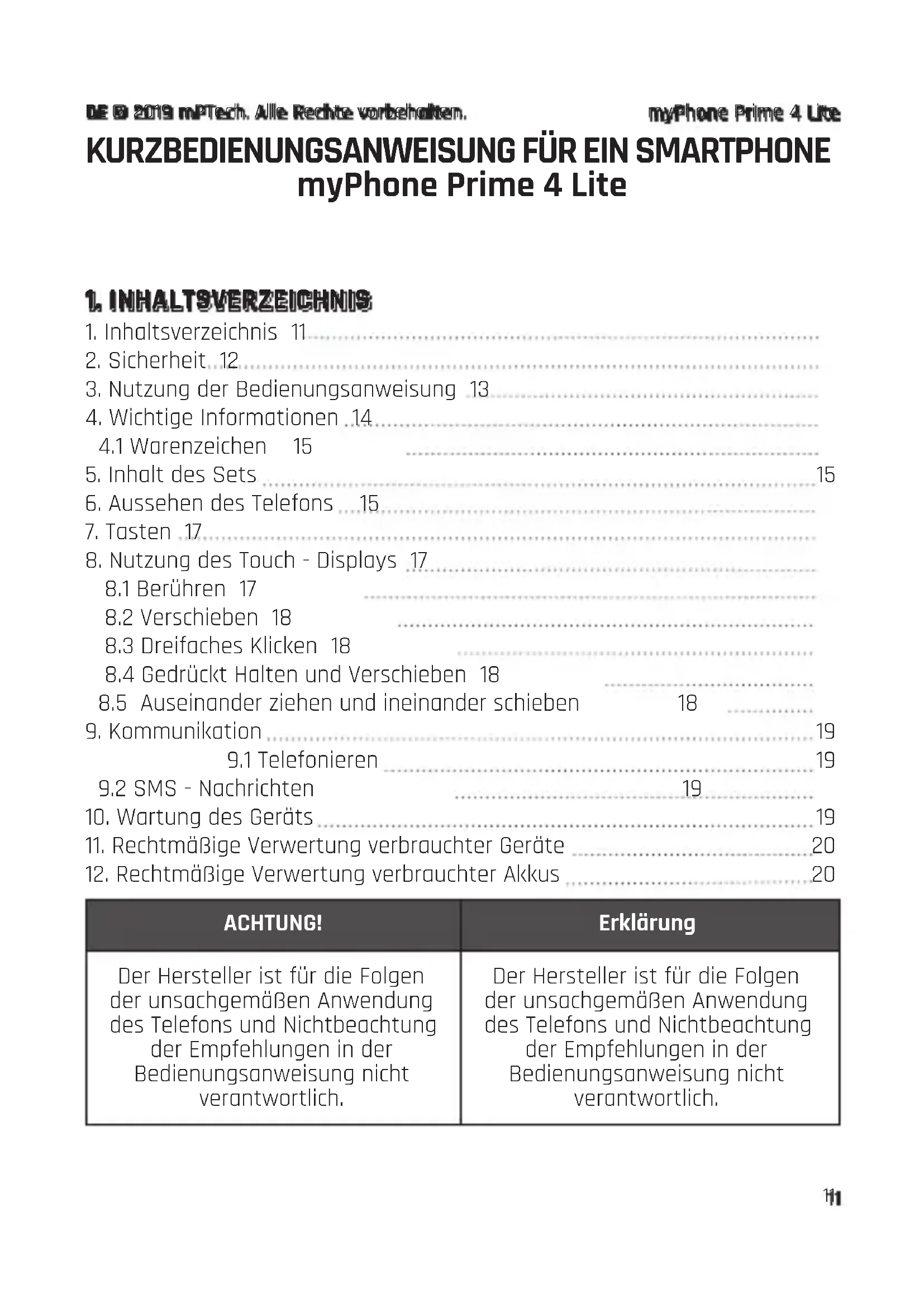 ACHTUNG! Erklärung Der Hersteller ist für die Folgen der unsachgemäßen Anwendung des Telefons und Nichtbeachtung der Empfehlungen in der Bedienungsanweisung nicht verantwortlich. Der Hersteller ist für die Folgen der unsachgemäßen Anwendung des Telefons und Nichtbeachtung der Empfehlungen in der Bedienungsanweisung nicht verantwortlich.DE © 2019 mPTech. Alle Rechte vorbehalten.