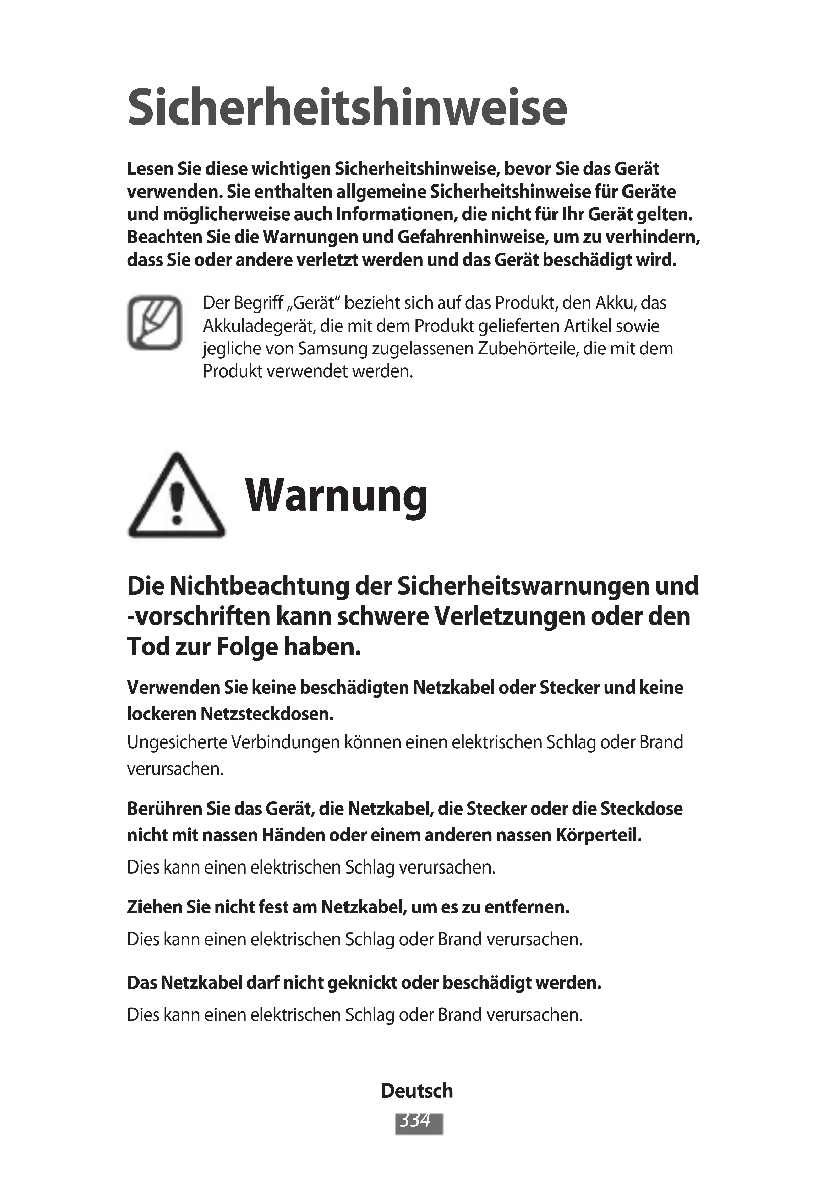 Sicherheitshinweise Lesen Sie diese wichtigen Sicherheitshinweise, bevor Sie das Gerät verwenden. Sie enthalten allgemeine Sicherheitshinweise für Geräte und möglicherweise auch Informationen, die nicht für Ihr Gerät gelten. Beachten Sie die Warnungen und Gefahrenhinweise, um zu verhindern, dass Sie oder andere verletzt werden und das Gerät beschädigt wird.Der Begriff „Gerät“ bezieht sich auf das Produkt, den Akku, das Akkuladegerät, die mit dem Produkt gelieferten Artikel sowie jegliche von Samsung zugelassenen Zubehörteile, die mit dem Produkt verwendet werden. Warnung Die Nichtbeachtung der Sicherheitswarnungen und -vorschriften kann schwere Verletzungen oder den Tod zur Folge haben. Verwenden Sie keine beschädigten Netzkabel oder Stecker und keine lockeren Netzsteckdosen.Ungesicherte Verbindungen können einen elektrischen Schlag oder Brand verursachen.Berühren Sie das Gerät, die Netzkabel, die Stecker oder die Steckdose nicht mit nassen Händen oder einem anderen nassen Körperteil.Dies kann einen elektrischen Schlag verursachen.Ziehen Sie nicht fest am Netzkabel, um es zu entfernen.Dies kann einen elektrischen Schlag oder Brand verursachen.Das Netzkabel darf nicht geknickt oder beschädigt werden.Dies kann einen elektrischen Schlag oder Brand verursachen.Deutsch
