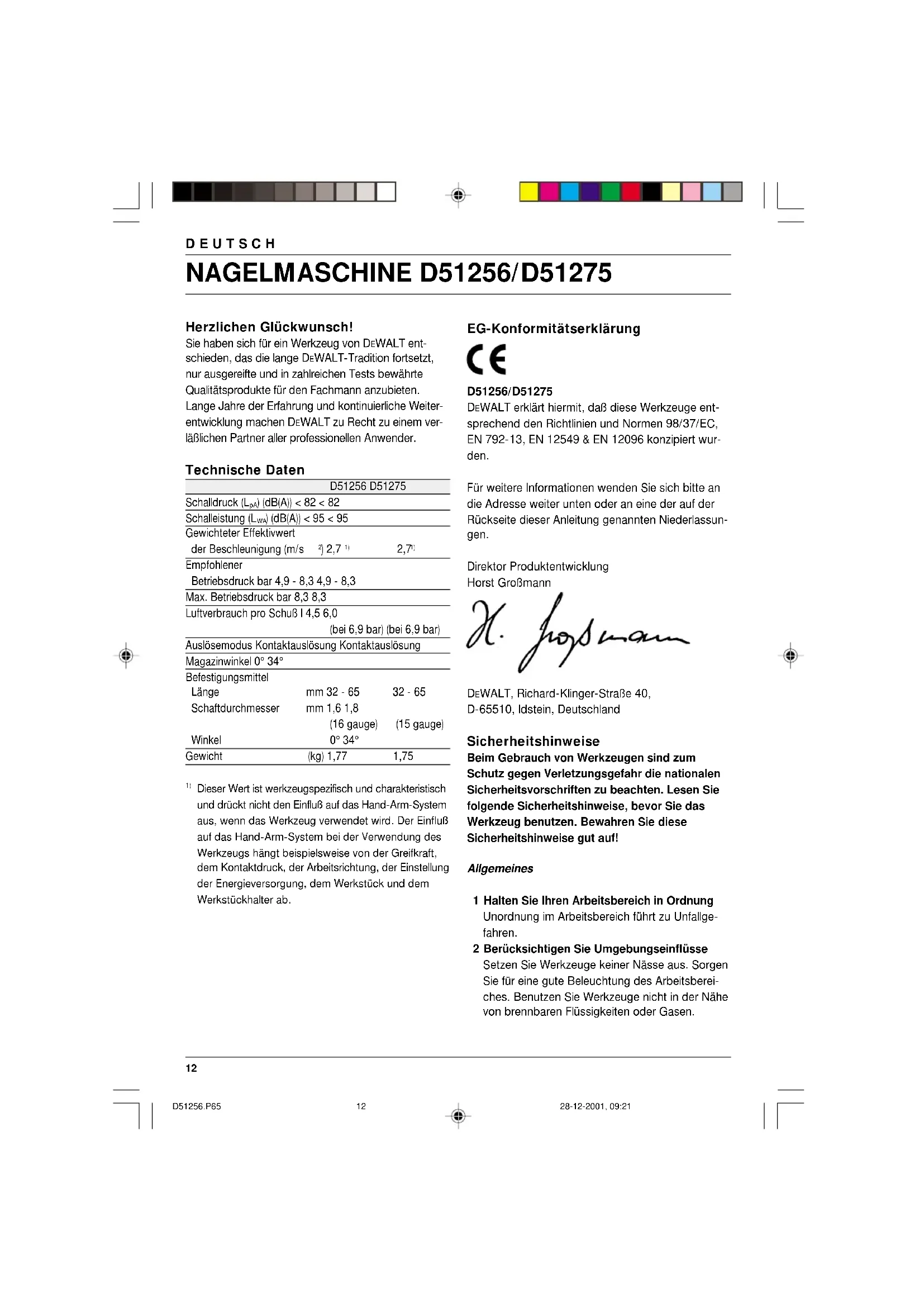 Dieser Wert ist werkzeugspezifisch und charakteristisch und drückt nicht den Einfluß auf das Hand-Arm-System aus, wenn das Werkzeug verwendet wird. Der Einfluß auf das Hand-Arm-System bei der Verwendung des Werkzeugs hängt beispielsweise von der Greifkraft, dem Kontaktdruck, der Arbeitsrichtung, der Einstellung der Energieversorgung, dem Werkstück und dem Werkstückhalter ab. EG-Konformitätserklärung D51256/D51275 DEWALT erklärt hiermit, daß diese Werkzeuge ent- sprechend den Richtlinien und Normen 98/37/EC, EN 792-13, EN 12549 & EN 12096 konzipiert wur- den. Für weitere Informationen wenden Sie sich bitte an die Adresse weiter unten oder an eine der auf der Rückseite dieser Anleitung genannten Niederlassun- gen. Direktor Produktentwicklung Horst Großmann DEWALT, Richard-Klinger-Straße 40, D-65510, Idstein, Deutschland Sicherheitshinweise Beim Gebrauch von Werkzeugen sind zum Schutz gegen Verletzungsgefahr die nationalen Sicherheitsvorschriften zu beachten. Lesen Sie folgende Sicherheitshinweise, bevor Sie das Werkzeug benutzen. Bewahren Sie diese Sicherheitshinweise gut auf! Allgemeines 1 Halten Sie Ihren Arbeitsbereich in Ordnung Unordnung im Arbeitsbereich führt zu Unfallge- fahren. 2 Berücksichtigen Sie Umgebungseinflüsse Setzen Sie Werkzeuge keiner Nässe aus. Sorgen Sie für eine gute Beleuchtung des Arbeitsberei- ches. Benutzen Sie Werkzeuge nicht in der Nähe von brennbaren Flüssigkeiten oder Gasen. D51256.P65 28-12-2001, 09:211213 DEUTSCH 3 Halten Sie Kinder fern! Sorgen Sie dafür, daß Kinder oder Besucher das Werkzeug nicht berühren. Jugendliche unter 16 Jahren dürfen das Werkzeug nur unter fachlicher Anleitung benutzen. 4 Bewahren Sie Ihre Werkzeuge sicher auf Unbenutzte Werkzeuge sollten in trockenen, verschlossenen Räumen und für Kinder nicht erreichbar aufbewahrt werden. 5 Tragen Sie geeignete Arbeitskleidung Tragen Sie keine weite Kleidung oder Schmuck. Sie können von sich bewegenden Teilen erfaßt werden. Beim Arbeiten im Freien sind Arbeits- handschuhe und rutschfestes Schuhwerk emp- fehlenswert. Tragen Sie bei langen Haaren ein Haarnetz. 6 Achten Sie auf einen sicheren Stand Achten Sie auf einen sicheren Stand, um in jeder Arbeitsposition das Gleichgewicht zu halten. 7 Seien Sie stets aufmerksam Konzentrieren Sie sich auf Ihre Arbeit. Gehen Sie vernünftig vor. Verwenden Sie das Werkzeug nicht, wenn Sie müde sind. 8 Benutzen Sie das richtige Werkzeug Die bestimmungsgemäße Verwendung ist in dieser Betriebsanleitung beschrieben. Verwenden Sie keine zu schwachen Werkzeuge oder Vor- satzgeräte für schwere Arbeiten. Mit dem richti- gen Werkzeug erzielen Sie eine optimale Qualität und gewährleisten Ihre persönliche Sicherheit. Warnung! Das Verwenden anderer als der in dieser Anleitung empfohlenen Vorsatzgeräte und Zubehörteile oder die Ausführung von Arbeiten mit diesem Werkzeug, die nicht der bestim- mungsgemäßen Verwendung entsprechen, kann zu Unfallgefahren führen. 9 Pflegen Sie Ihre Werkzeuge mit Sorgfalt Halten Sie Ihre Werkzeuge scharf und sauber, um gut und sicher arbeiten zu können. Befolgen Sie die Wartungsvorschriften und die Hinweise für den Werkzeugwechsel. Halten Sie alle Schal- ter trocken, sauber und frei von Öl und Fett. 10 Kontrollieren Sie Ihr Werkzeug auf Beschädigungen Vor Gebrauch ist das Werkzeug auf einwandfreie und bestimmungsgemäße Funktion zu überprü- fen. Überprüfen Sie, ob die beweglichen Teile einwandfrei funktionieren und ob Teile beschädigt sind. Sämtliche Teile müssen richtig montiert sein, um den einwandfreien Betrieb des Werkzeuges zu gewährleisten. Beschädigte Teile und Schutz- vorrichtungen müssen vorschriftsgemäß repariert oder ausgewechselt werden. 11 Lassen Sie Reparaturen nur von einer DEWALT-Kundendienstwerkstatt ausführen Dieses Werkzeug entspricht den einschlägigen Sicherheitsbestimmungen. Reparaturen dürfen nur von einer DEWALT-Kundendienstwerkstatt ausgeführt werden, andernfalls kann Unfallgefahr für den Betreiber entstehen. Zusätzliche Sicherheitsanweisungen für Druckluftnagelmaschinen