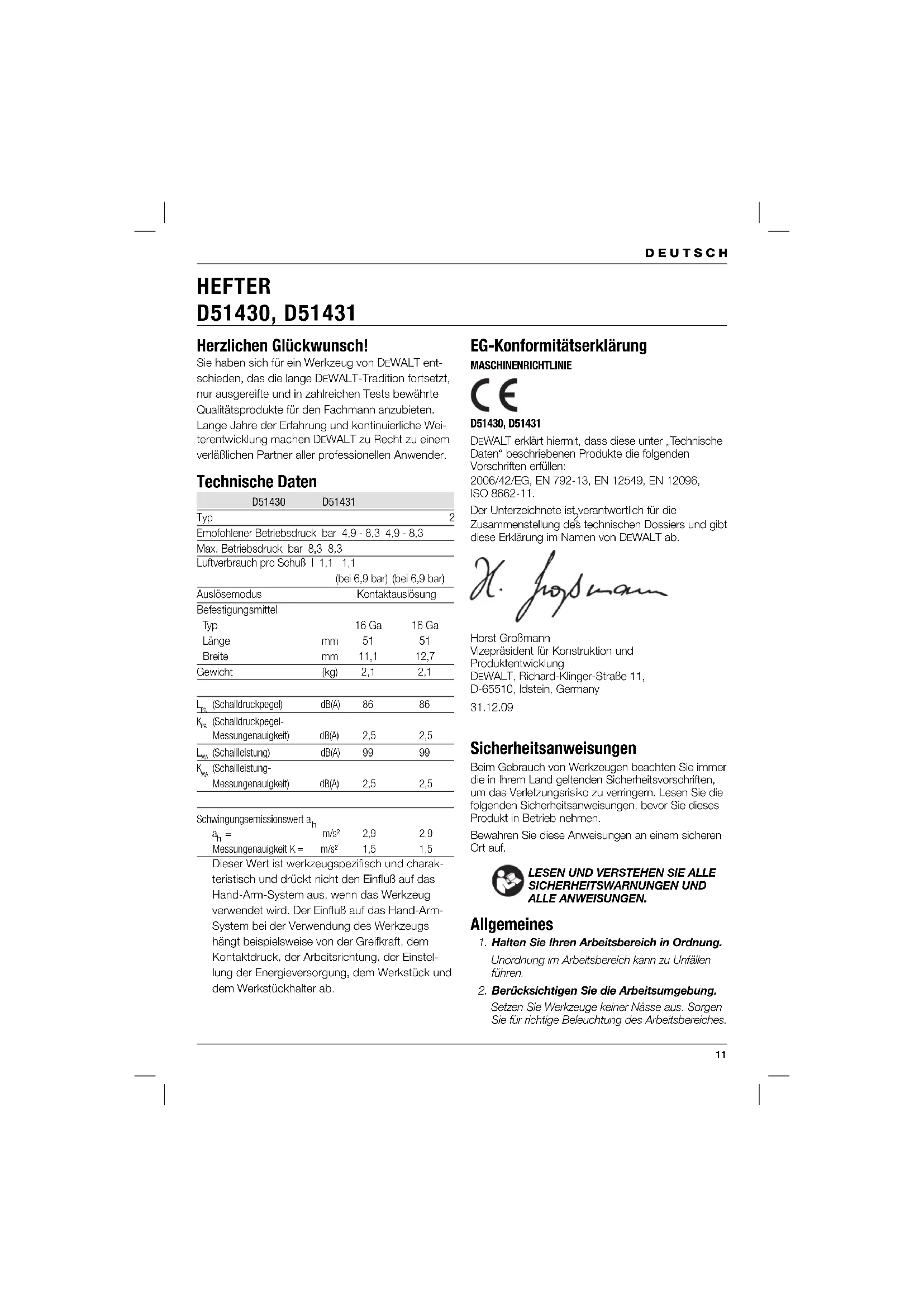 m/s² 2,9 2,9 Messungenauigkeit K = m/s² 1,5 1,5 Dieser Wert ist werkzeugspezifi sch und charak- teristisch und drückt nicht den Einfl uß auf das Hand-Arm-System aus, wenn das Werkzeug verwendet wird. Der Einfl uß auf das Hand-Arm- System bei der Verwendung des Werkzeugs hängt beispielsweise von der Greifkraft, dem Kontaktdruck, der Arbeitsrichtung, der Einstel- lung der Energieversorgung, dem Werkstück und dem Werkstückhalter ab. EG-Konformitätserklärung MASCHINENRICHTLINIE D51430, D51431 DEWALT erklärt hiermit, dass diese unter „Technische Daten“ beschriebenen Produkte die folgenden Vorschriften erfüllen: 2006/42/EG, EN 792-13, EN 12549, EN 12096, ISO 8662-11. Der Unterzeichnete ist verantwortlich für die Zusammenstellung des technischen Dossiers und gibt diese Erklärung im Namen von DEWALT ab. Horst Großmann Vizepräsident für Konstruktion und Produktentwicklung DEWALT, Richard-Klinger-Straße 11, D-65510, Idstein, Germany