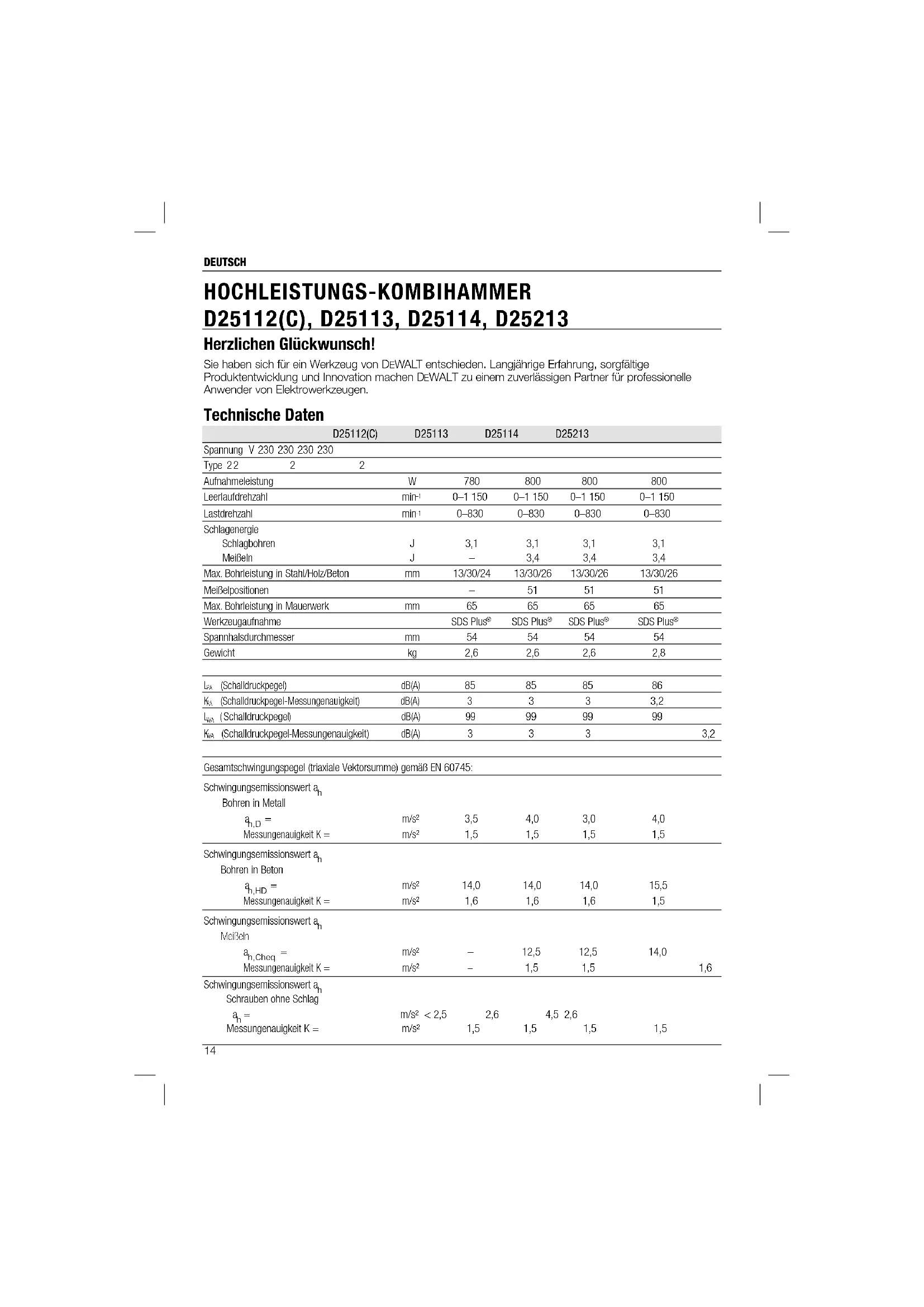 HOCHLEISTUNGS-KOMBIHAMMER D25112(C), D25113, D25114, D25213 Herzlichen Glückwunsch! Sie haben sich für ein Werkzeug von DEWALT entschieden. Langjährige Erfahrung, sorgfältige Produktentwicklung und Innovation machen D EWALT zu einem zuverlässigen Partner für professionelle Anwender von Elektrowerkzeugen. Technische Daten D25112(C) D25113 D25114 D25213 Spannung V 230 230 230 230 Type 2 2 2 2 Aufnahmeleistung W 780 800 800 800 Leerlaufdrehzahl min