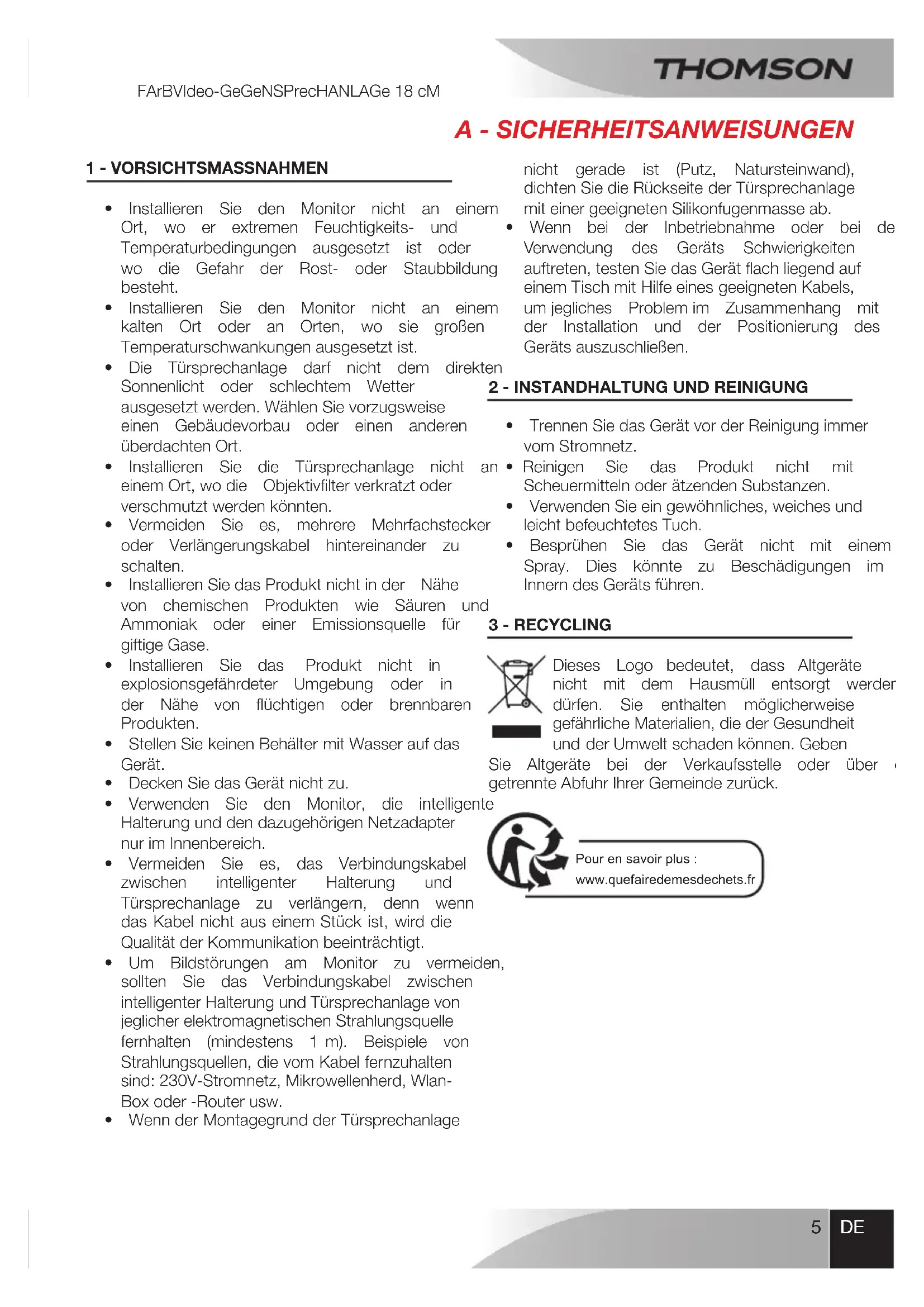 Dieses Logo bedeutet, dass Altgeräte nicht mit dem Hausmüll entsorgt werden dürfen. Sie enthalten möglicherweise gefährlicheMaterialien,diederGesundheit undderUmweltschadenkönnen.Geben Sie Altgeräte bei der Verkaufsstelle oder über die getrennteAbfuhrIhrerGemeindezurück. Pour en savoir plus : www.quefairedemesdechets.frFarbvideo-GeGensprechanlaGe 18 cm