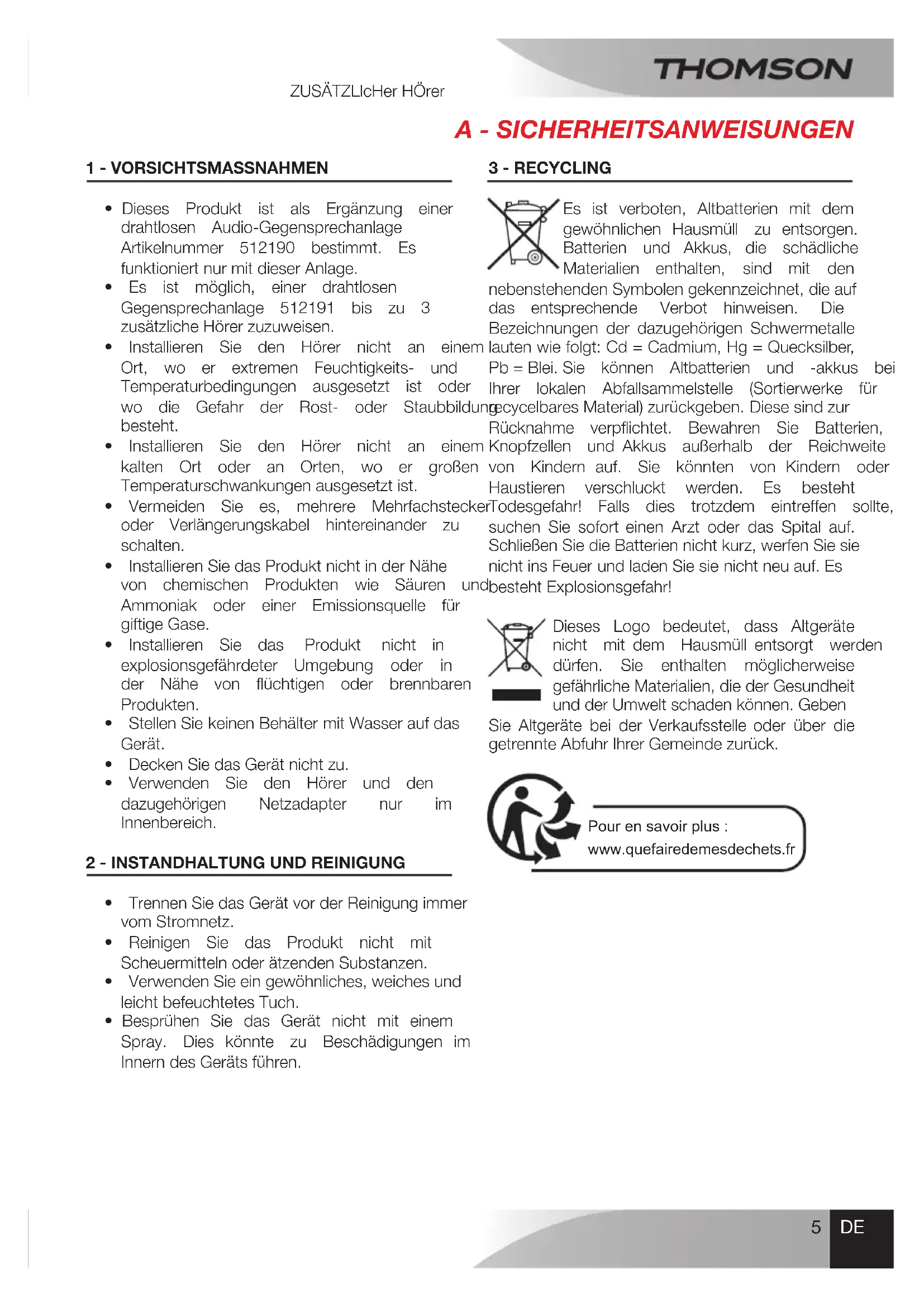 Es ist verboten, Altbatterien mit dem gewöhnlichen Hausmüll zu entsorgen. Batterien und Akkus, die schädliche Materialien enthalten, sind mit den nebenstehendenSymbolengekennzeichnet,dieauf das entsprechende Verbot hinweisen. Die Bezeichnungen der dazugehörigen Schwermetalle lautenwiefolgt:Cd=Cadmium,Hg=Quecksilber, Pb=Blei.Sie können Altbatterien und -akkus bei Ihrer lokalen Abfallsammelstelle (Sortierwerke für recycelbaresMaterial)zurückgeben.Diesesindzur Rücknahme verpichtet. Bewahren Sie Batterien, Knopfzellen und Akkus außerhalb der Reichweite von Kindern auf. Sie könnten von Kindern oder Haustieren verschluckt werden. Es besteht Todesgefahr! Falls dies trotzdem eintreffen sollte, suchen Sie sofort einen Arzt oder das Spital auf. SchließenSiedieBatteriennichtkurz,werfenSiesie nichtinsFeuerundladenSiesienichtneuauf.Es bestehtExplosionsgefahr! Dieses Logo bedeutet, dass Altgeräte nicht mit dem Hausmüll entsorgt werden dürfen. Sie enthalten möglicherweise gefährlicheMaterialien,diederGesundheit undderUmweltschadenkönnen.Geben Sie Altgeräte bei der Verkaufsstelle oder über die getrennteAbfuhrIhrerGemeindezurück. Pour en savoir plus : www.quefairedemesdechets.frZusätZlicher hörer