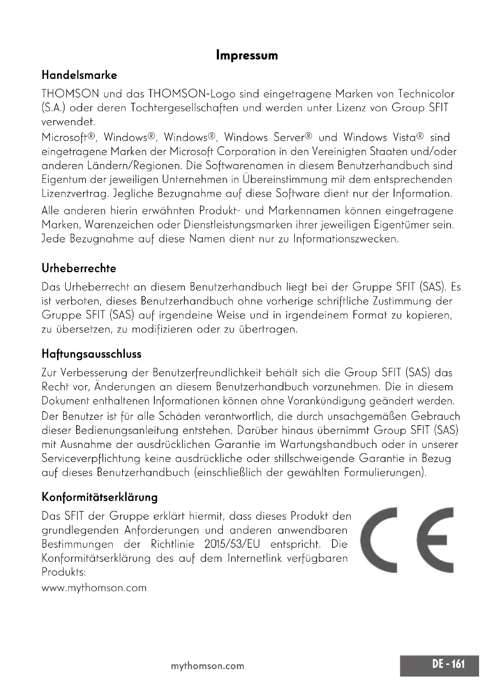 mythomson.com Impressum Handelsmarke THOMSON und das THOMSON-Logo sind eingetragene Marken von Technicolor (S.A.) oder deren Tochtergesellschaften und werden unter Lizenz von Group SFIT verwendet. Microsoft®, Windows®, Windows®, Windows Server® und Windows Vista® sind eingetragene Marken der Microsoft Corporation in den Vereinigten Staaten und/oder anderen Ländern/Regionen. Die Softwarenamen in diesem Benutzerhandbuch sind Eigentum der jeweiligen Unternehmen in Übereinstimmung mit dem entsprechenden Lizenzvertrag. Jegliche Bezugnahme auf diese Software dient nur der Information. Alle anderen hierin erwähnten Produkt- und Markennamen können eingetragene Marken, Warenzeichen oder Dienstleistungsmarken ihrer jeweiligen Eigentümer sein. Jede Bezugnahme auf diese Namen dient nur zu Informationszwecken. Urheberrechte Das Urheberrecht an diesem Benutzerhandbuch liegt bei der Gruppe SFIT (SAS). Es ist verboten, dieses Benutzerhandbuch ohne vorherige schriftliche Zustimmung der Gruppe SFIT (SAS) auf irgendeine Weise und in irgendeinem Format zu kopieren, zu übersetzen, zu modizieren oder zu übertragen. Haftungsausschluss Zur Verbesserung der Benutzerfreundlichkeit behält sich die Group SFIT (SAS) das Recht vor, Änderungen an diesem Benutzerhandbuch vorzunehmen. Die in diesem Dokument enthaltenen Informationen können ohne Vorankündigung geändert werden. Der Benutzer ist für alle Schäden verantwortlich, die durch unsachgemäßen Gebrauch dieser Bedienungsanleitung entstehen. Darüber hinaus übernimmt Group SFIT (SAS) mit Ausnahme der ausdrücklichen Garantie im Wartungshandbuch oder in unserer Serviceverpichtung keine ausdrückliche oder stillschweigende Garantie in Bezug auf dieses Benutzerhandbuch (einschließlich der gewählten Formulierungen). Konformitätserklärung Das SFIT der Gruppe erklärt hiermit, dass dieses Produkt den grundlegenden Anforderungen und anderen anwendbaren Bestimmungen der Richtlinie 2015/53/EU entspricht. Die Konformitätserklärung des auf dem Internetlink verfügbaren Produkts: www.mythomson.com162 - DE Benutzerhandbuch - Hero - 11.6’’ mythomson.com - Wichtige Sicherheitshinweise - Dieses Gerät sollte in einer Umgebung mit einer Umgebungstemperatur zwischen 5°C (41°F) und 35°C (95°F) eingesetzt werden. Setzen Sie das Gerät weder Regen noch Feuchtigkeit aus und halten Sie es von Flüssigkeiten fern. Wenn Wasser oder andere Flüssigkeiten auf das Gerät spritzen, schalten Sie das Gerät sofort aus und warten Sie, bis es vollständig trocken ist, bevor Sie es wieder einschalten. Setzen Sie das Gerät nicht direkt der Sonneneinstrahlung aus. Verwenden Sie keine starken Lösungsmittel, üssigen Reinigungsmittel oder andere Chemikalien auf oder in der Nähe der Oberäche des Geräts, um Korrosion oder Beschädigung der Oberäche des Geräts zu vermeiden. Setzen Sie die Kamera nicht einer staubigen Umgebung aus. Verwenden Sie das Gerät nicht während eines Gaslecks. Setzen Sie das Gerät keinen starken magnetischen oder elektrischen Feldern aus. Sie können das Gerät über Flughafen-Röntgendetektoren betreiben. Es wird jedoch empfohlen, Ihr Gerät nicht durch die Magnetdetektionsportale zu führen oder es tragbaren Detektoren auszusetzen. Stellen Sie keine Gegenstände auf das Gerät. Stellen Sie das Gerät nicht auf eine unebene oder instabile Fläche. Achten Sie darauf, das Gerät vor Stürzen oder anderen Stößen zu schützen, die es beschädigen könnten. Lassen Sie das Gerät nicht auf Ihrem Schoß oder einem anderen Körperteil liegen oder auf ihn geladen, um die Gefahr von hitzebedingten Verletzungen zu vermeiden. Schalten Sie das Gerät vor dem Transport aus oder bedecken Sie es mit einem Material, das keine optimale Luftzirkulation zulässt. Verwenden Sie keine beschädigten Netzkabel, Zubehör oder andere Geräte mit Ihrem Gerät. Wir empfehlen die ausschließliche Verwendung des mitgelieferten Zubehörs (Netzteil, Kabel usw.).DE - 163 mythomson.com Verwenden Sie nur Originalbatterien. Das Ersetzen der Batterie durch eine falsche Batterie kann zu einer Explosion führen. Demontieren, modizieren oder reparieren Sie das Gerät nicht selbst, da dies zum Erlöschen der Garantie führen kann. Bitte sichern Sie Ihre wichtigen Inhalte regelmäßig, um Datenverlust zu vermeiden. Unser Unternehmen übernimmt keine Verantwortung für den Verlust oder die Entfernung von Gegenständen, die im Gerät enthalten sind, aufgrund von unsachgemäßem Gebrauch der Hard- oder Software, mangelnder Wartung oder eines anderen zufälligen Ereignisses. Demontieren, modizieren oder reparieren Sie das Gerät nicht selbst, da dies zum Erlöschen der Garantie führen kann. Bitte sichern Sie Ihre wichtigen Inhalte regelmäßig, um Datenverlust zu vermeiden. Unser Unternehmen übernimmt keine Verantwortung für den Verlust oder die Entfernung von Gegenständen, die im Gerät enthalten sind, aufgrund von unsachgemäßem Gebrauch der Hard- oder Software, mangelnder Wartung oder eines anderen zufälligen Ereignisses. Bei voller Lautstärke kann ein längeres Hören des tragbaren Audiogeräts das Gehör des Benutzers beeinträchtigen. Dieses Produkt wurde entwickelt, um ein ordnungsgemäßes Recycling von Teilen und Komponenten zu ermöglichen. Das Symbol für einen durchgestrichenen Müllbehälter auf Rädern zeigt an, dass das Gerät nicht über den Hausmüll entsorgt werden darf. Beachten Sie die örtlichen Vorschriften für die Entsorgung von elektronischen Geräten. Das Symbol für einen durchgestrichenen Müllcontainer zeigt an, dass die Batterie nicht über den Hausmüll entsorgt werden darf. Beachten Sie die örtlichen Vorschriften für die Entsorgung von Batterien.164 - DE Benutzerhandbuch - Hero - 11.6’’ mythomson.com - Presentation of the device - Vorderansicht Linke Ansicht Rechte Ansicht Hinweis : Die Präsentation des Geräts und einige Funktionen können je nach Land, Modell oder Version variieren. Draufsicht Untere Ansicht